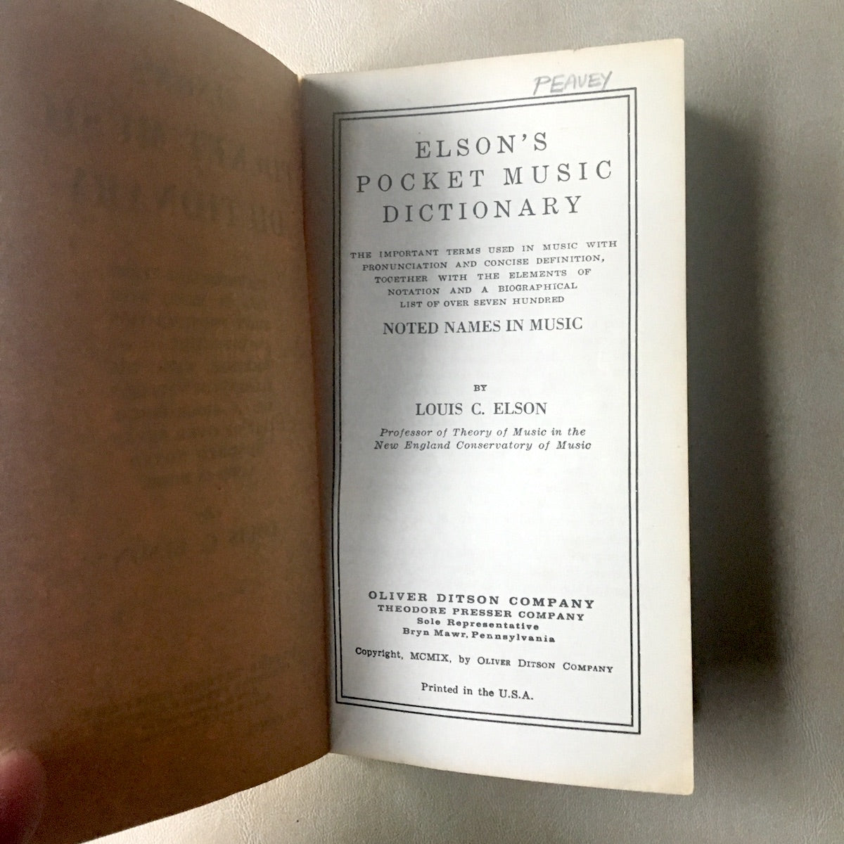 "Elson's Pocket Music Dictionary" by Louis C. Elson. 1909 pocket-sized paperback. Oliver Ditson Company.