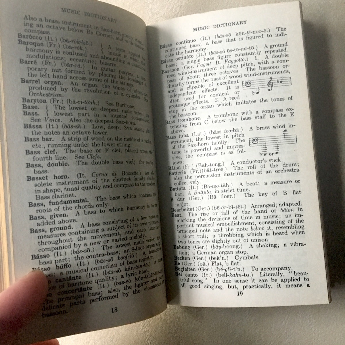 From the cover: "The important terms used in music with their pronunciation and definition together with the elements of notation and a biographical list of over seven hundred noted names in music."