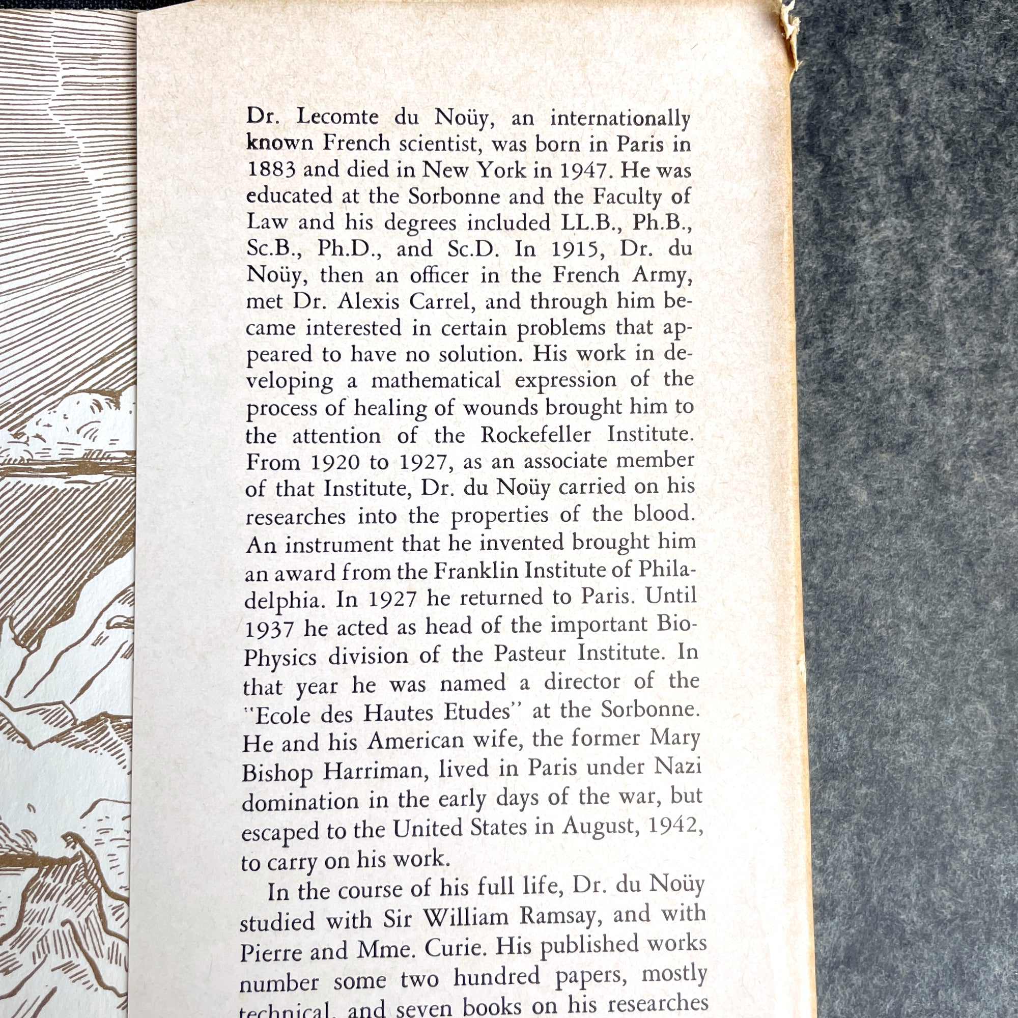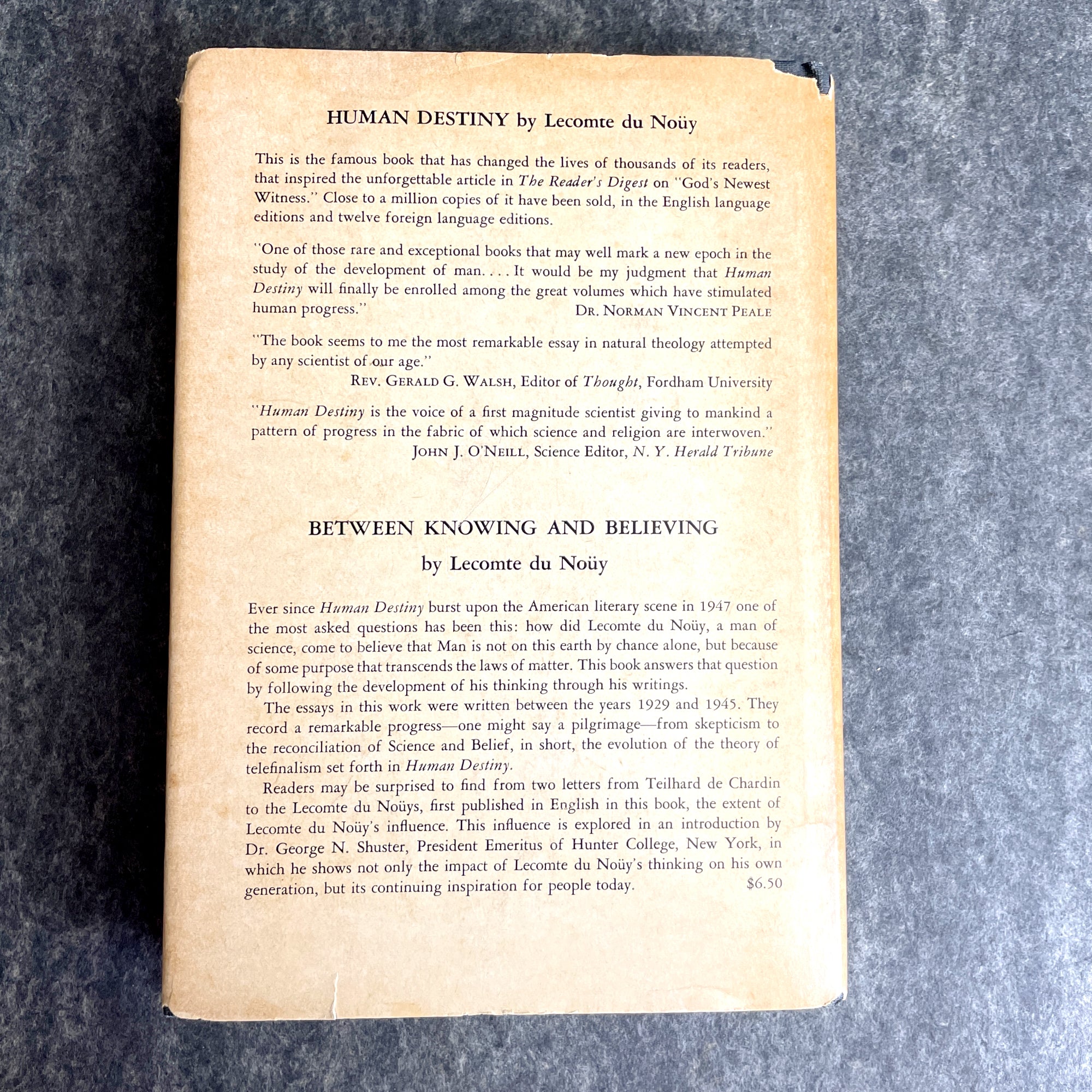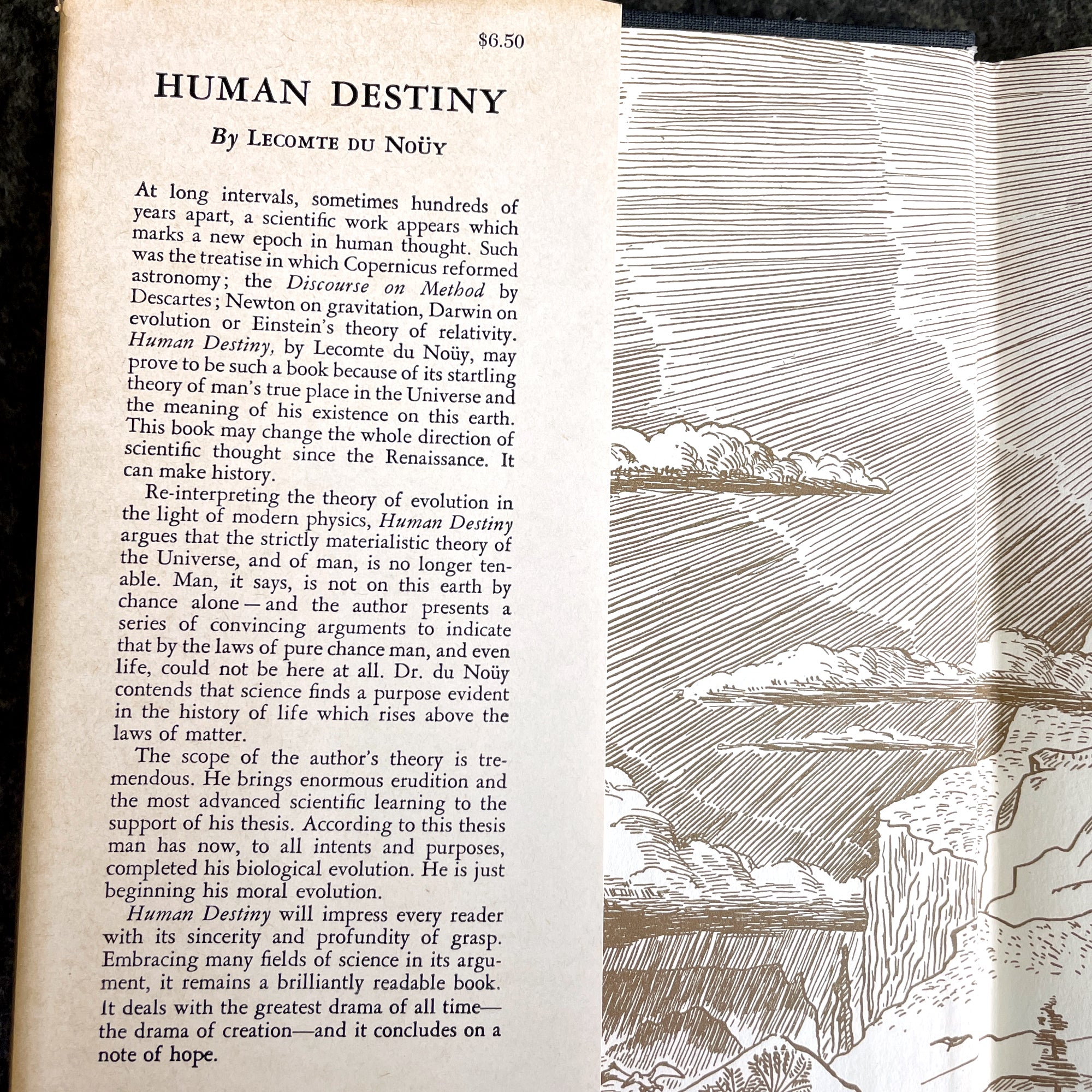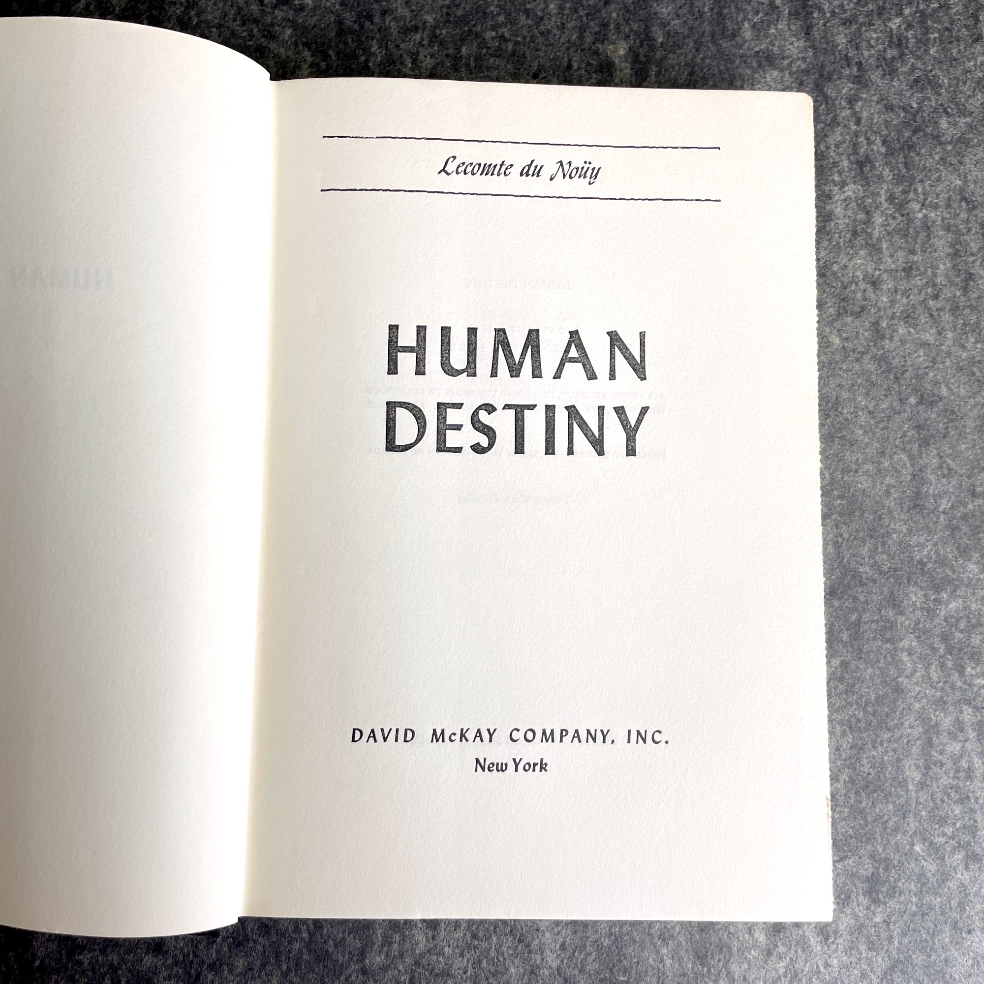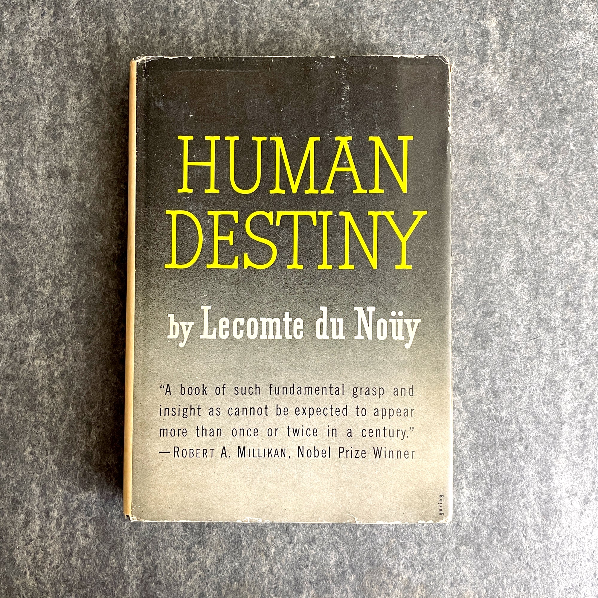 "Human Destiny" by Pierre Lecompte Du Noüy. 1947 hardcover with dust jacket. 26th printing. David McKay Company, publisher. Deckle edge pages.