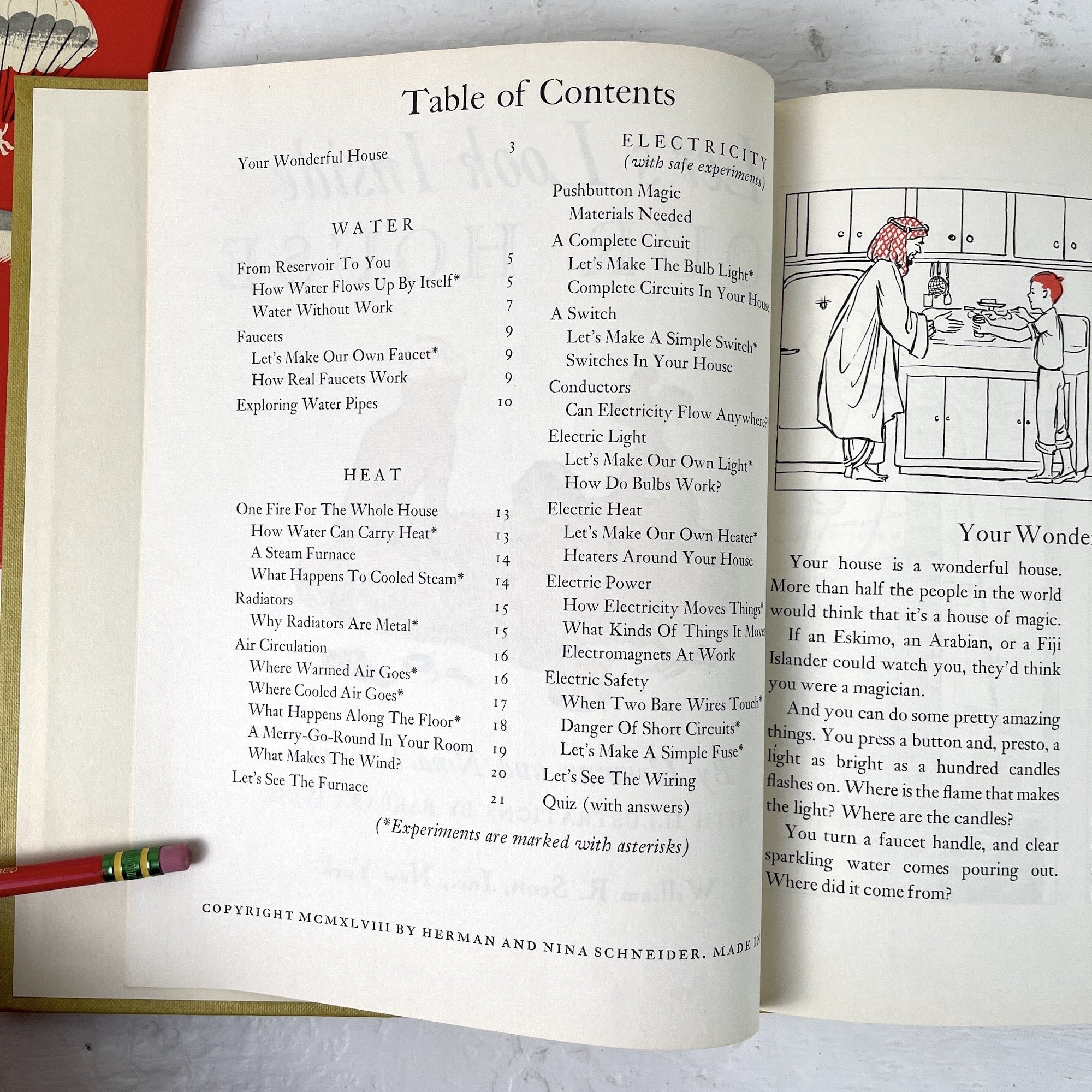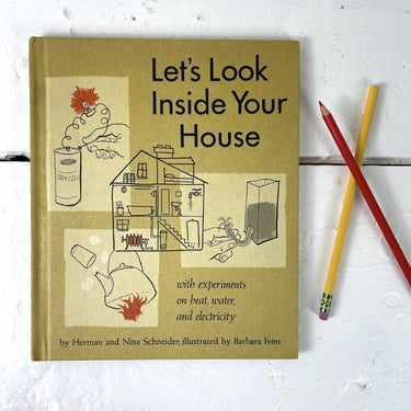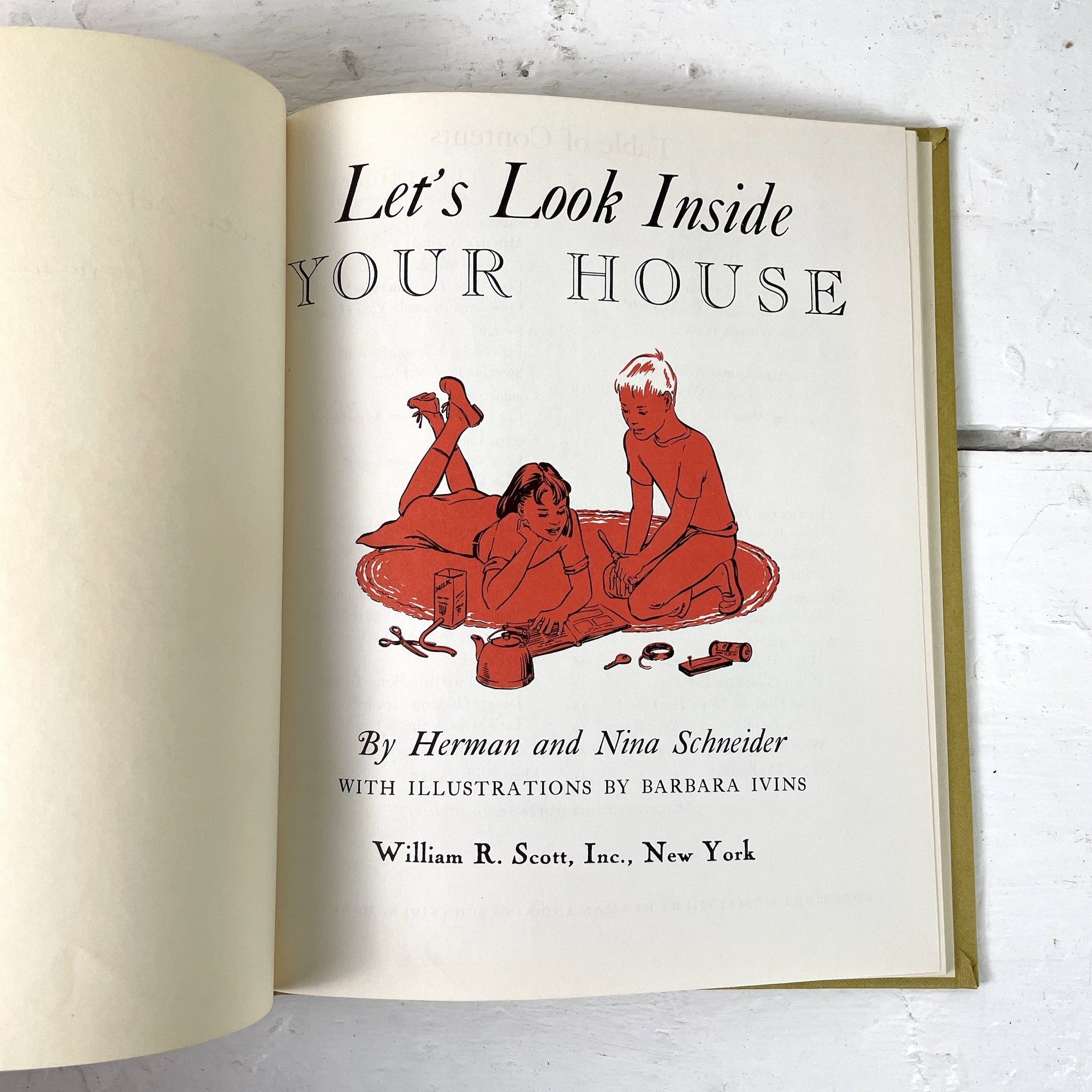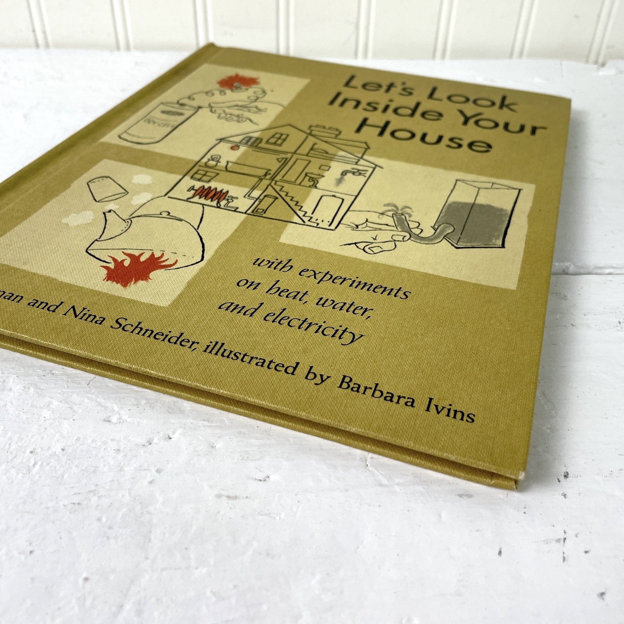 "Let's Look Inside Your House: with experiments on heat, water and electricity" by Herman and Nina Schneider. Illustrated by Barbara Ivins. 1958 first edition, signed by the authors on the flyleaf. William R. Scott, publisher.