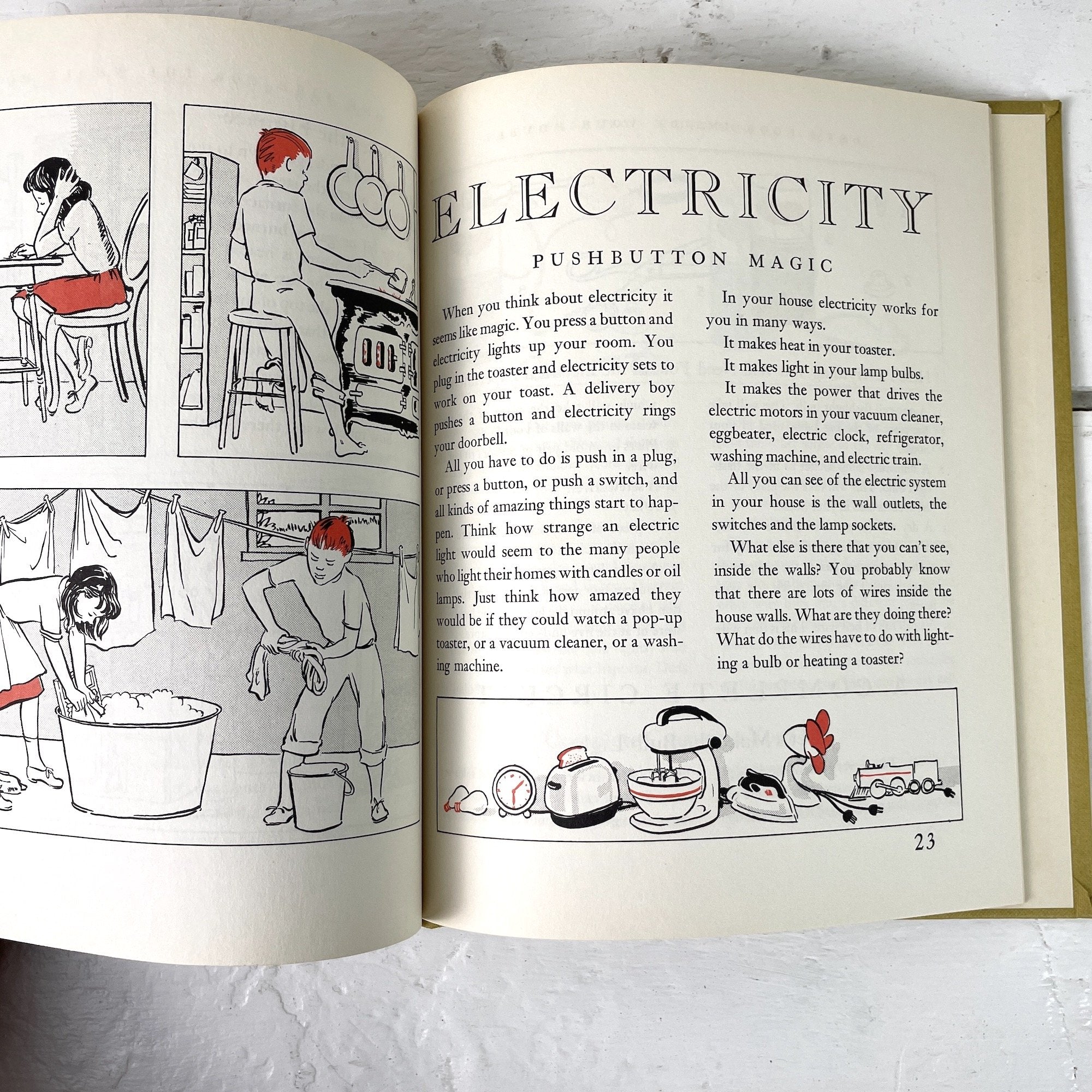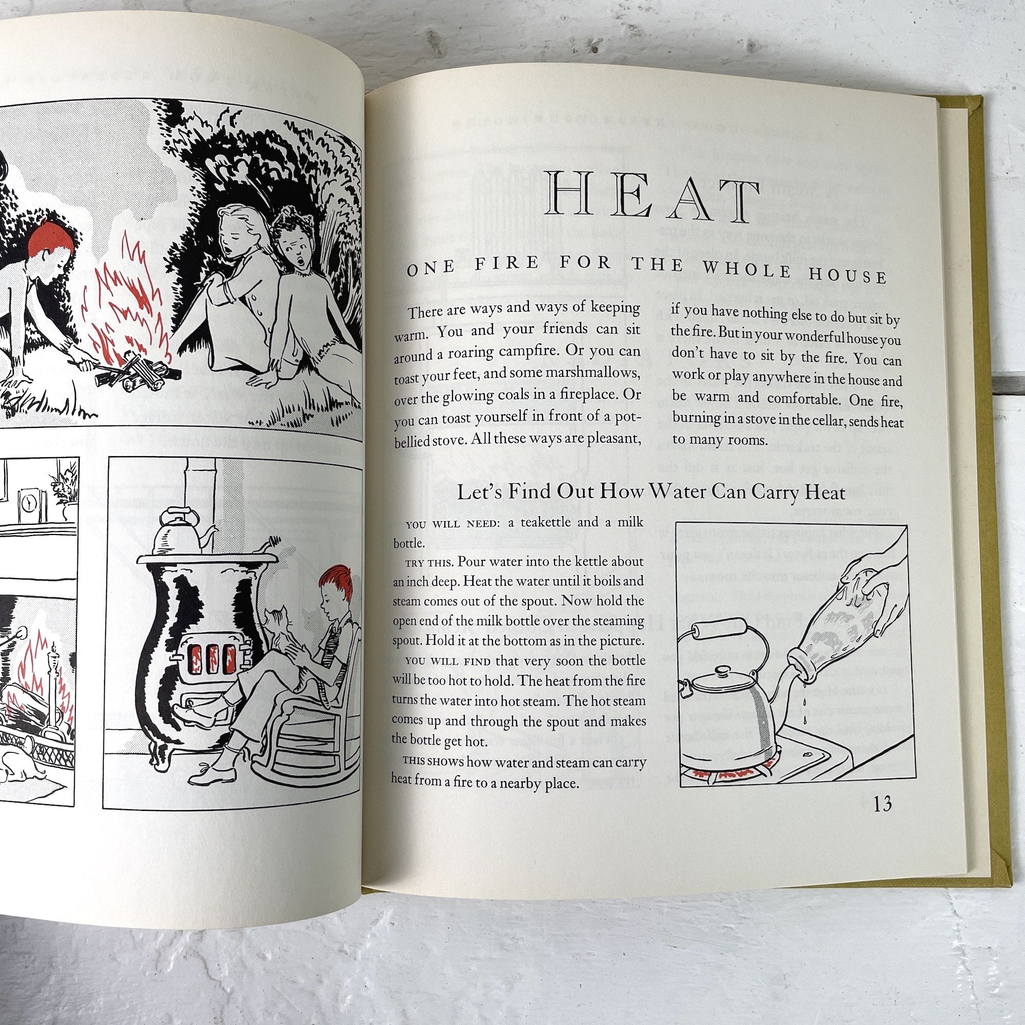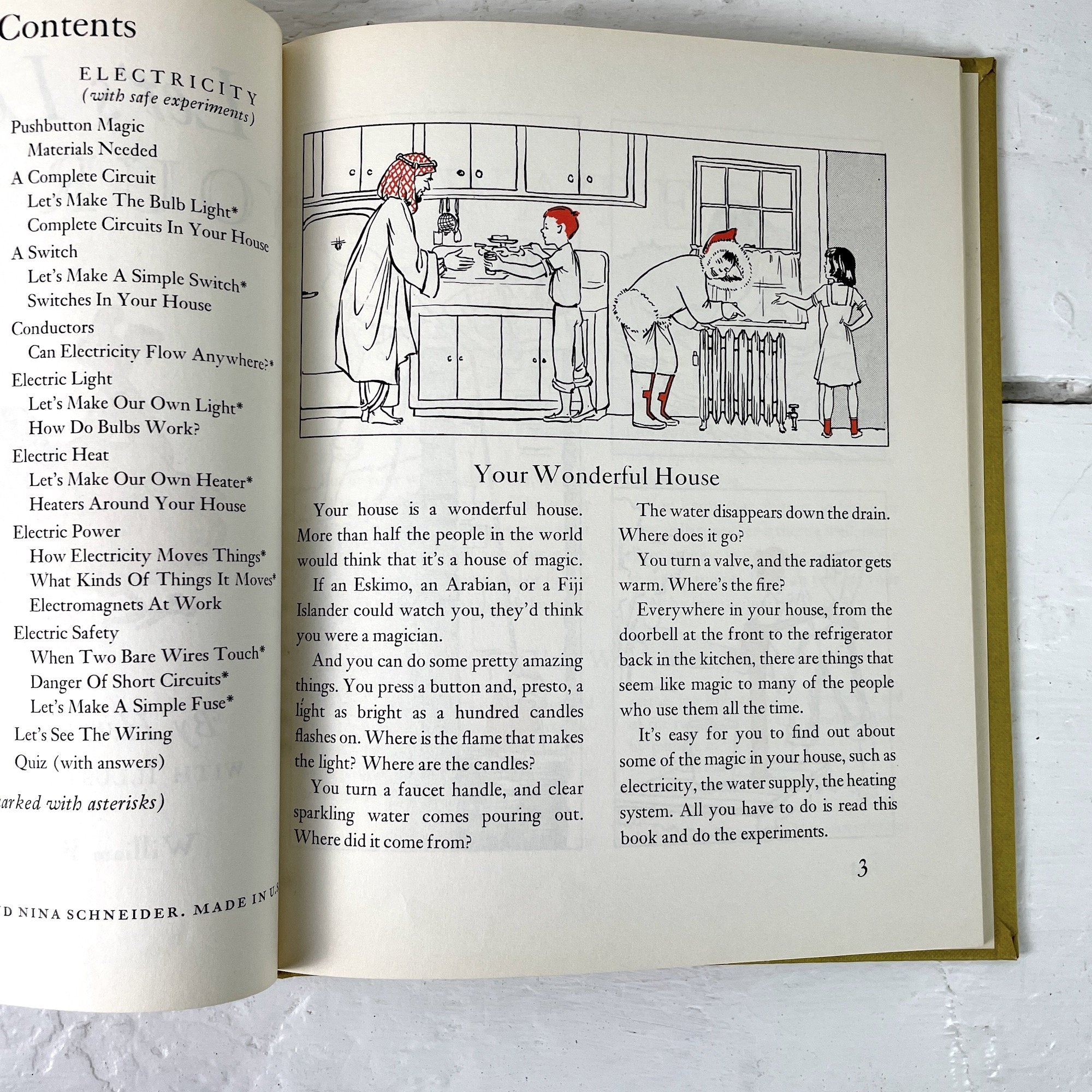 "Let's Look Inside Your House: with experiments on heat, water and electricity" by Herman and Nina Schneider. Illustrated by Barbara Ivins. 1958 first edition, signed by the authors on the flyleaf. William R. Scott, publisher.