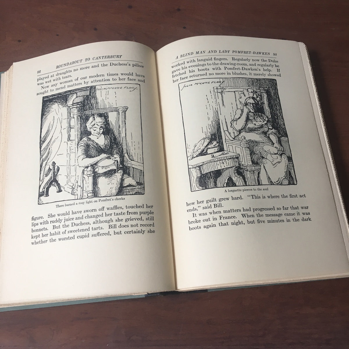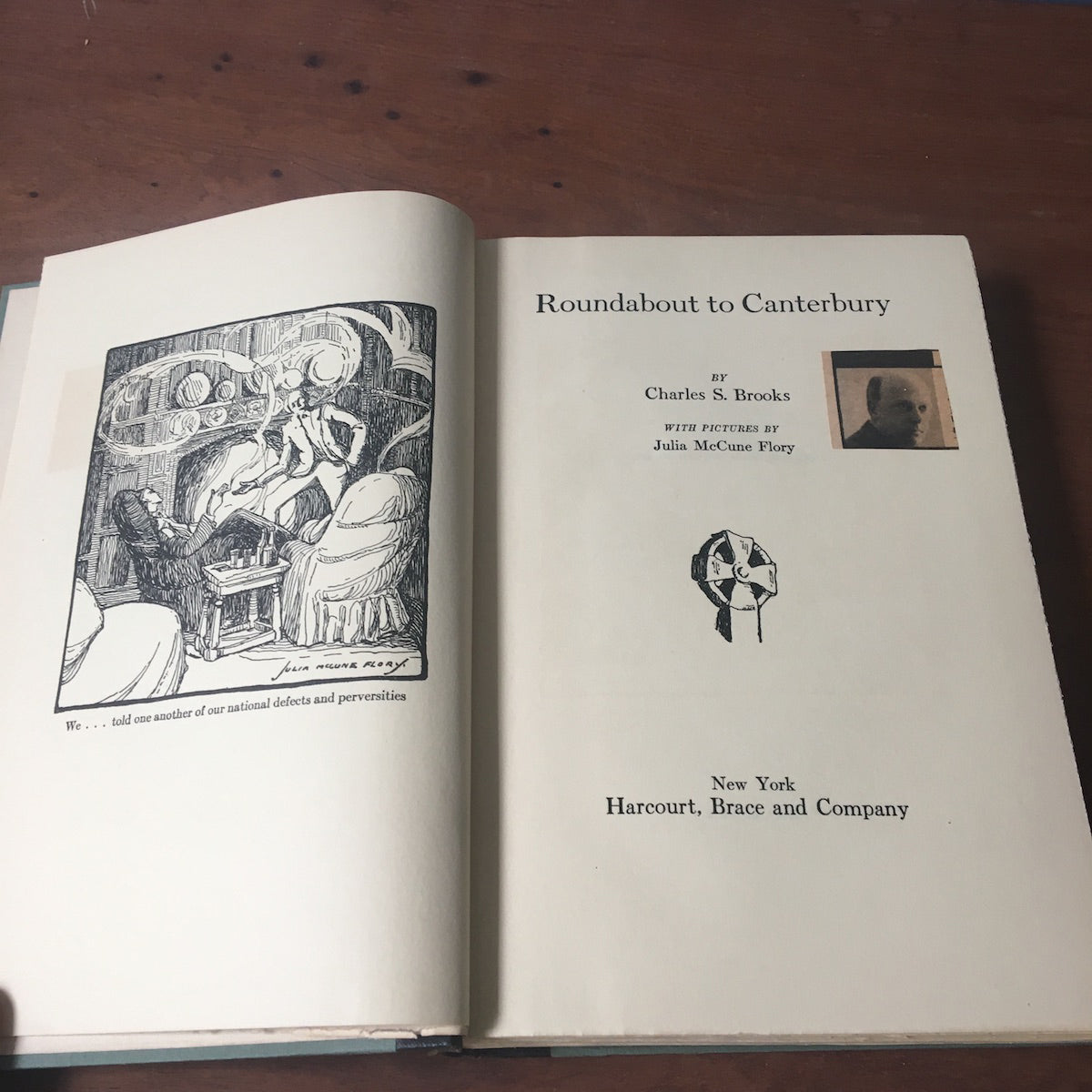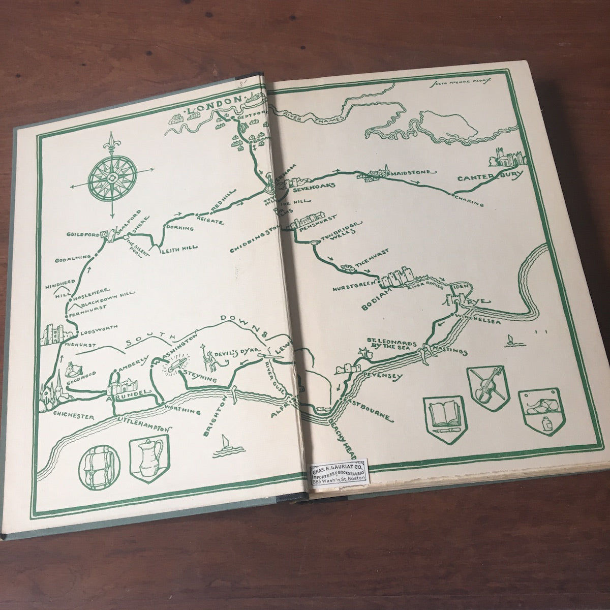 Roundabout to Canterbury by Charles S. Brooks. Illustrated by Julia McCune Flory. Paper wrapped hardcover with fabric spine. Paper label on spine. Harcourt, Brace and Company. 1926. Inside cover map has small label from Chas. E. Lauriat Co., Importers & Booksellers, 285 Wash'n St. Boston.