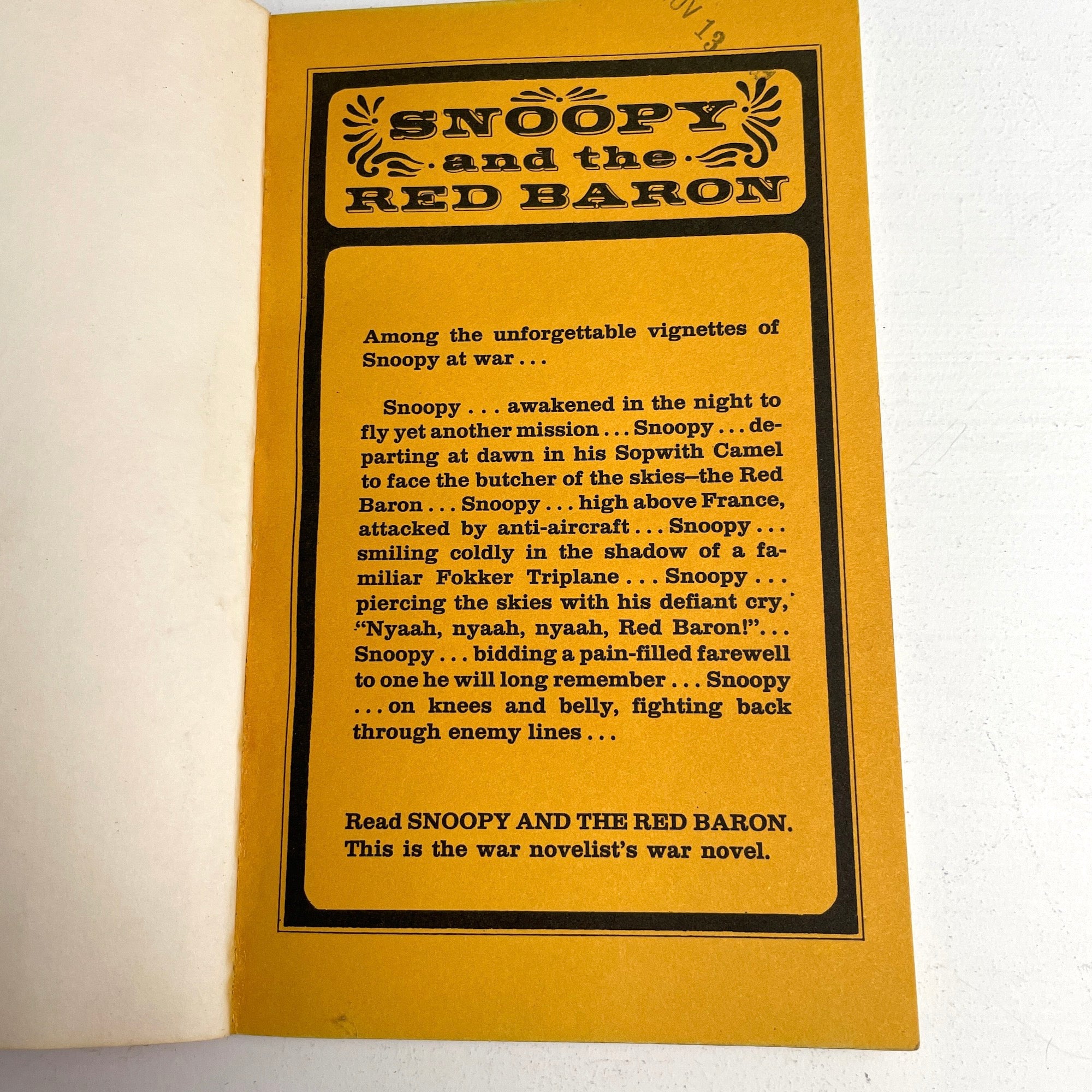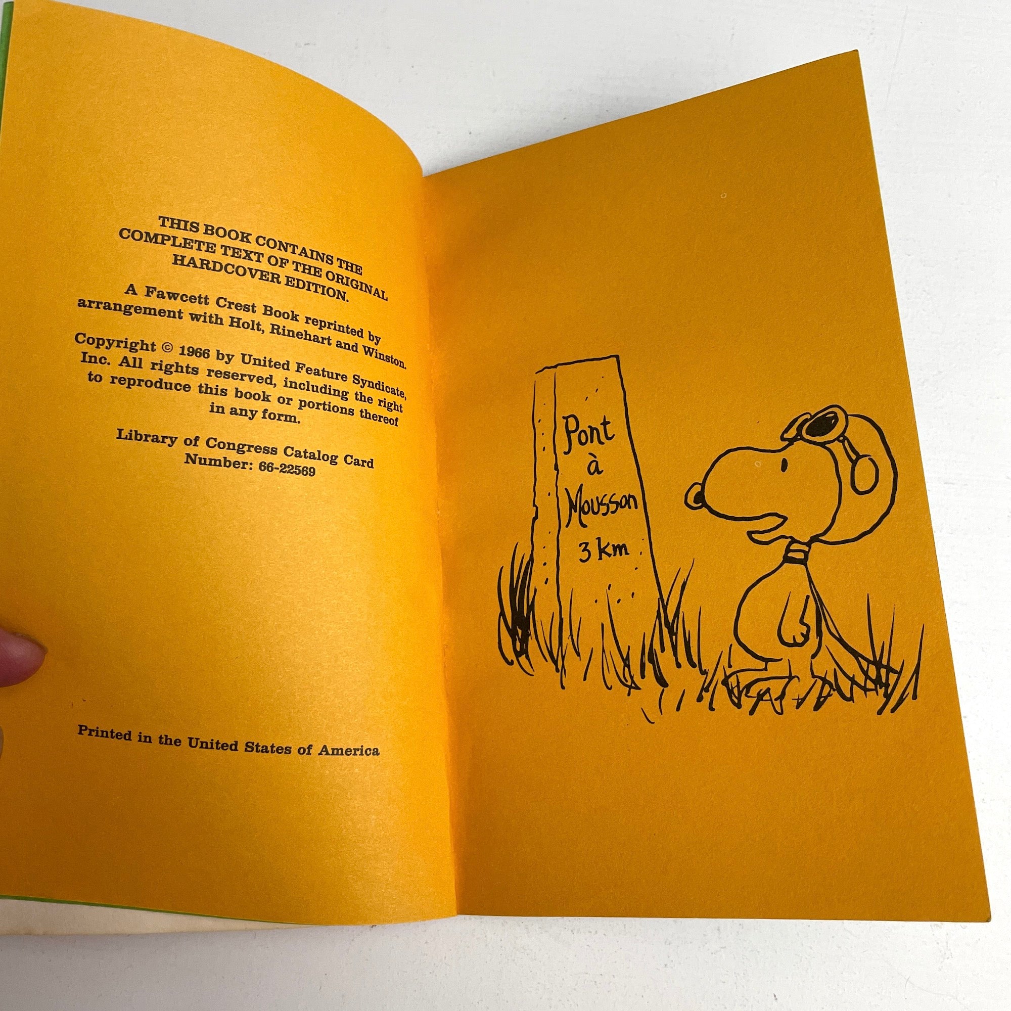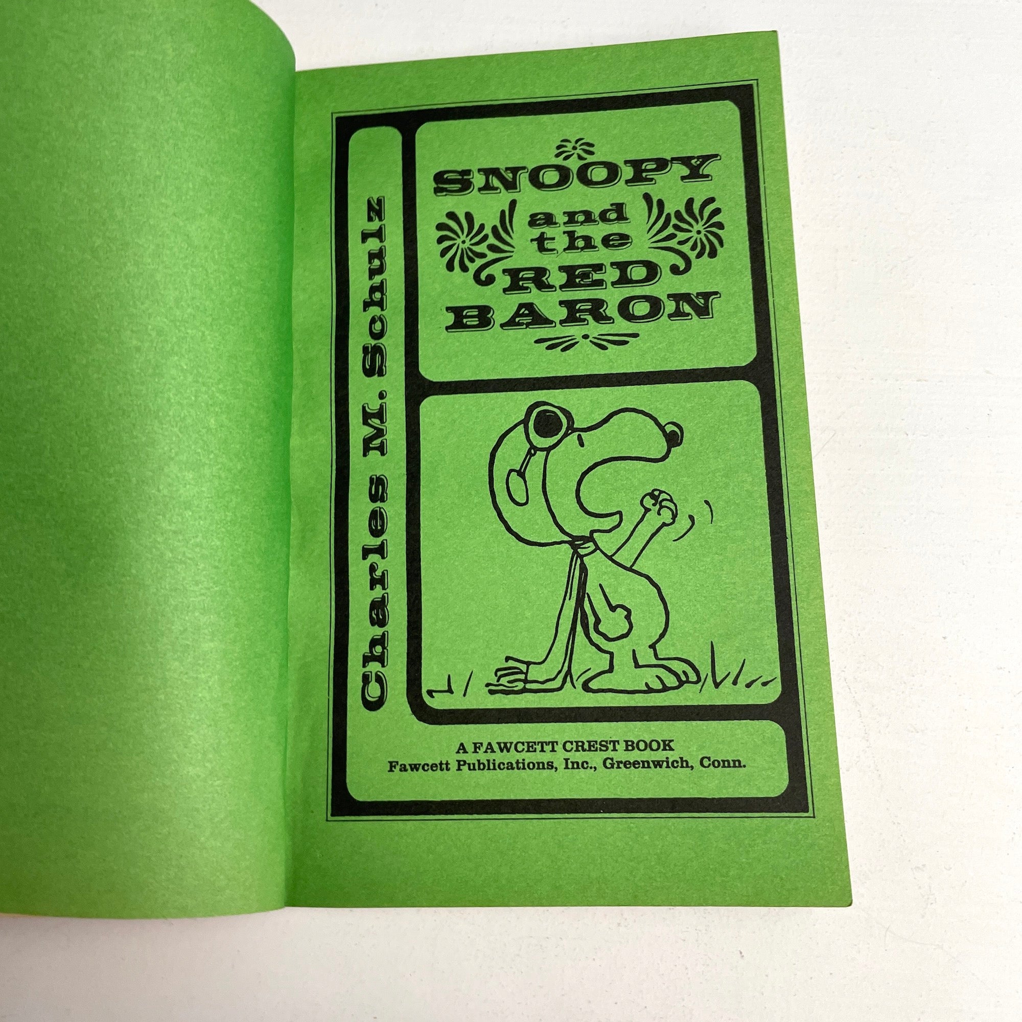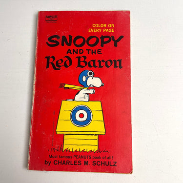 "Snoopy and the Red Baron" by Charles M. Schultz. 1966 paperback. Fawcett Crest. Printed on colored pages. Complete text of the hardcover edition.