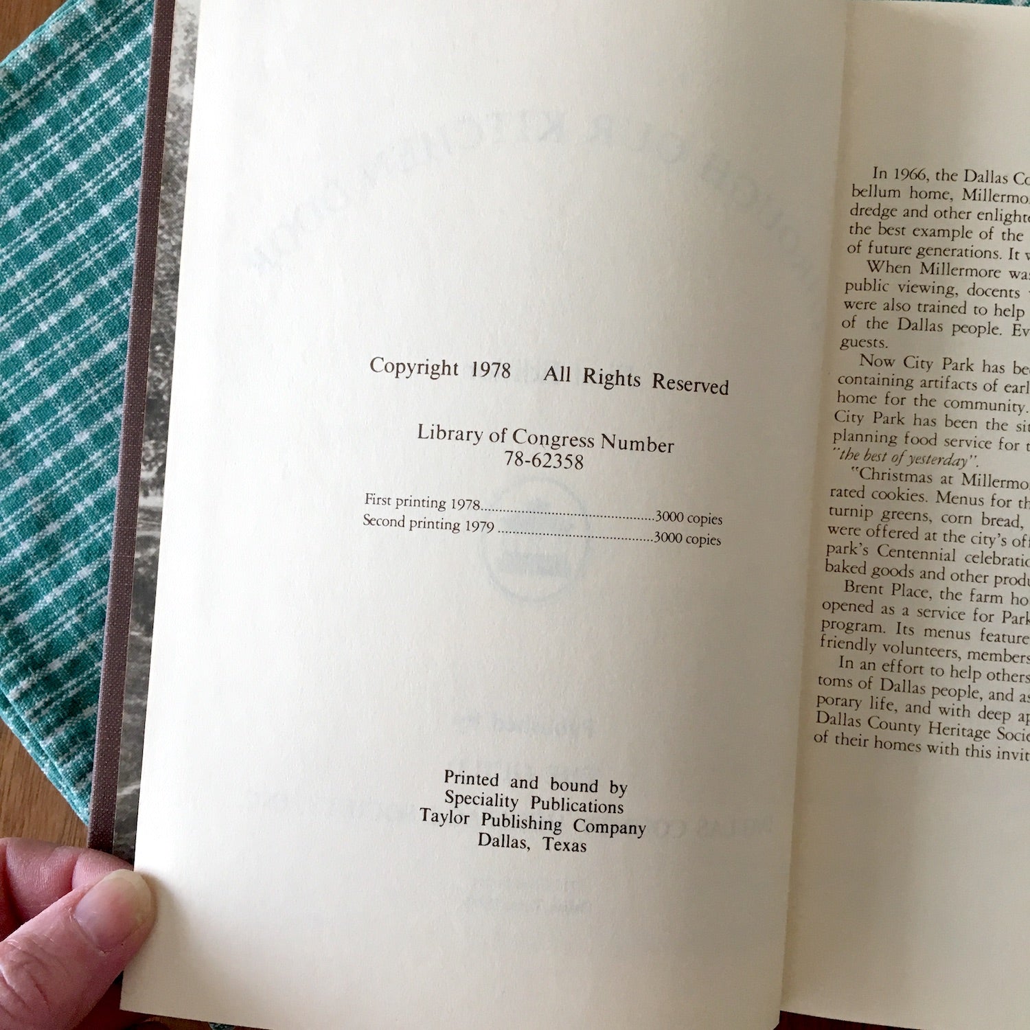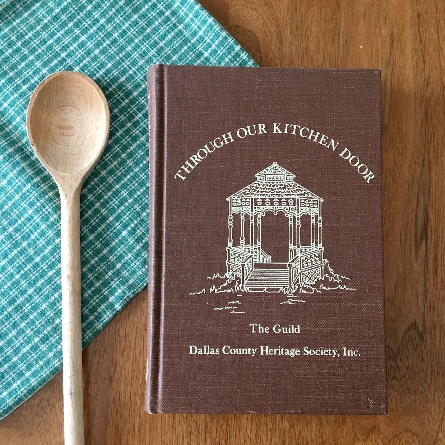"Through Our Kitchen Door" compiled by the Guild of the Dallas County Heritage Society Inc. 1978, second printing, first edition. Brown cloth covered hardcover printed on ivory pages with brown ink.