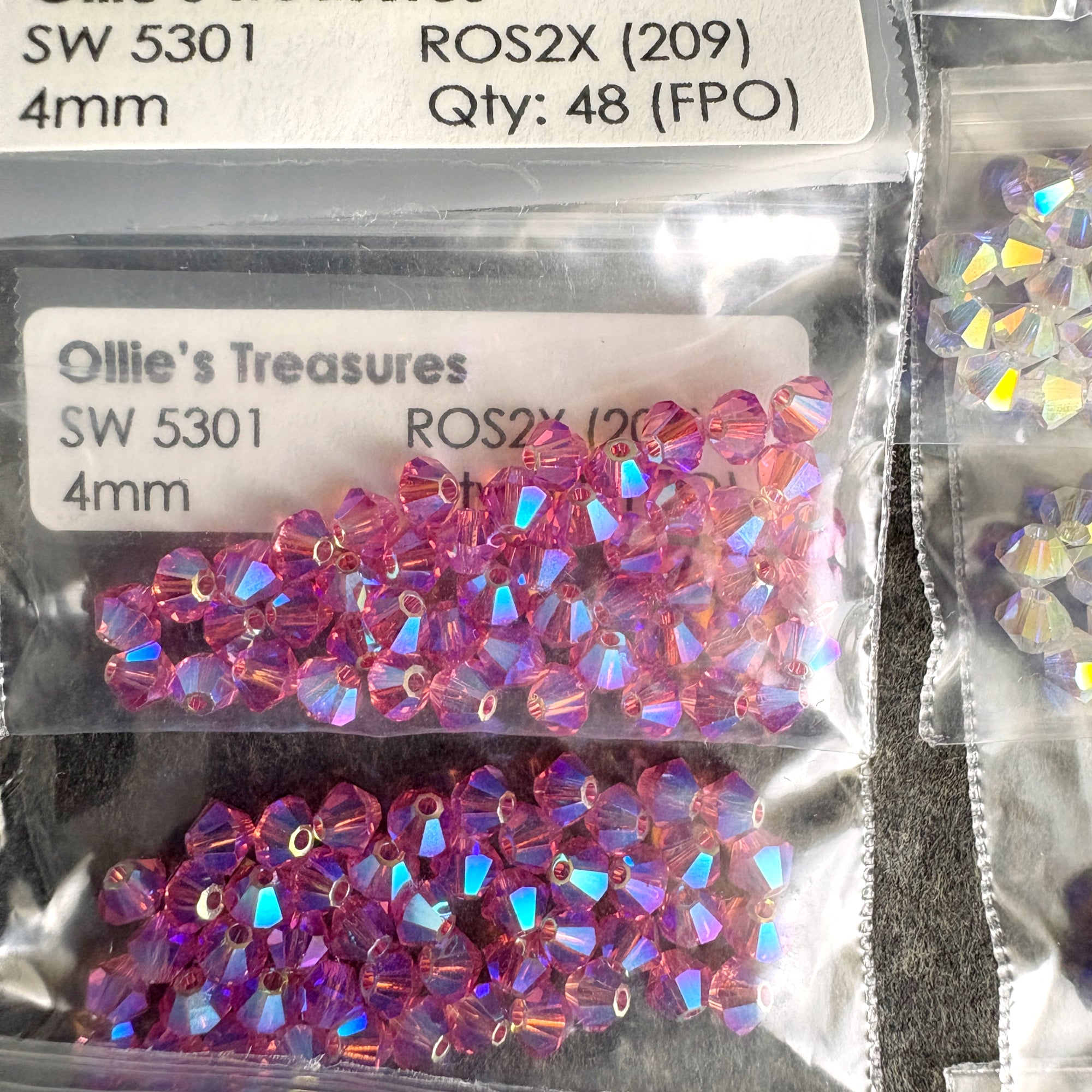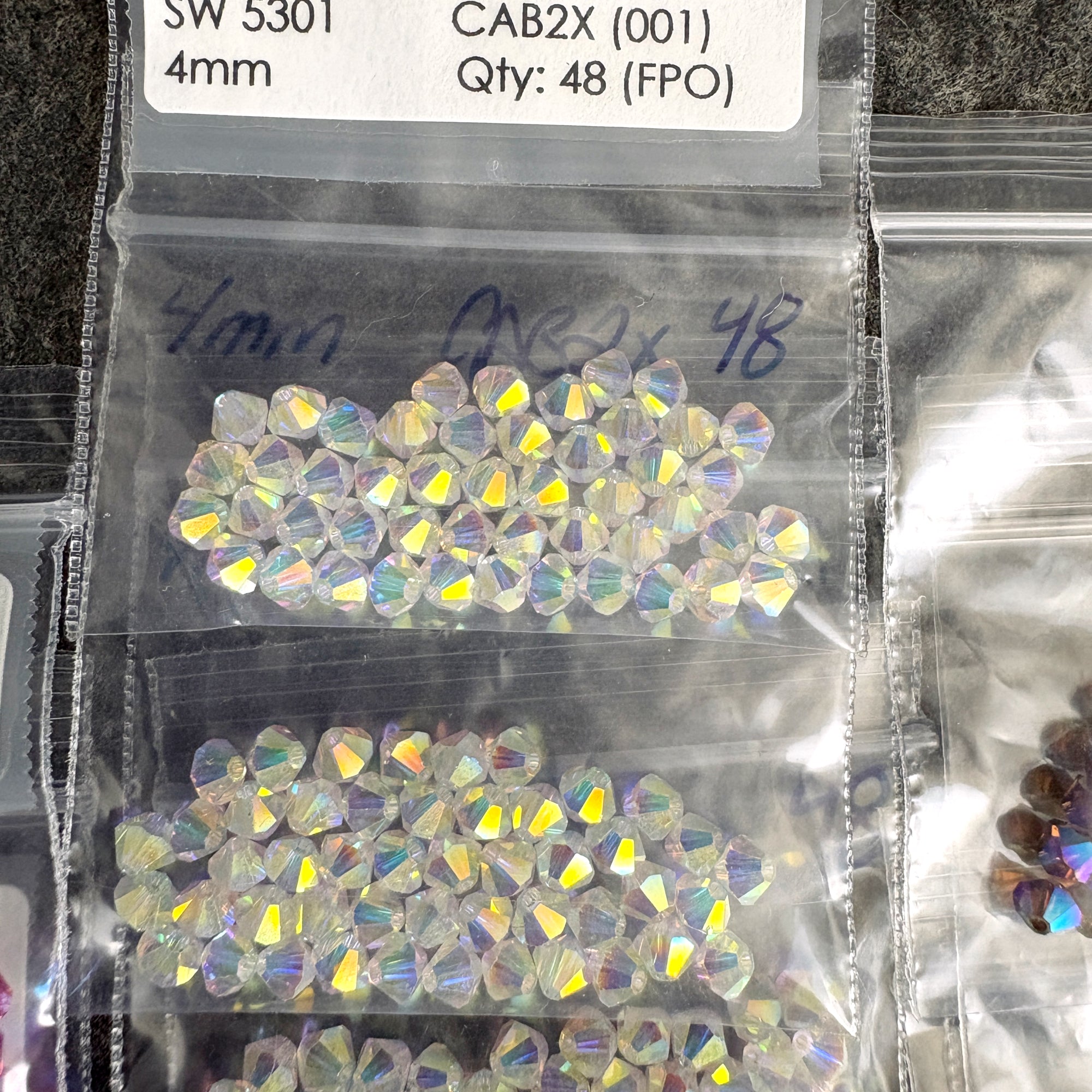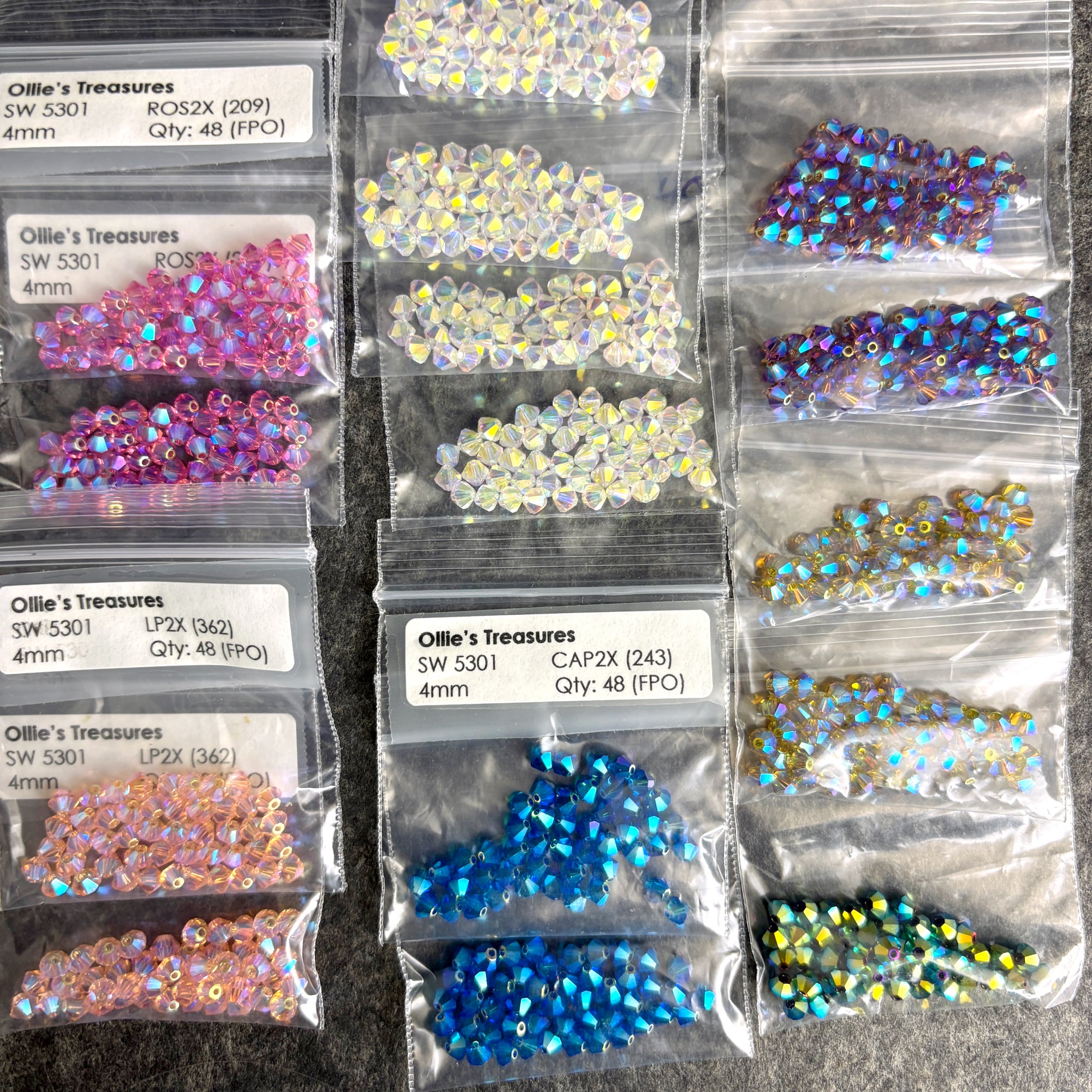 15 bags of Swarovski 4mm bicone crystal beads, 48/bag for a total of 720 beads. Colors included: