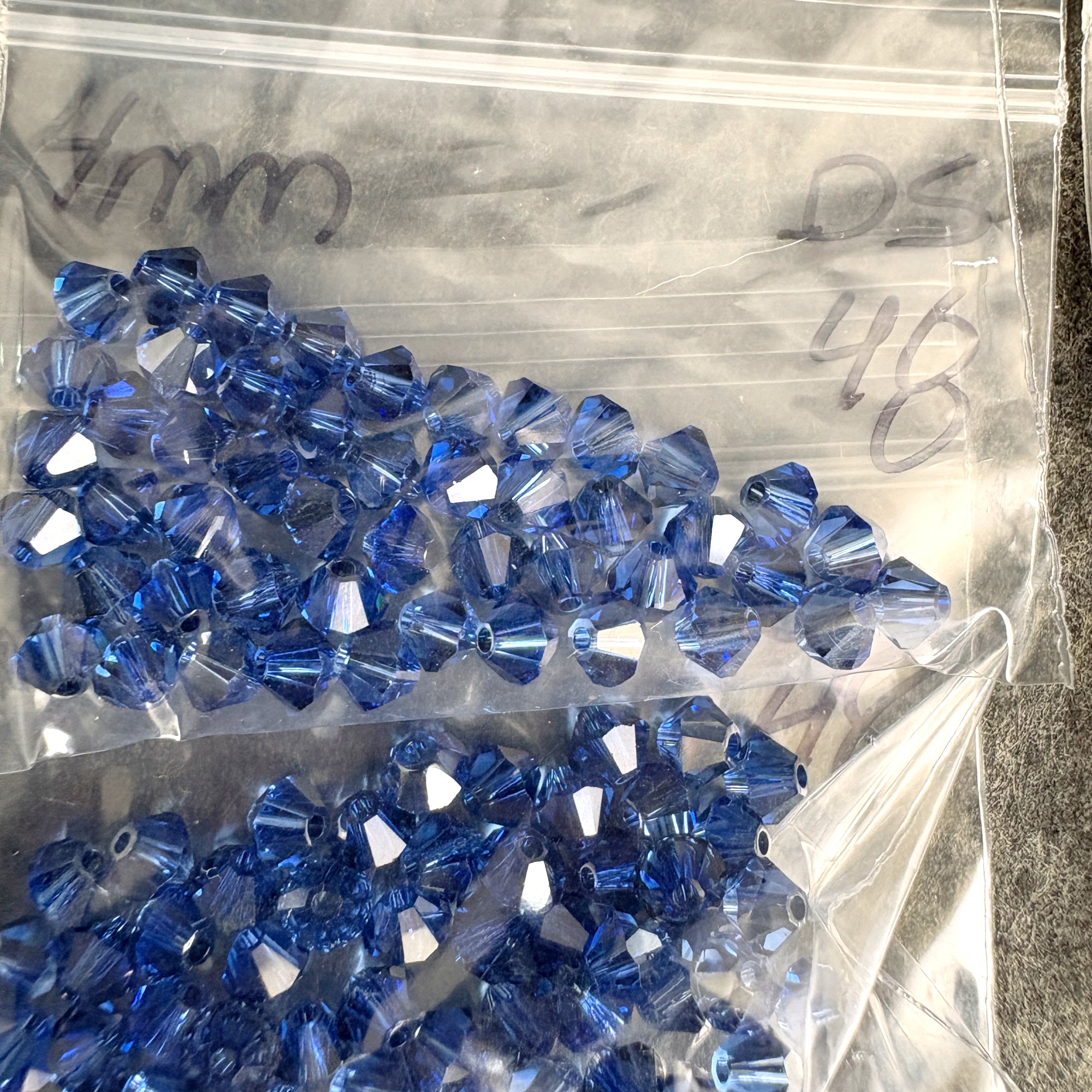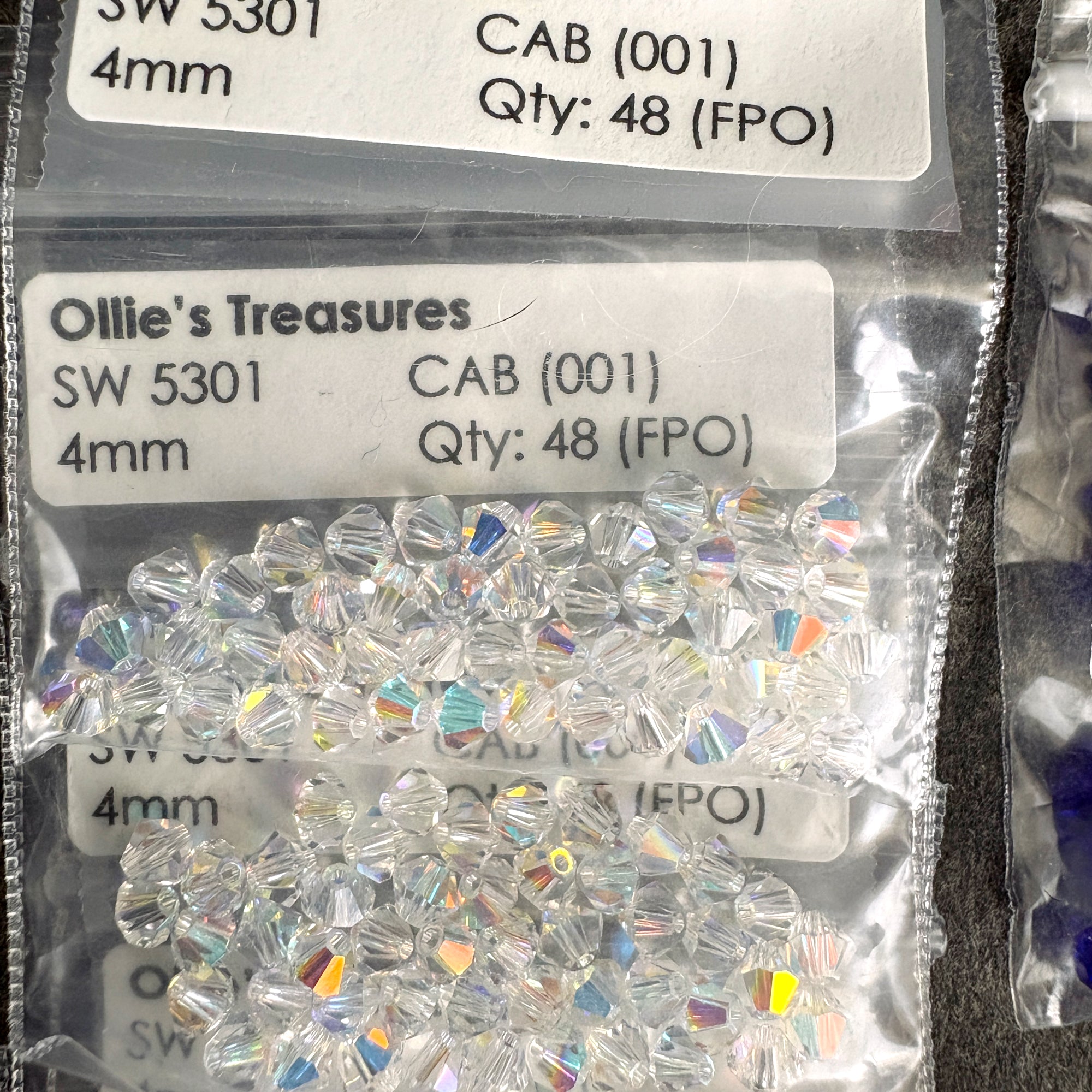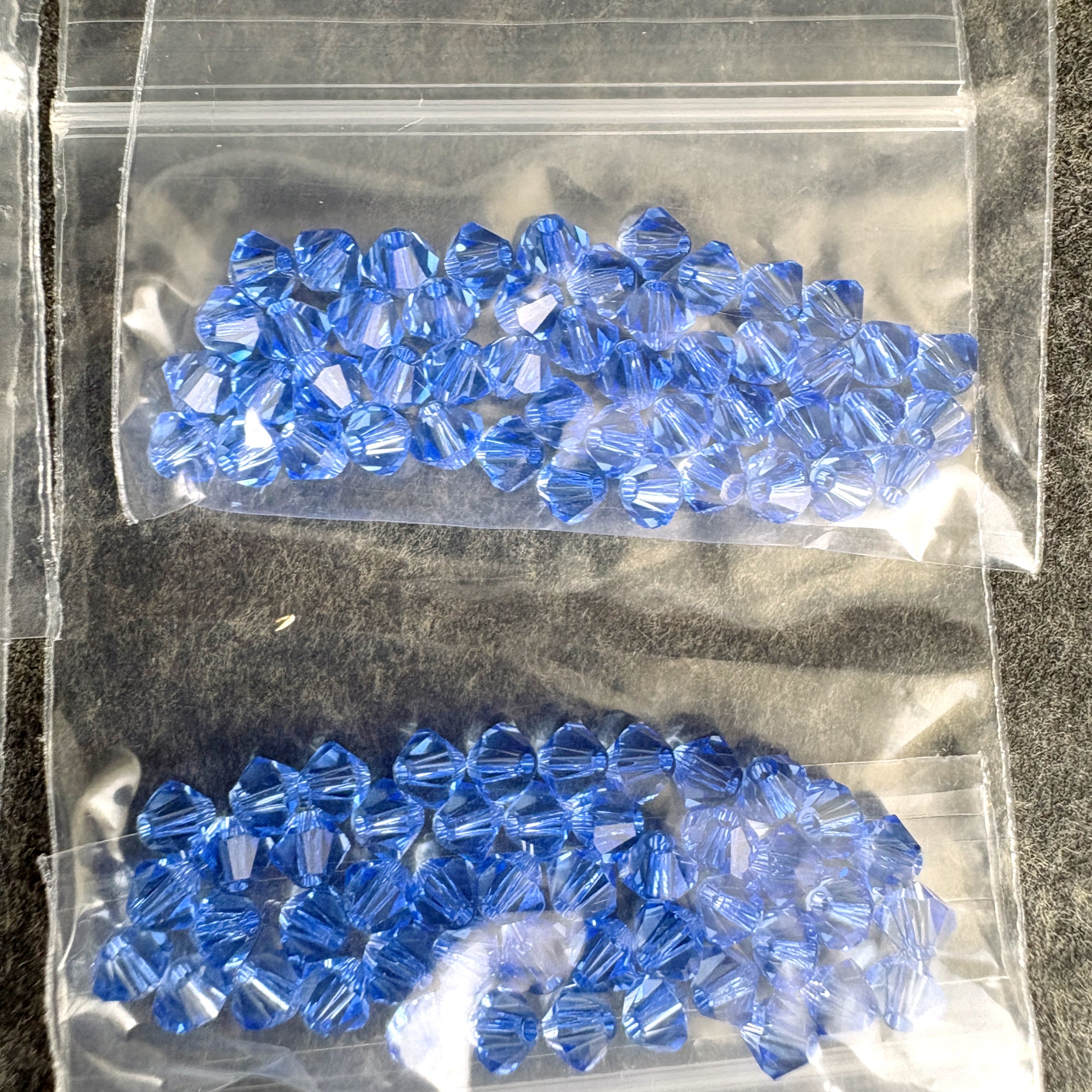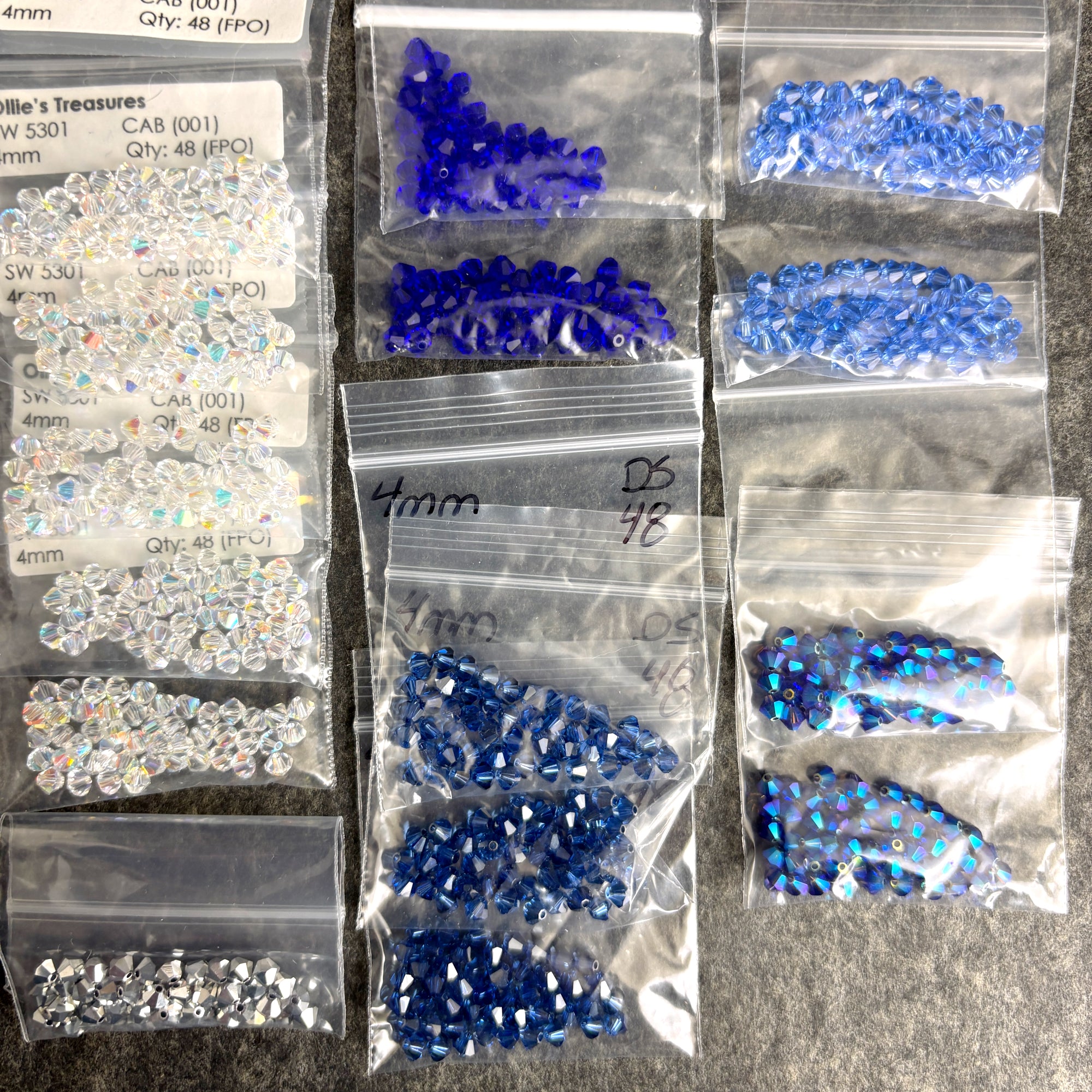 15 bags of Swarovski 4mm bicone crystal beads, 48/bag for a total of 720 beads. Colors included: