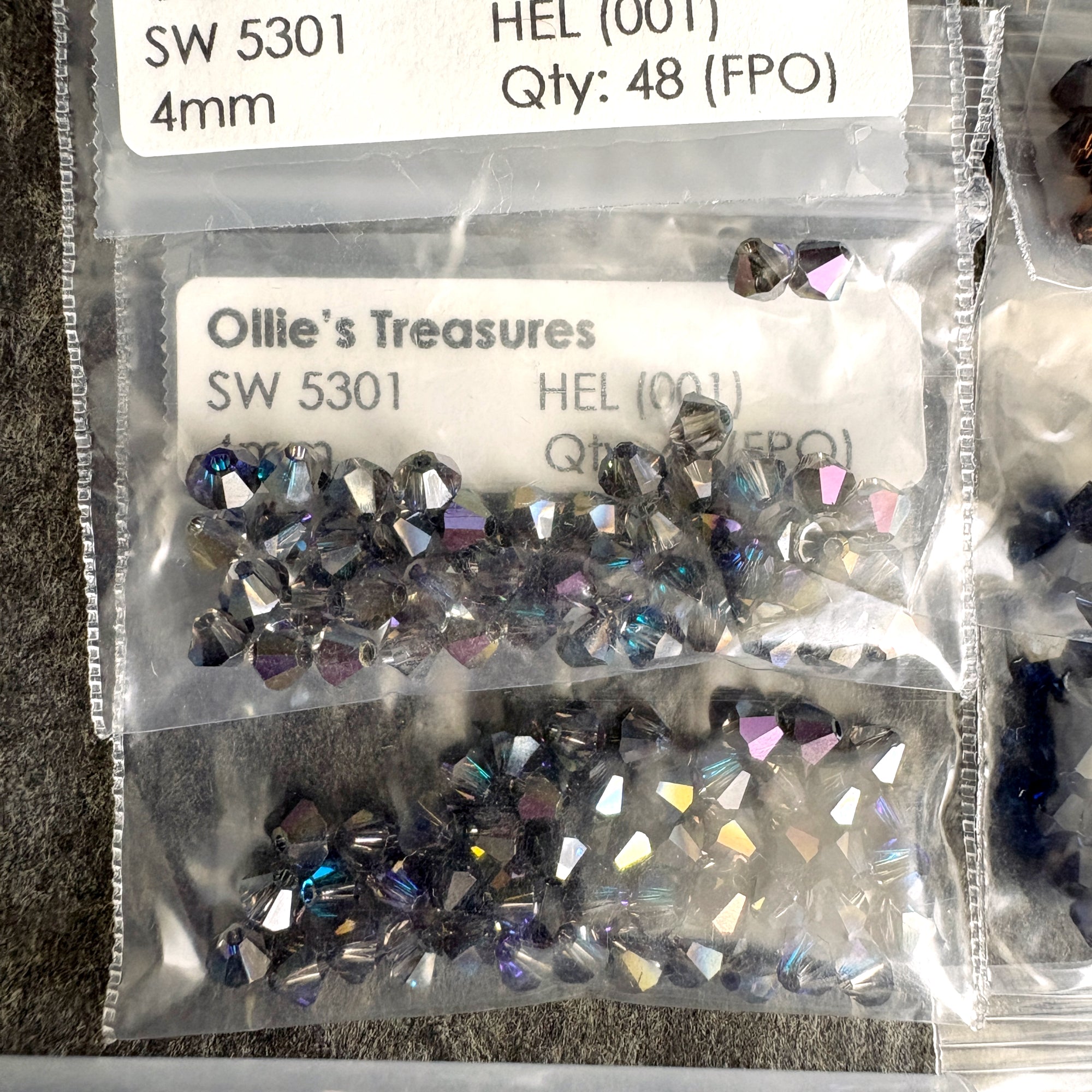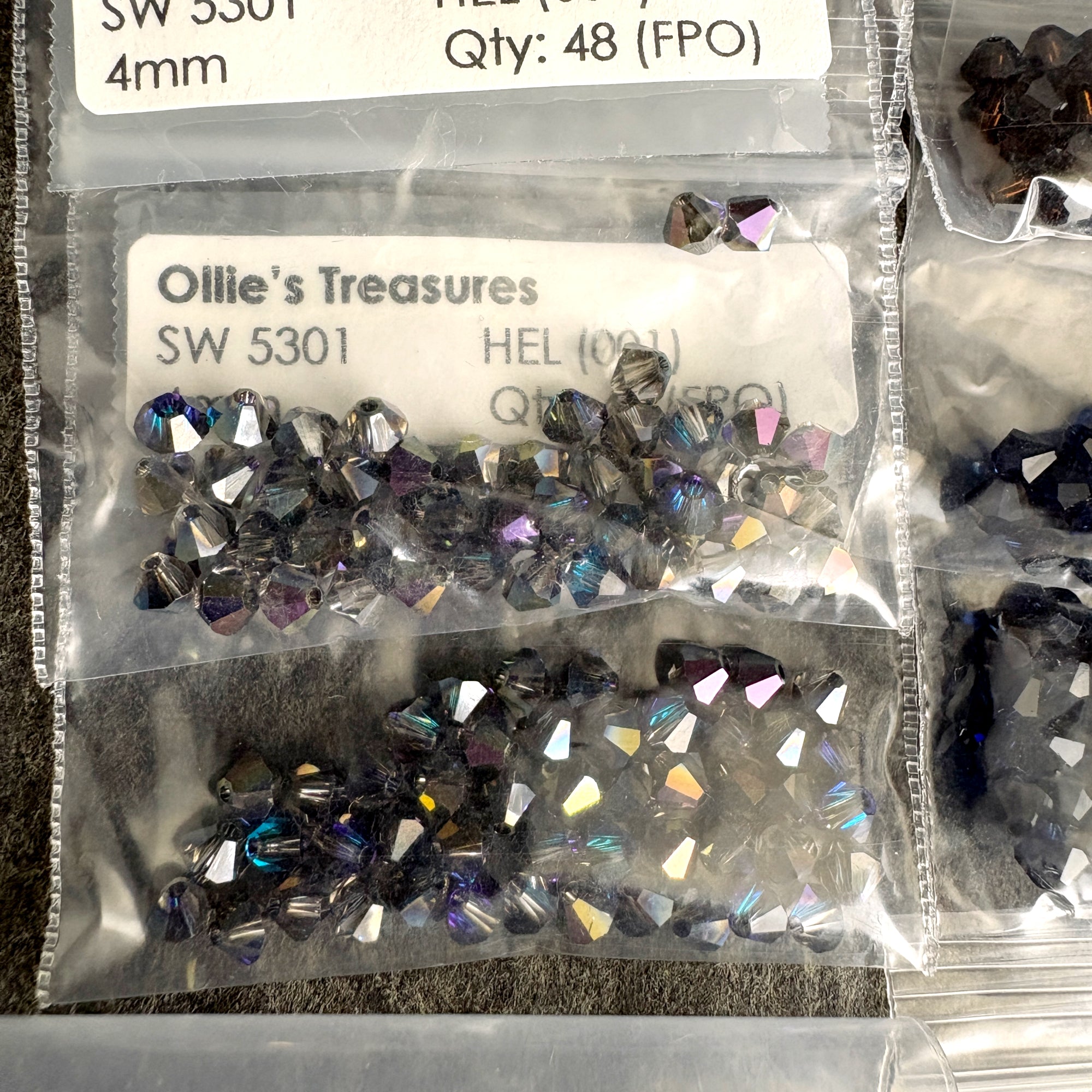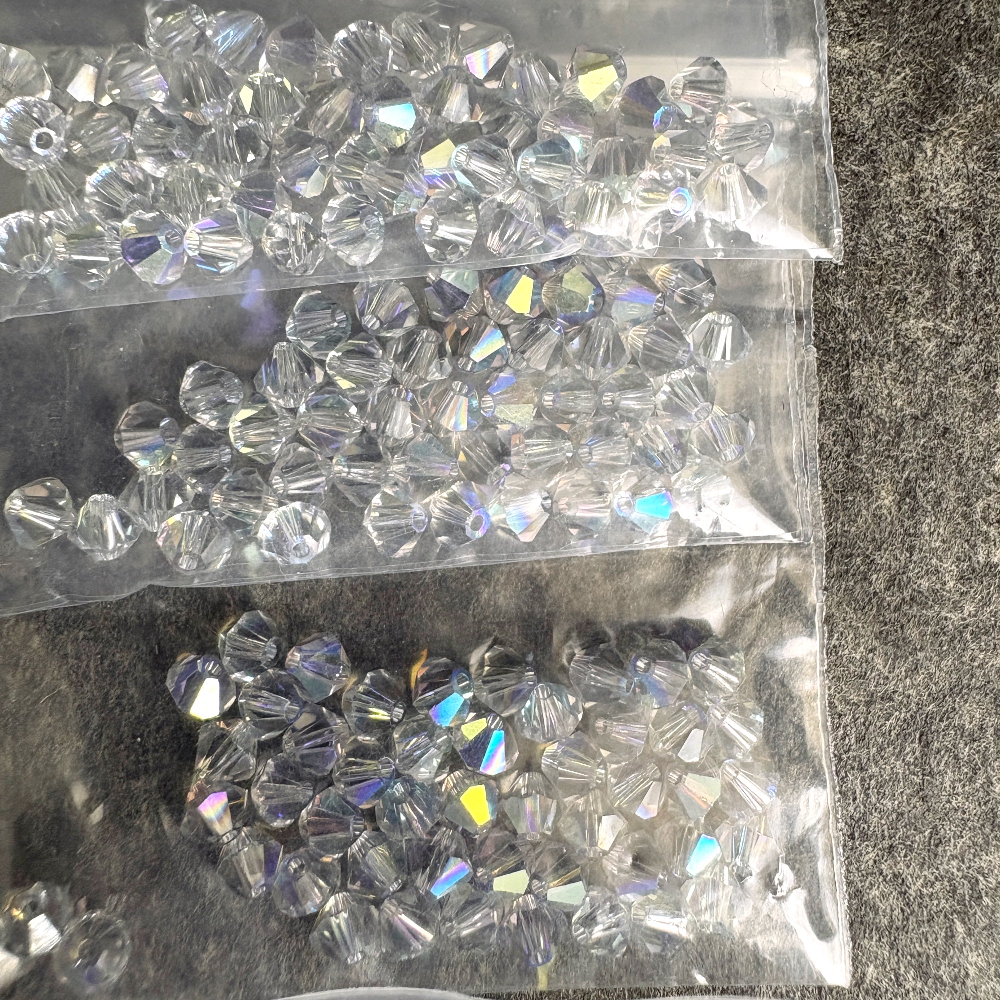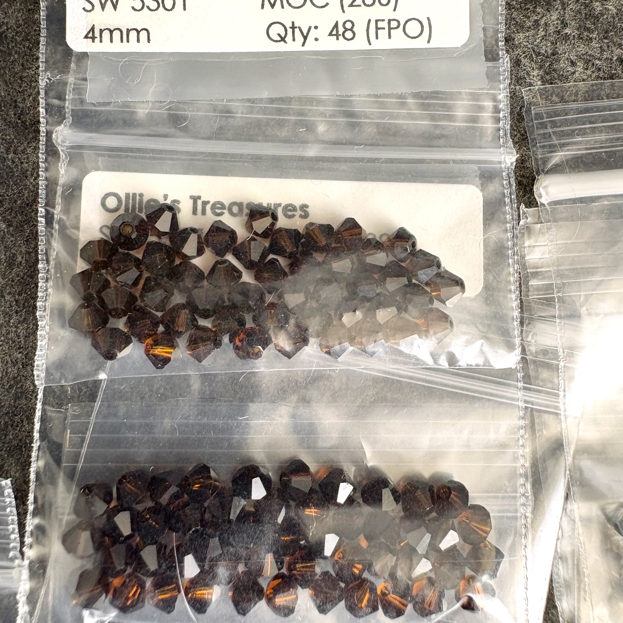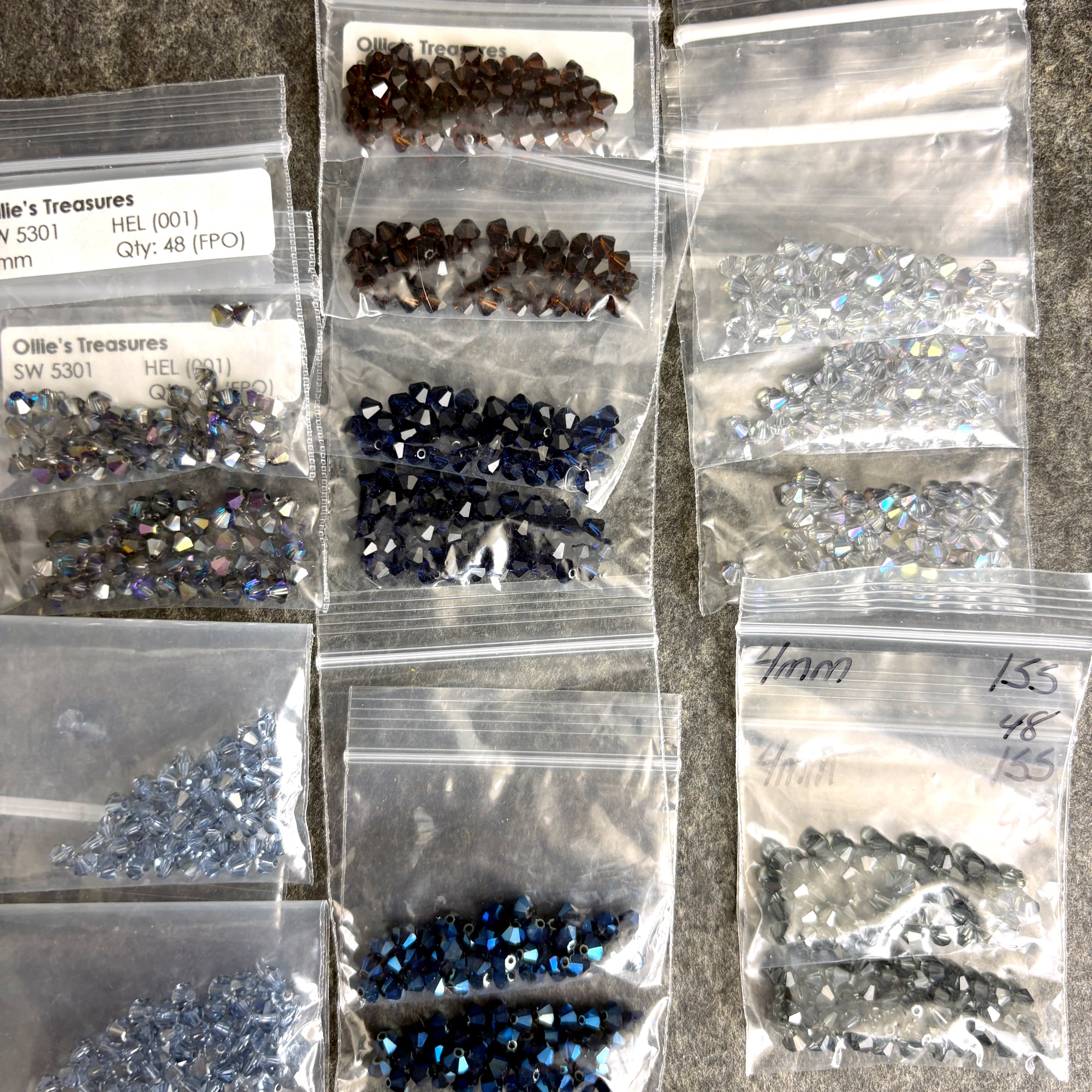 15 bags of Swarovski 4mm bicone crystal beads, 48 per bag for a total of 720 beads. Colors included: