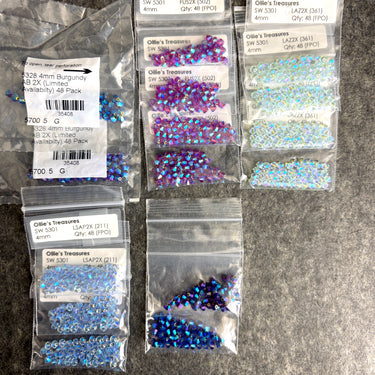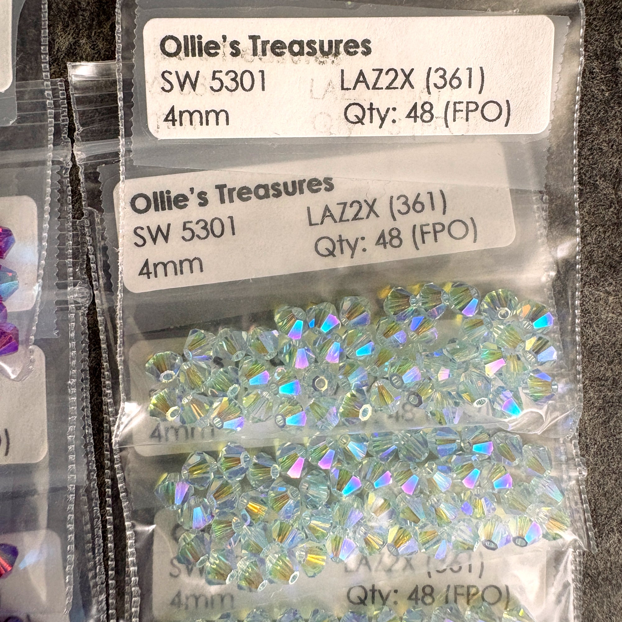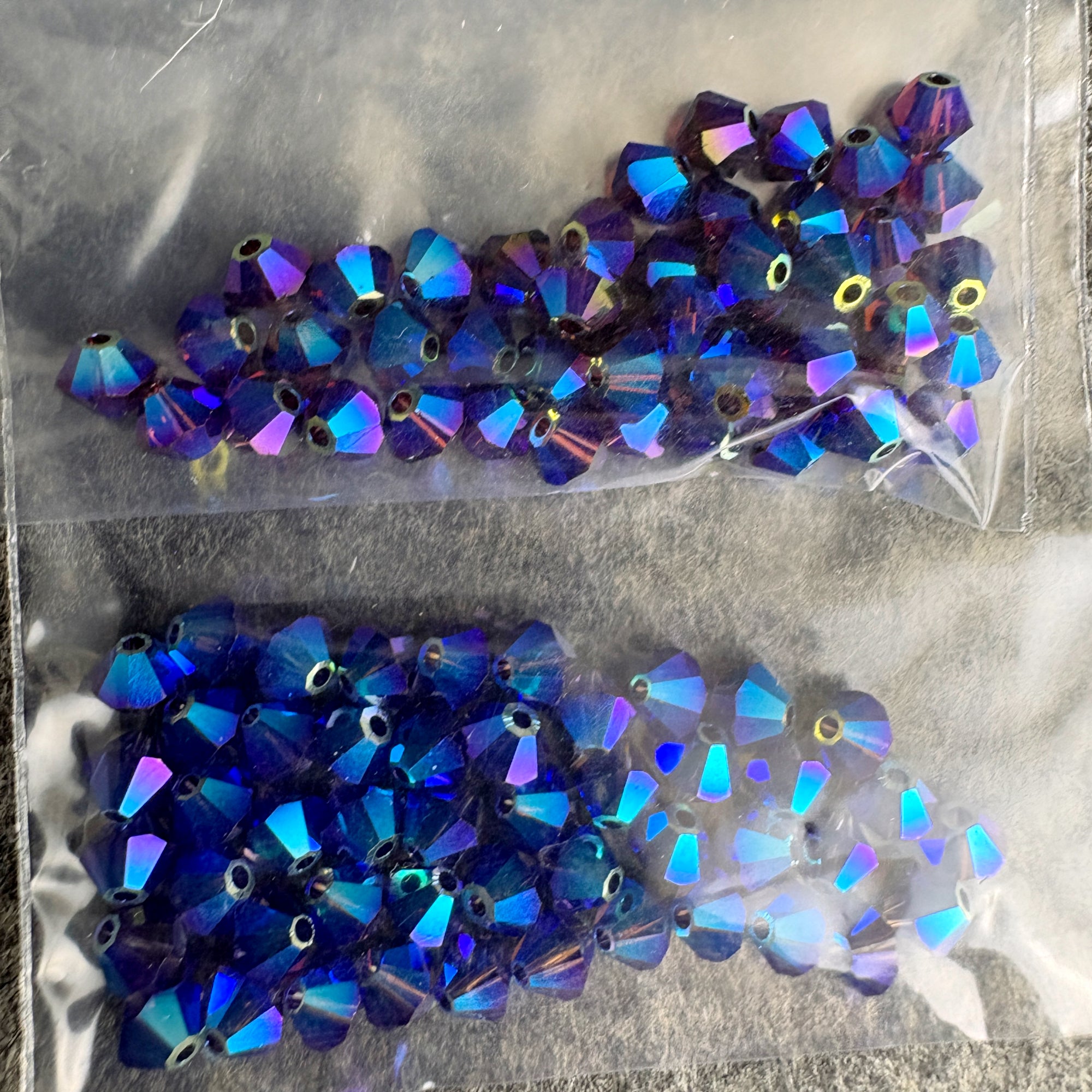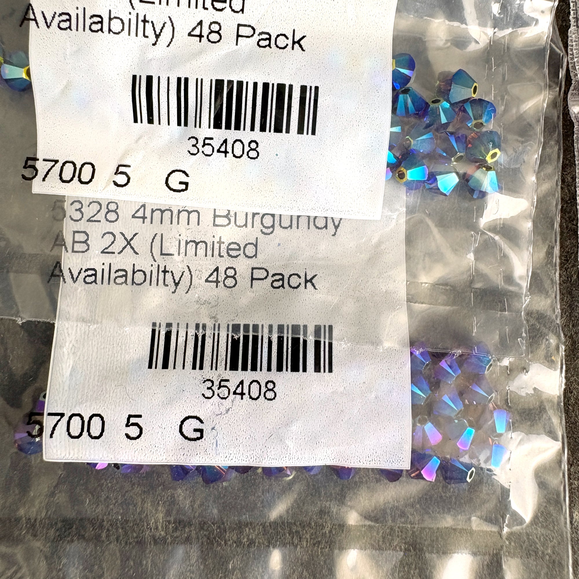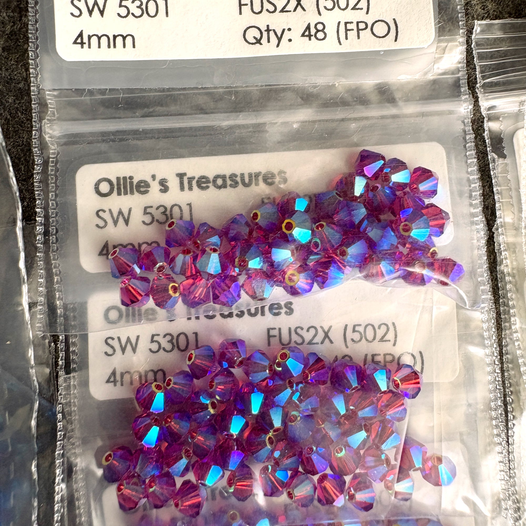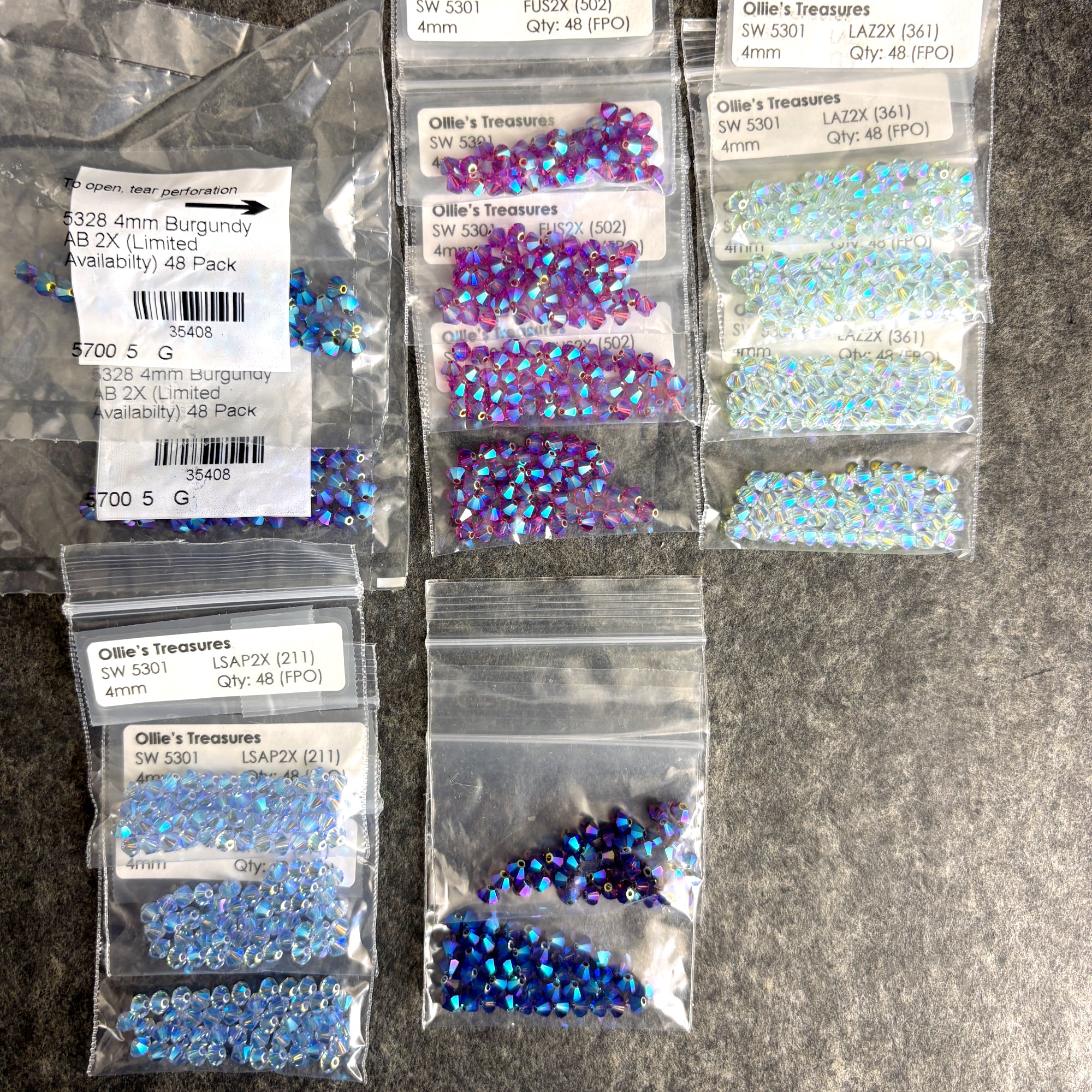 15 bags of Swarovski 4mm bicone crystal beads, 48 per bag for a total of 720 beads. Colors included: