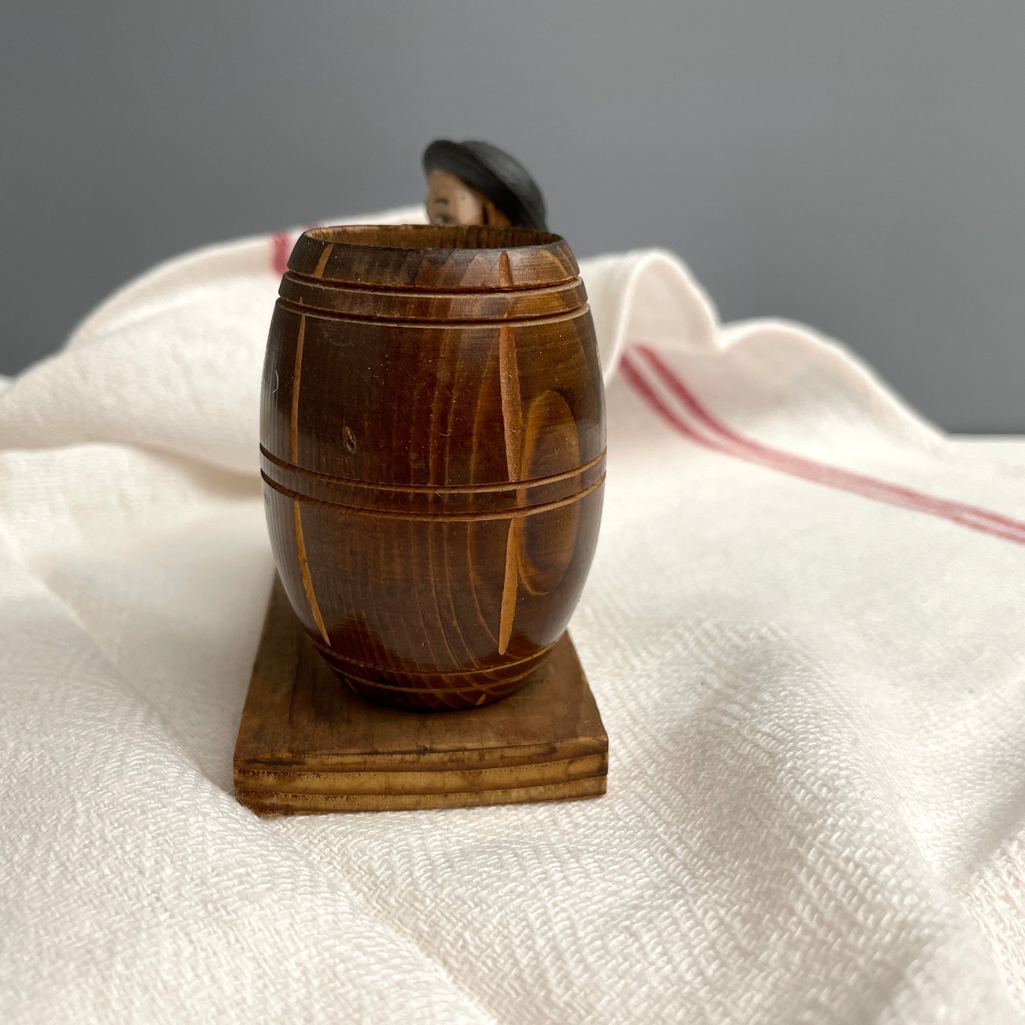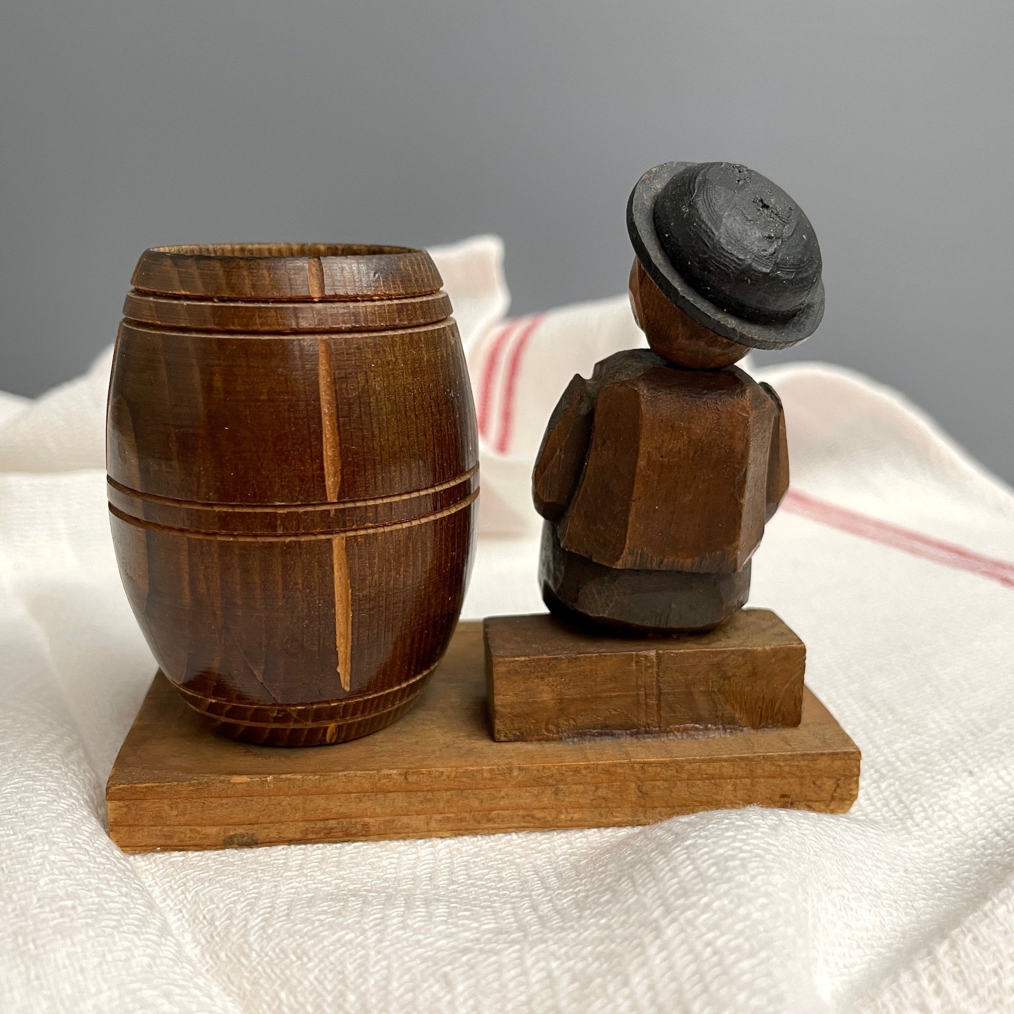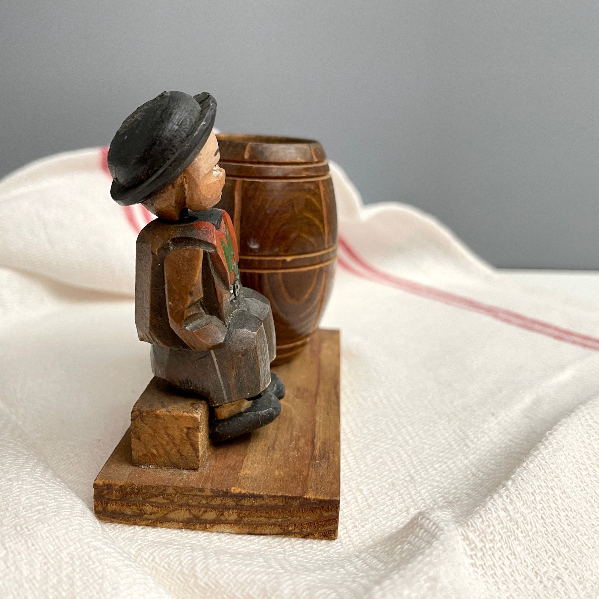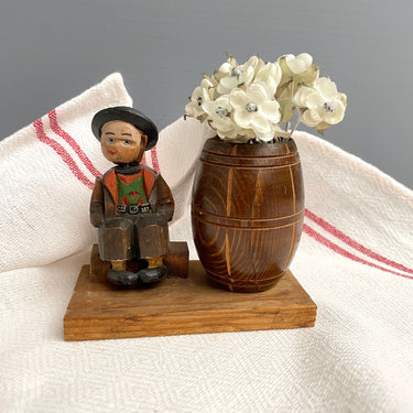 Carved Bavarian boy with a toothpick holder barrel - vintage European carving