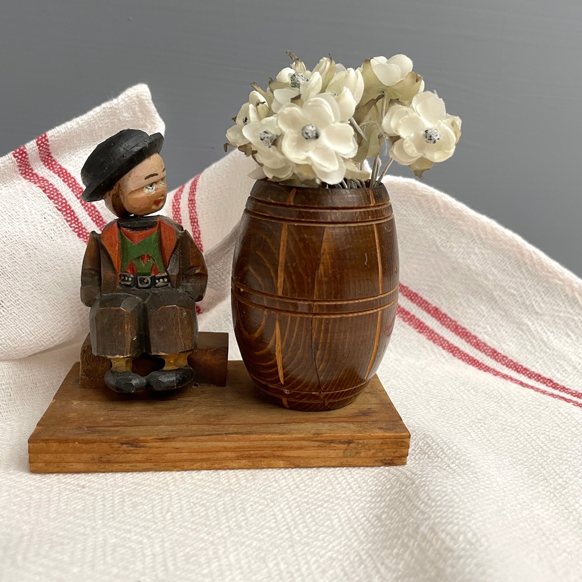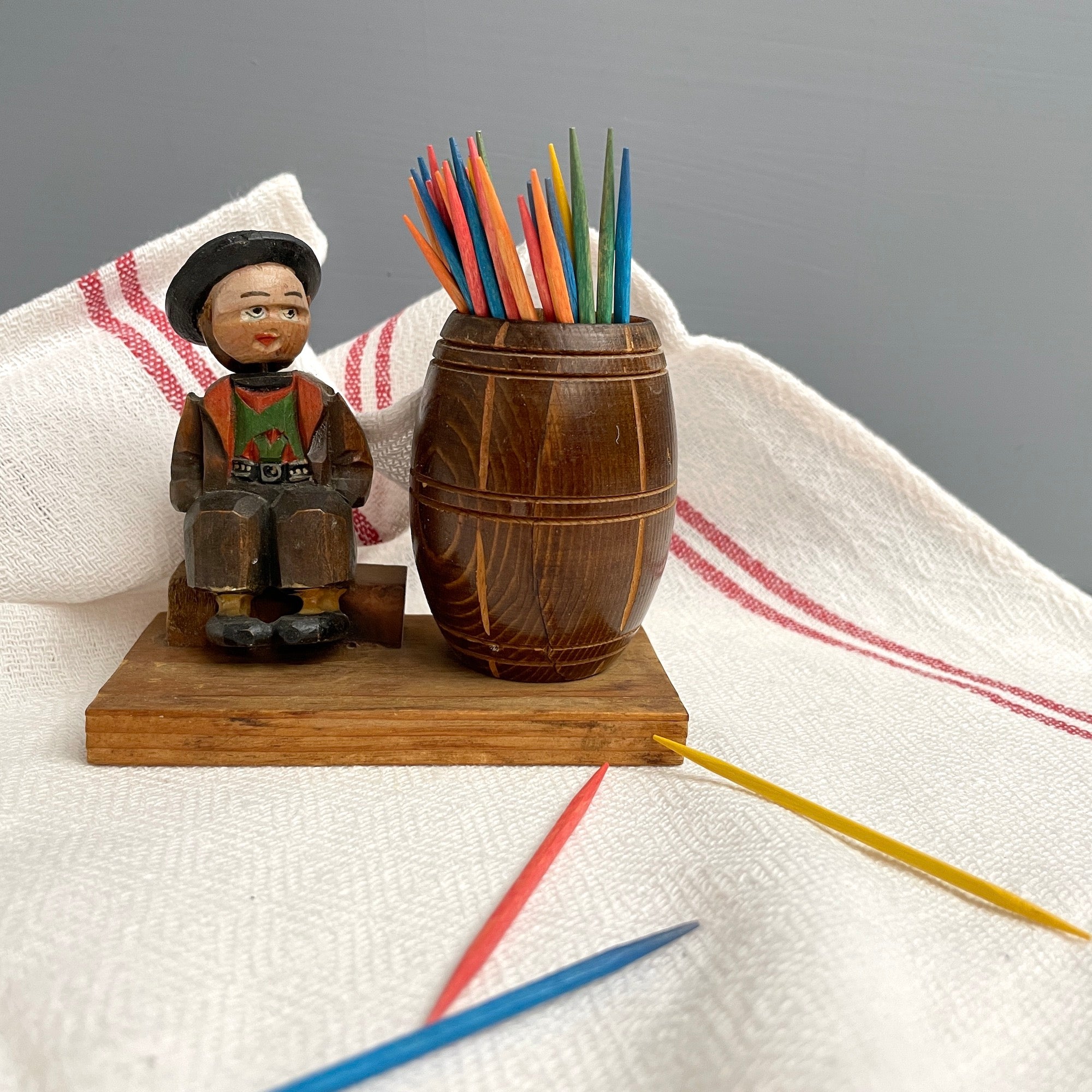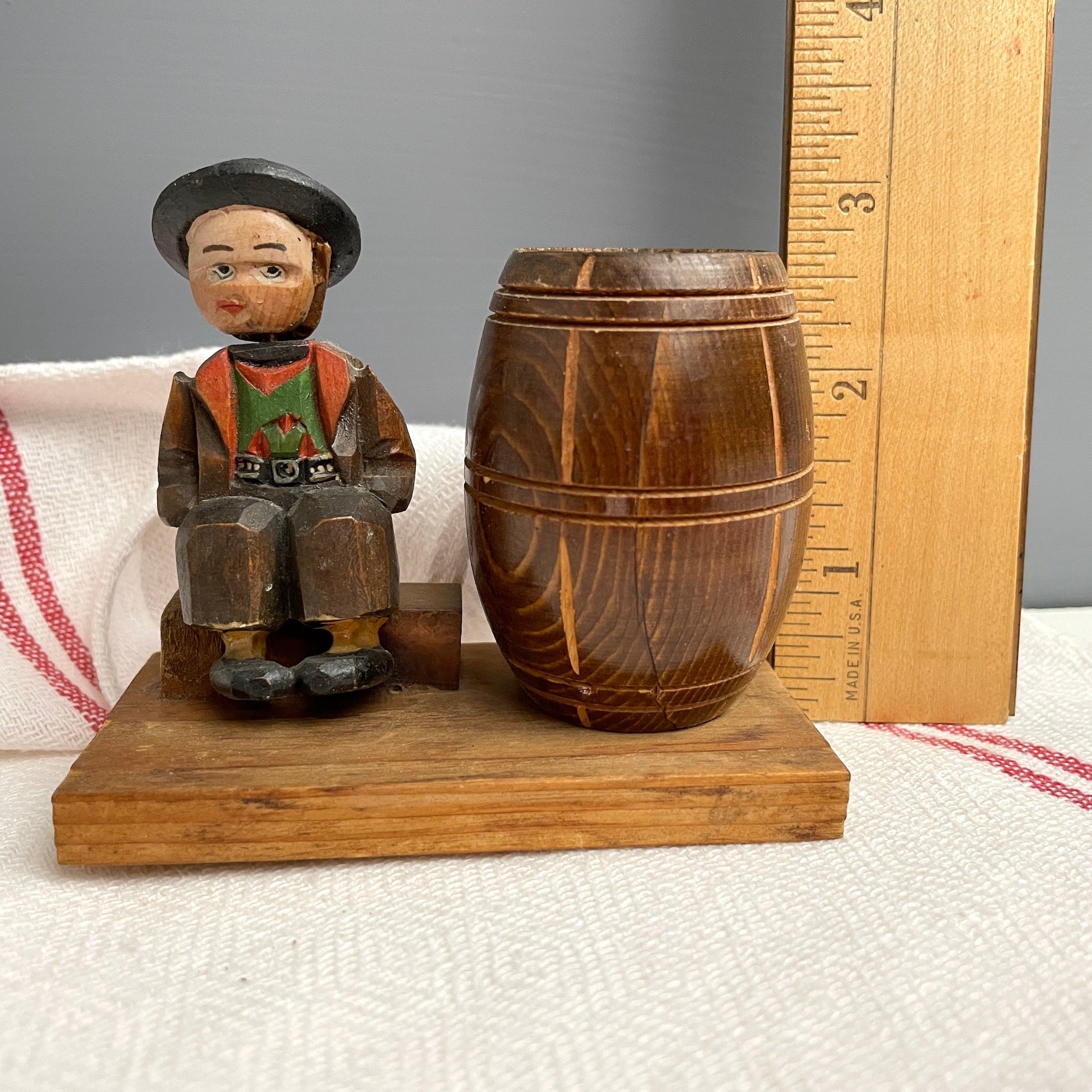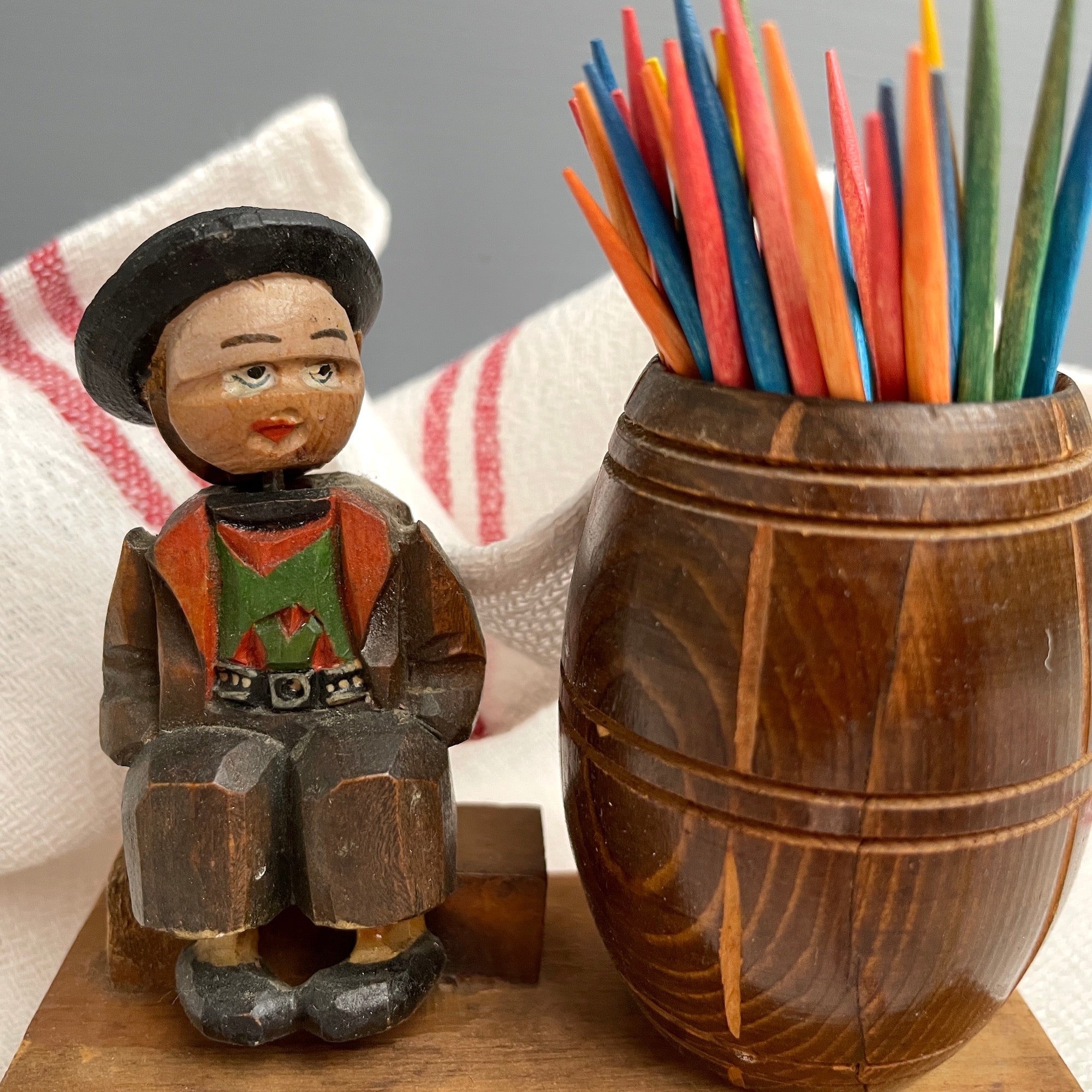 Vintage carved Bavarian boy on a bench with a head that spins, next to a wooden barrel for your toothpicks. Small boy has traditional Bavarian dress and a black hat on his head. A quirky little carving, the barrel would also hold an air plant or other stick matches.