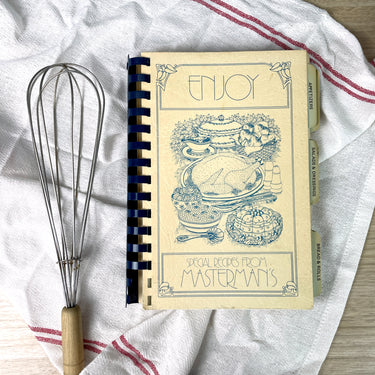 Vintage 1983 community cookbook from Masterman's. Includes recipes submitted by Masterman's staff and business customers.