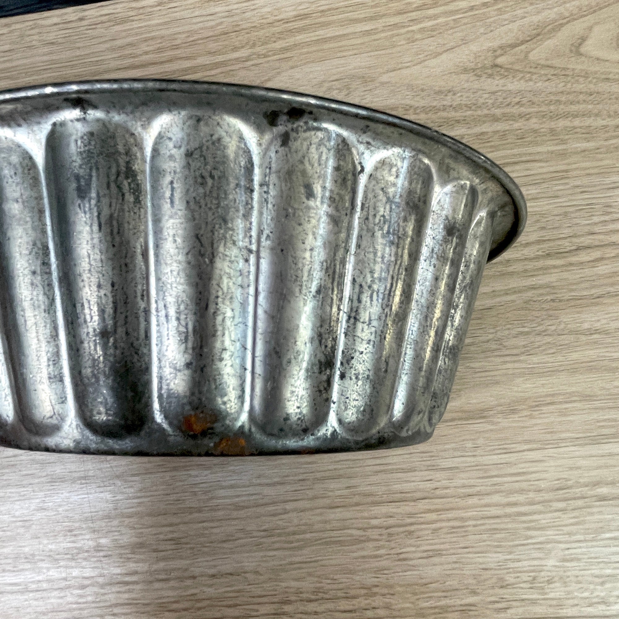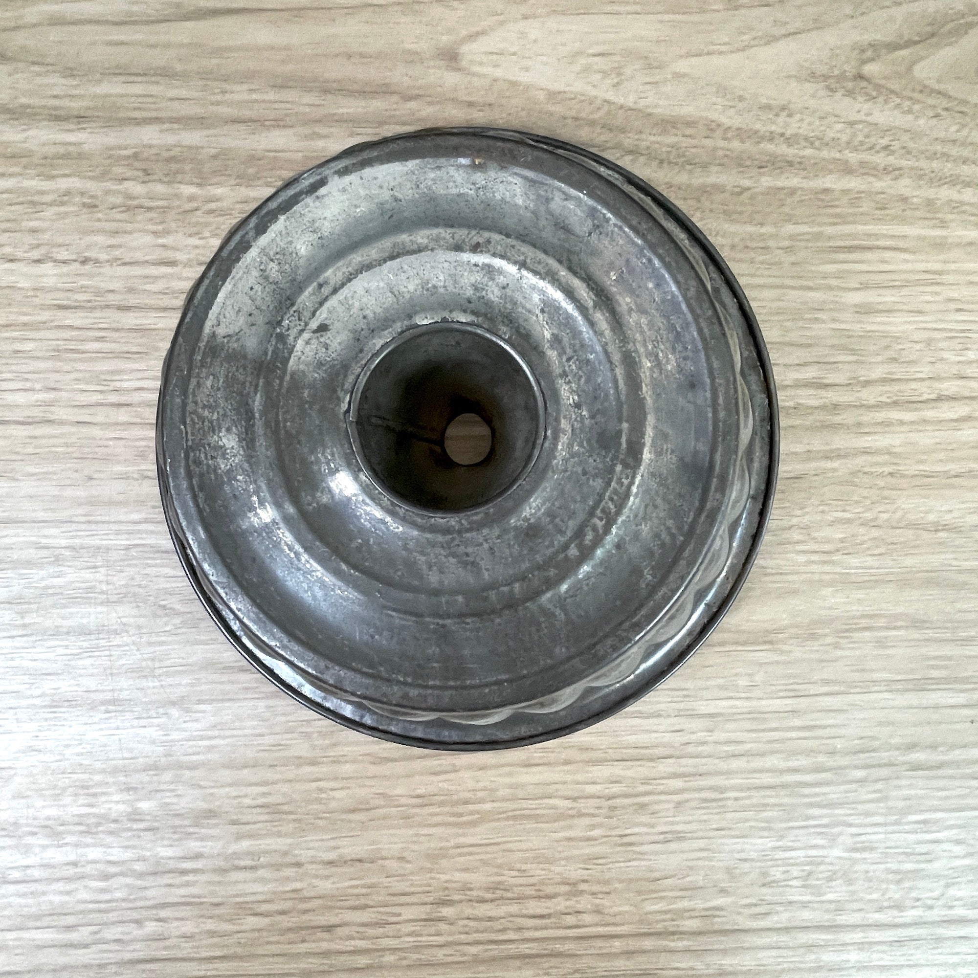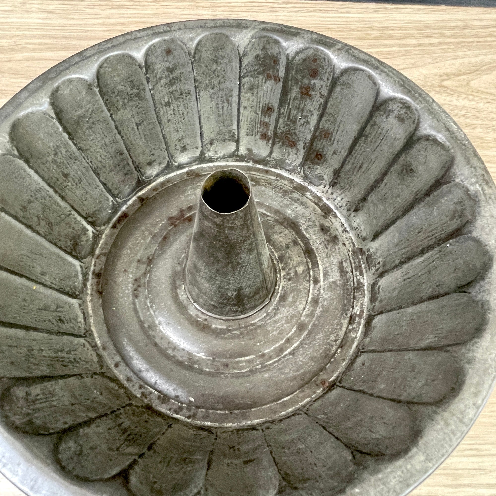 Vintage tinned steel tube pan with fluted sides. Round pan with conical center piece. Excellent for display