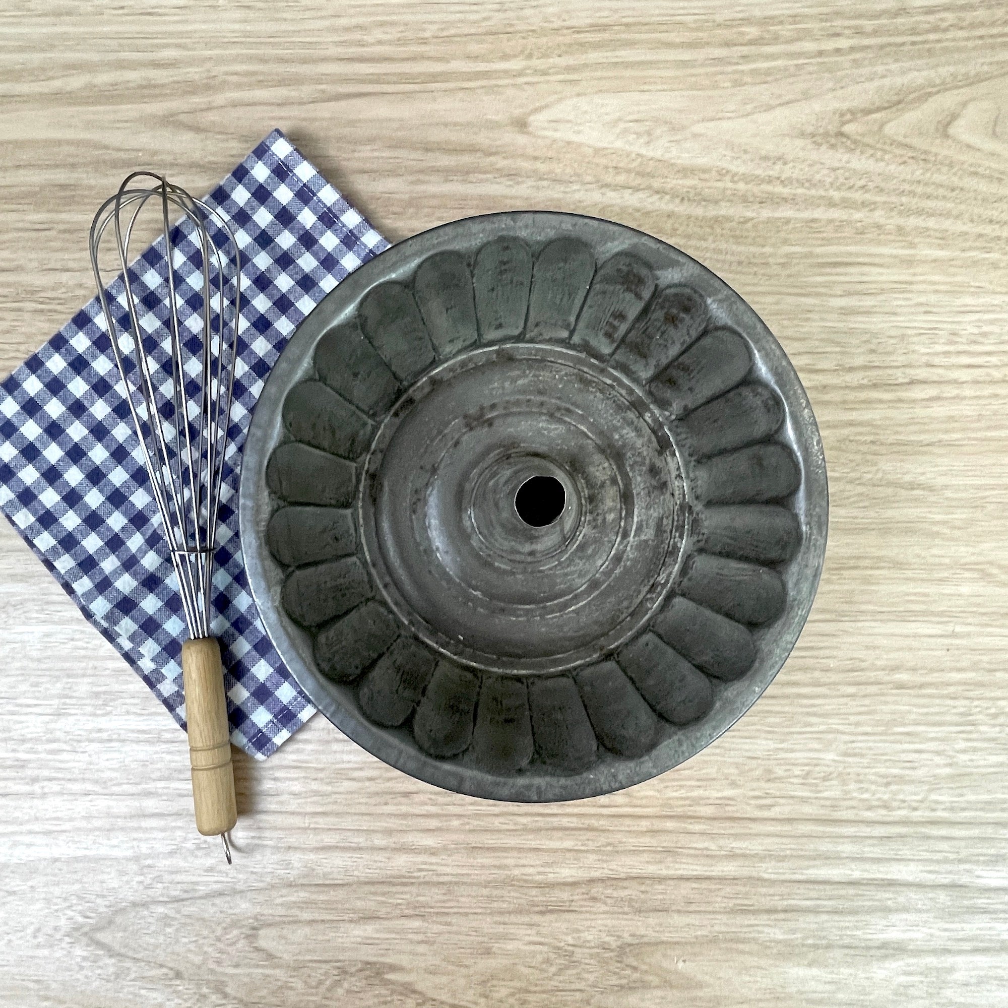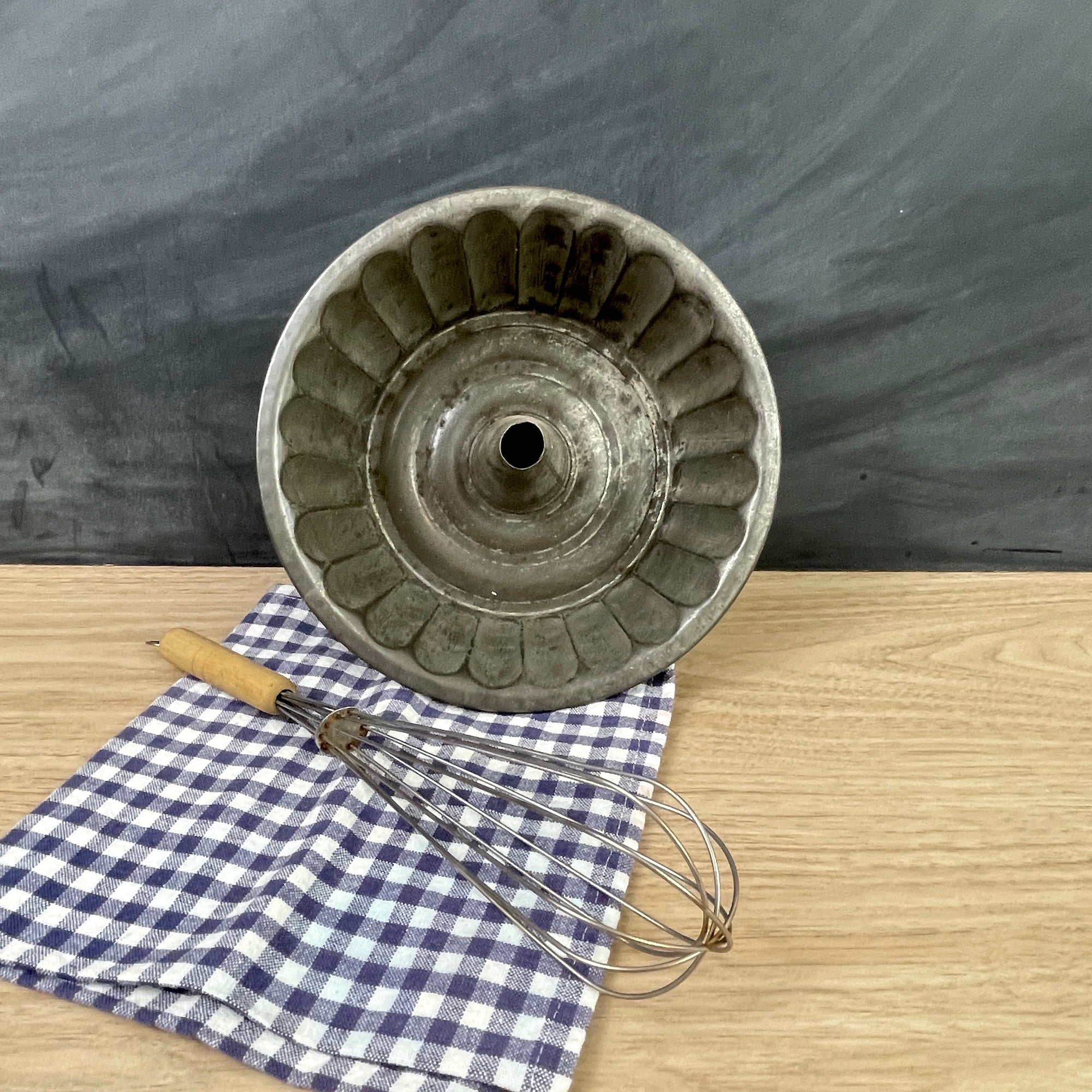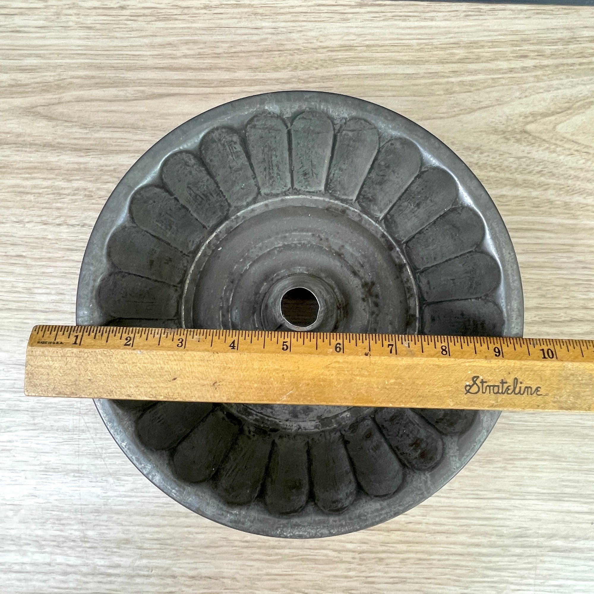 Vintage tinned steel tube pan with fluted sides. Round pan with conical center piece. Excellent for display