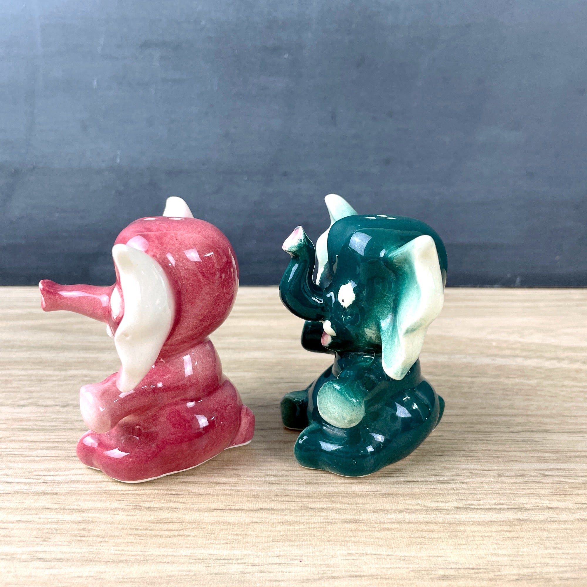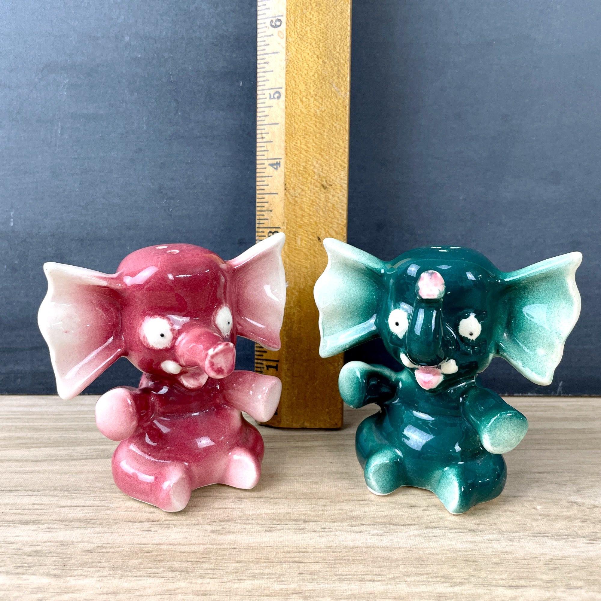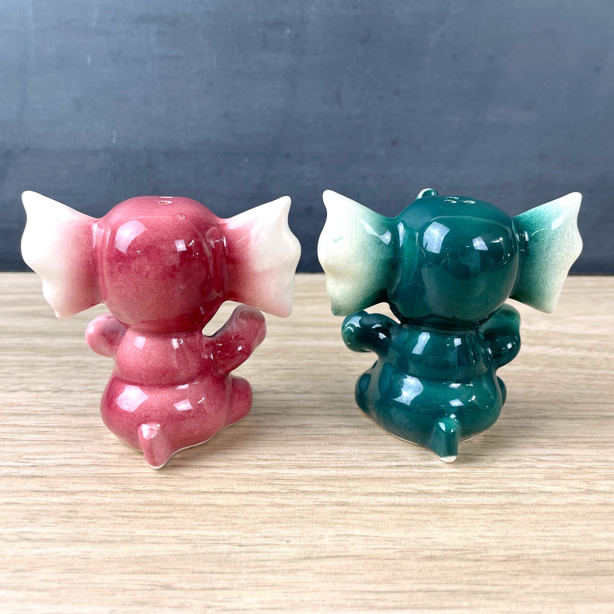 Vintage 1950s sitting elephant salt and pepper shakers in pink and green. Ears as big as a bow tie. Mauve pink and spruce green. Likely made in Japan. With corks.