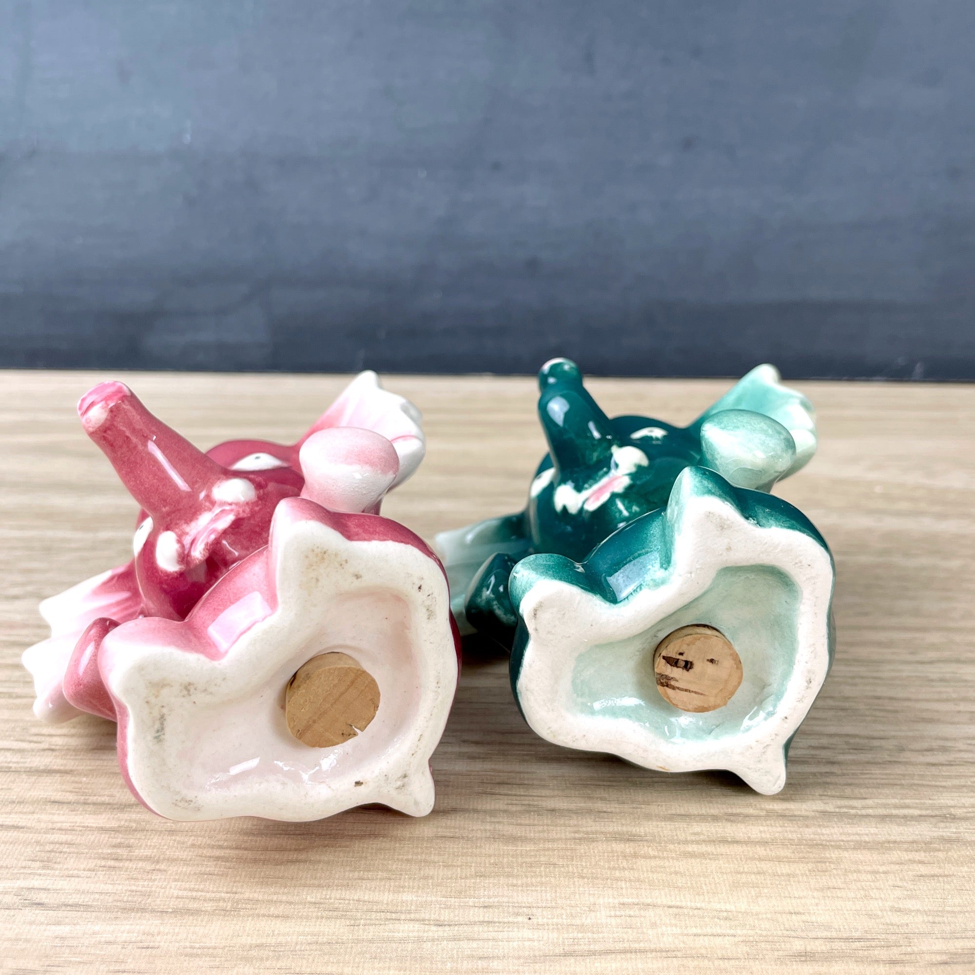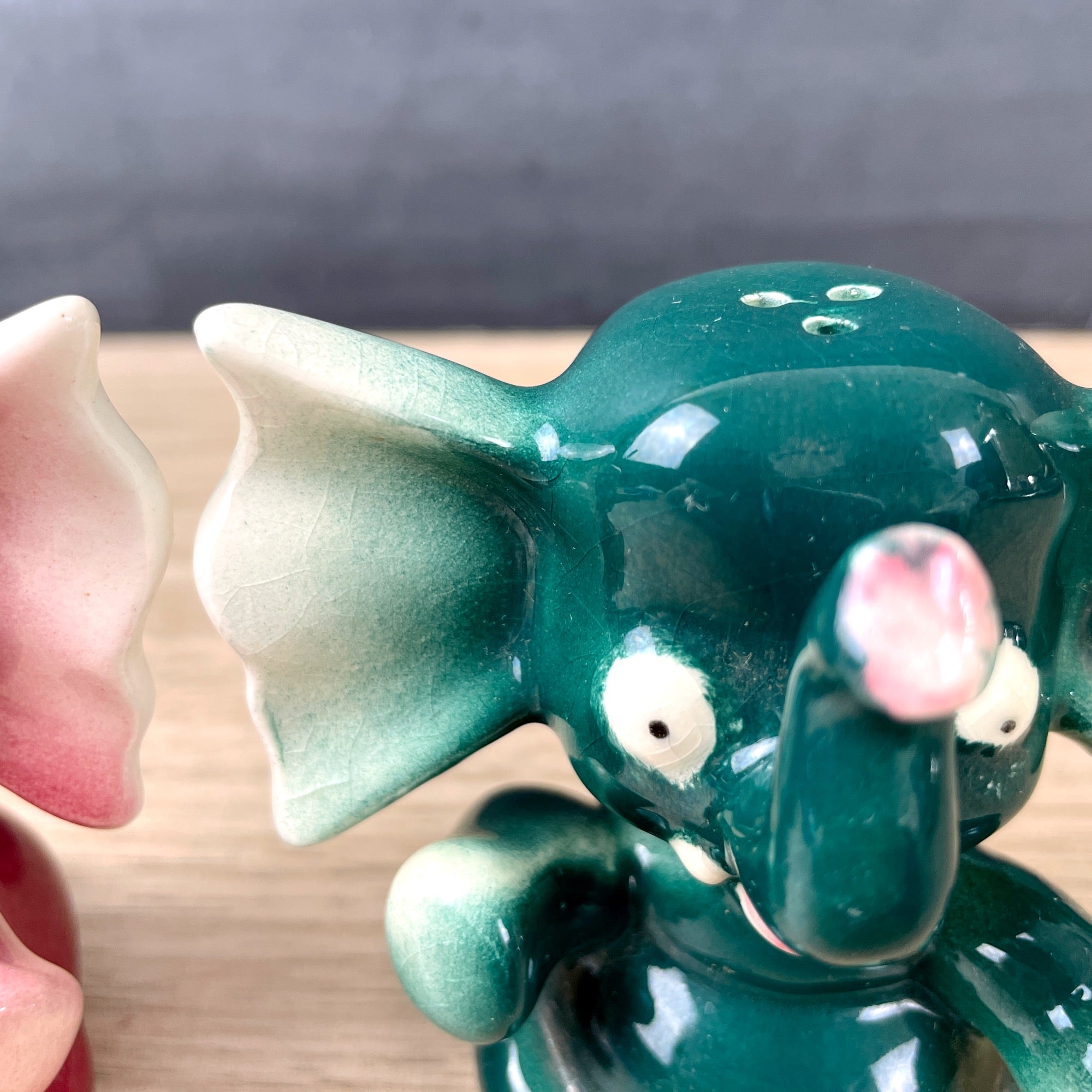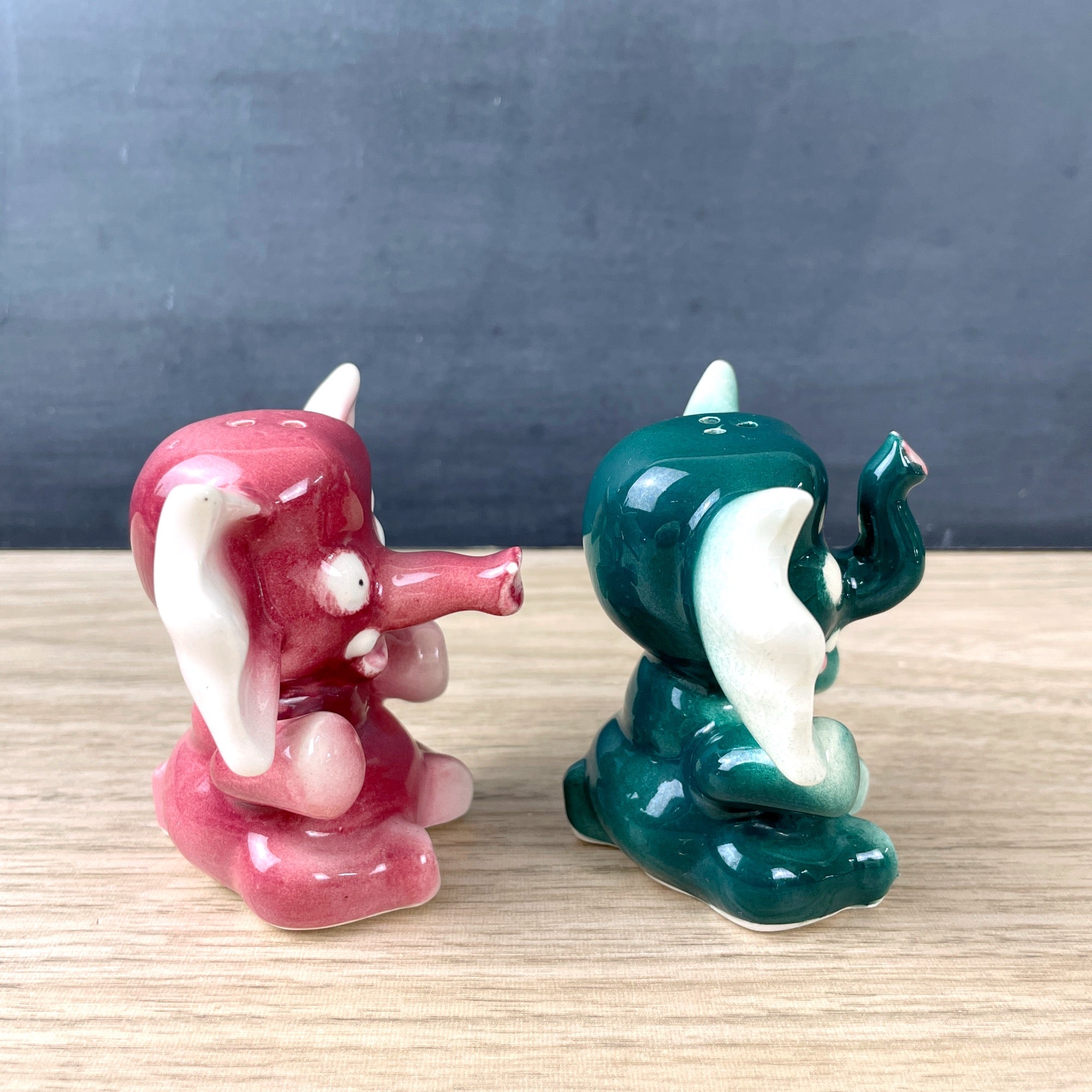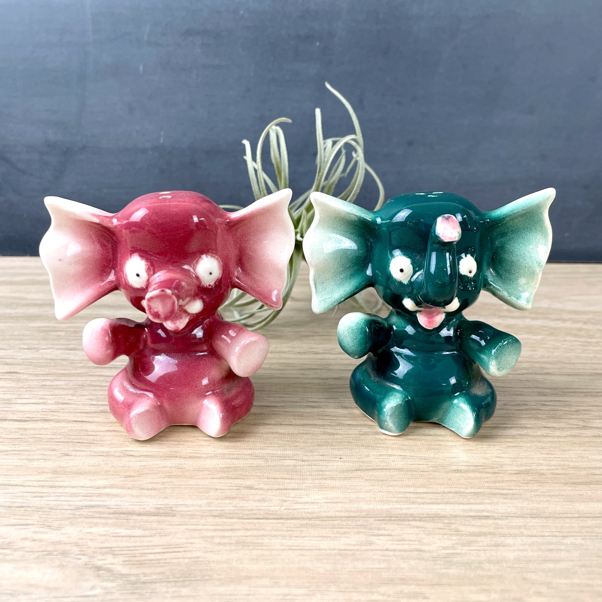 Vintage 1950s sitting elephant salt and pepper shakers in pink and green. Ears as big as a bow tie. Mauve pink and spruce green. Likely made in Japan. With corks.