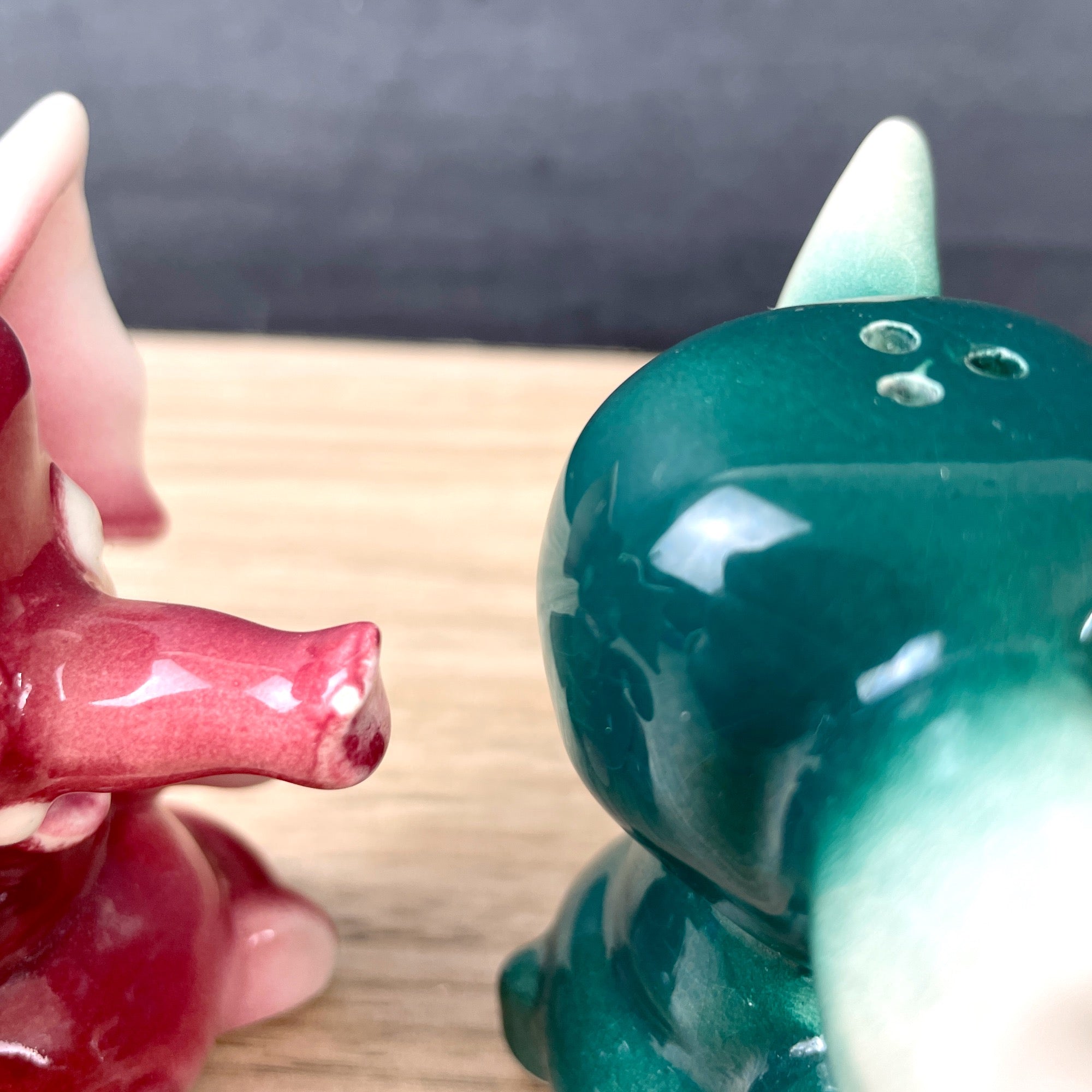 Pink and green elephant salt and pepper shakers - 1950s vintage