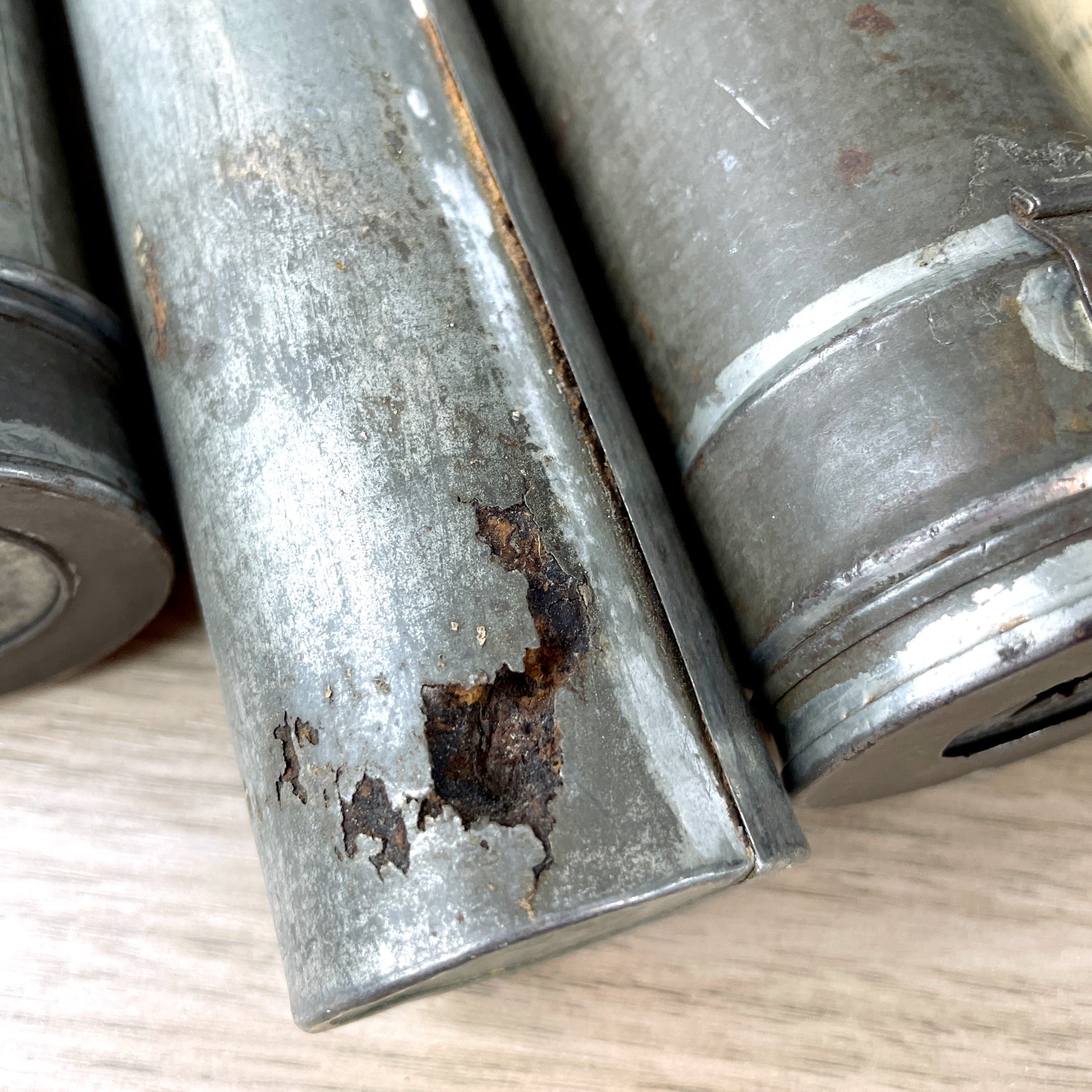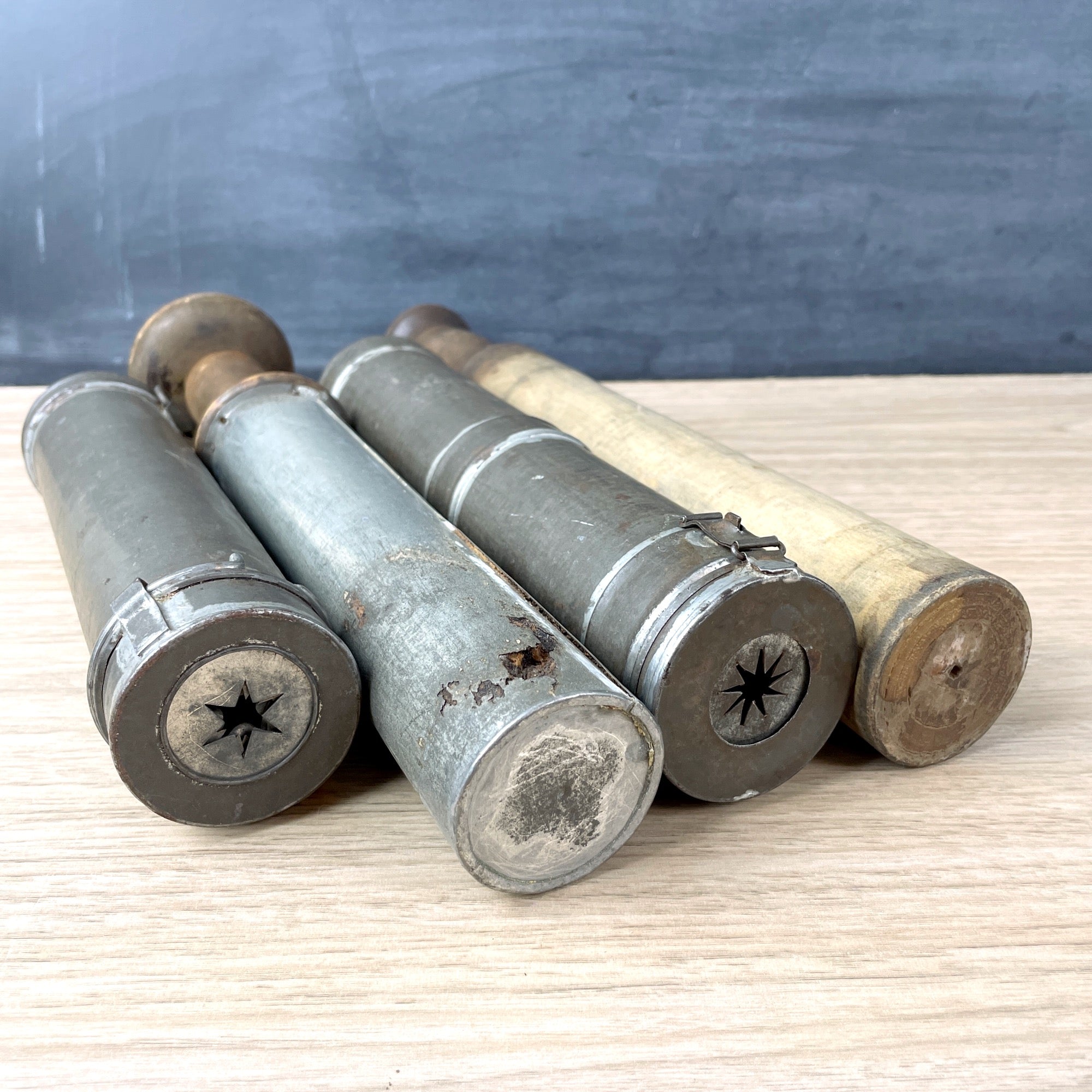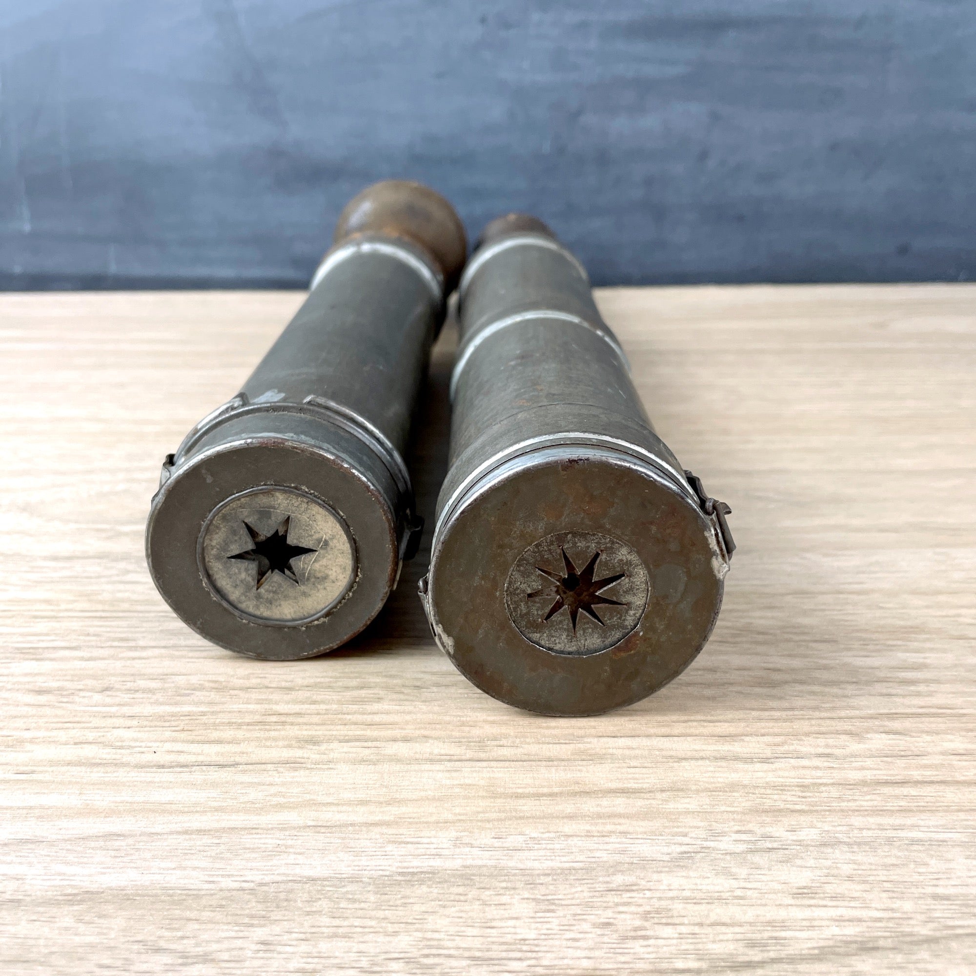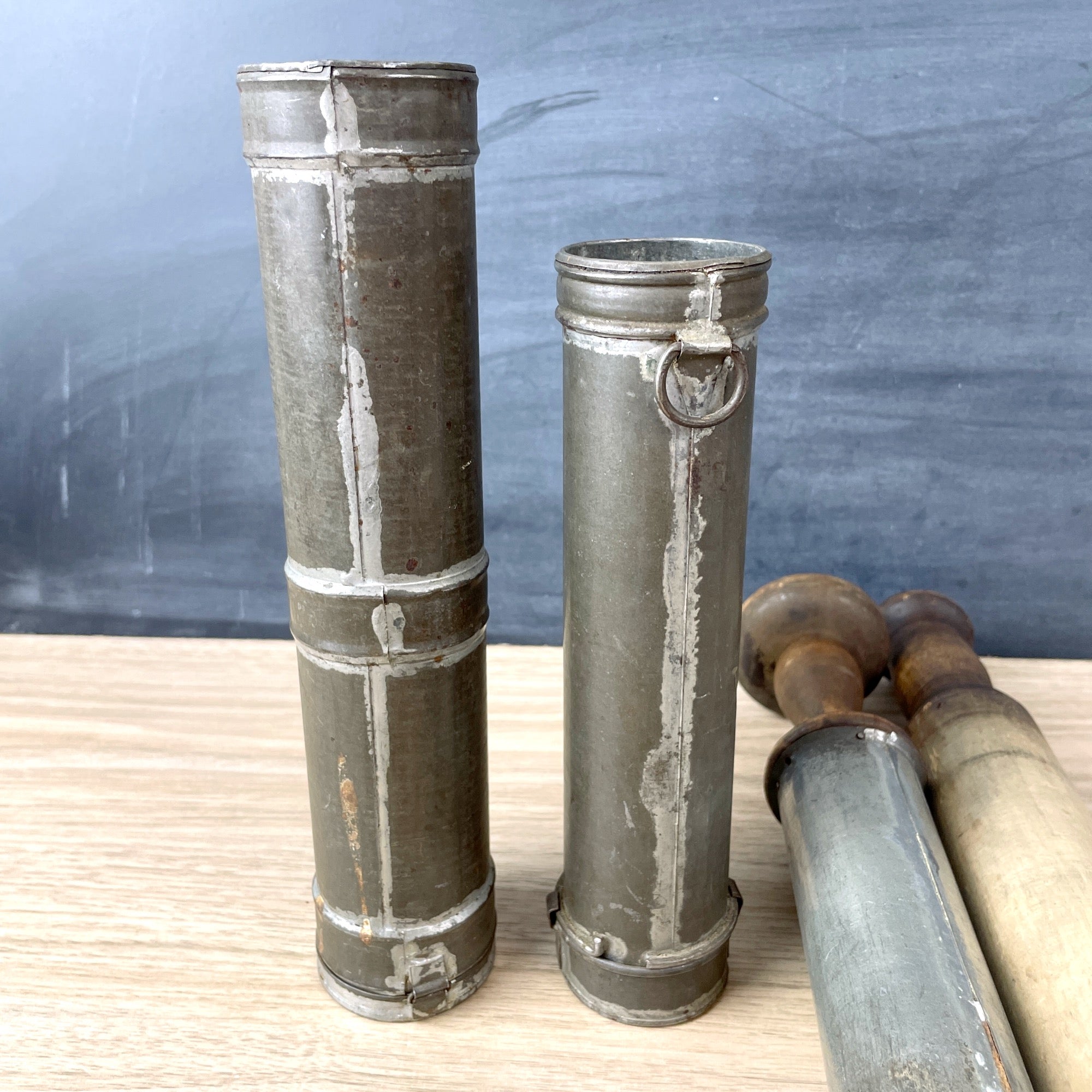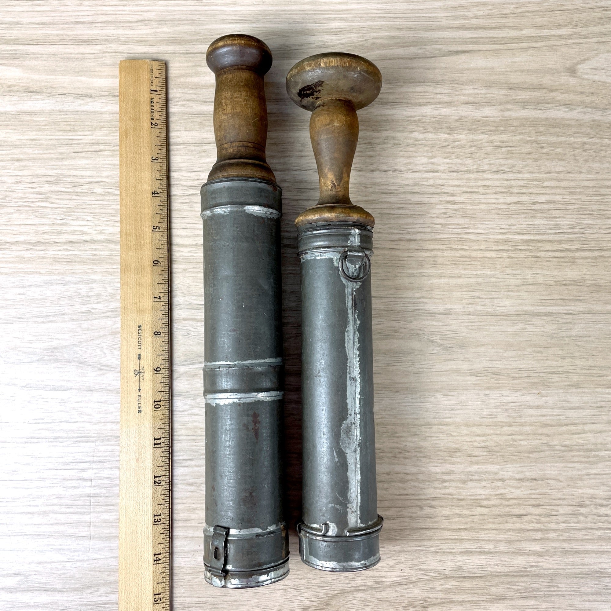 Pair of rustic cookie presses from the early 1900s, made of wood and tin. Tin tubes with one tin-wrapped wooden plunger and one wooden plunger. One has 5 interchangeable designs and the other has 1. Excellent for decor, although both could probably be cleaned and used.