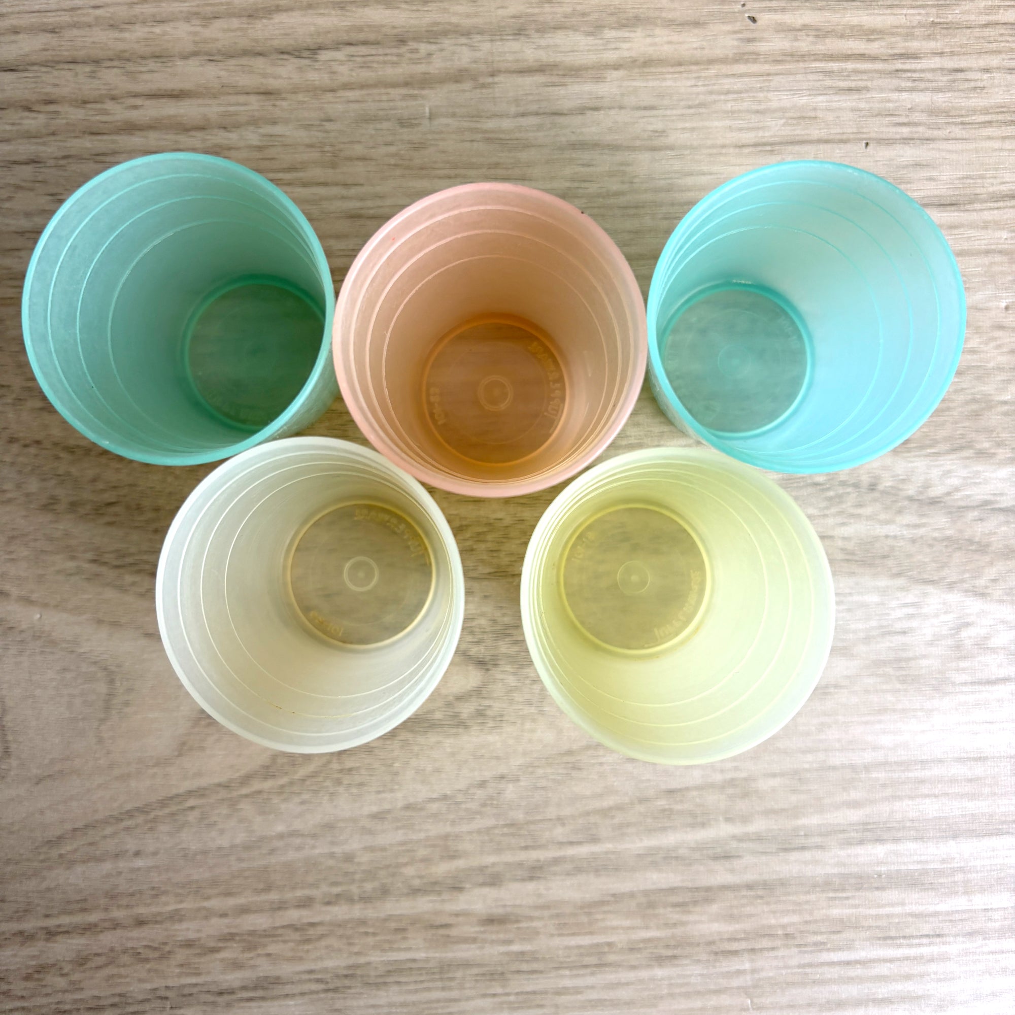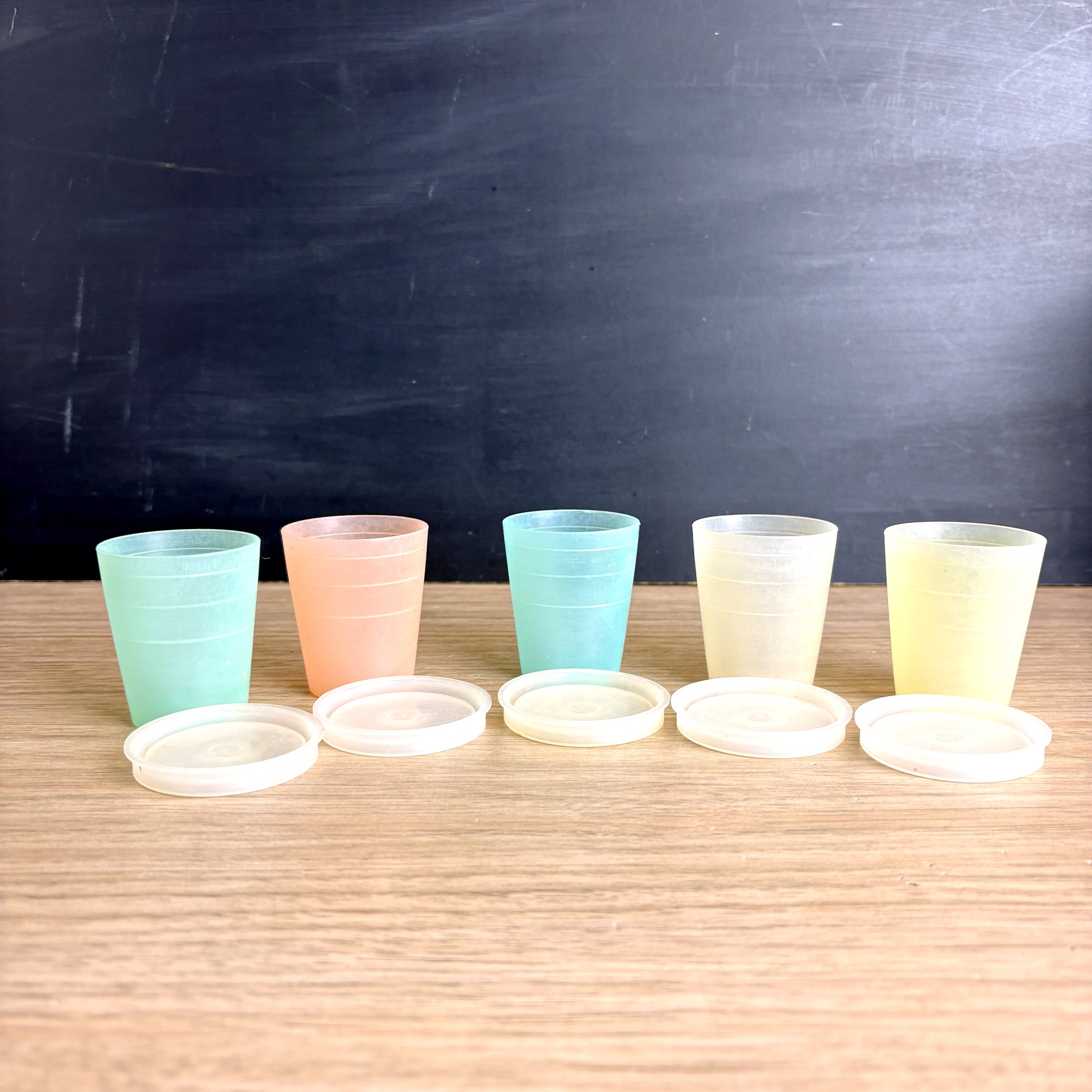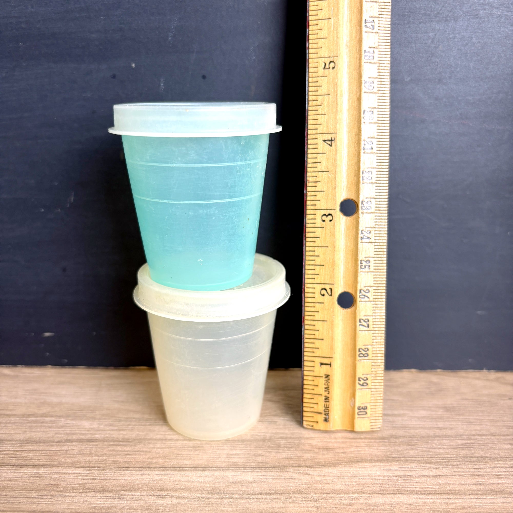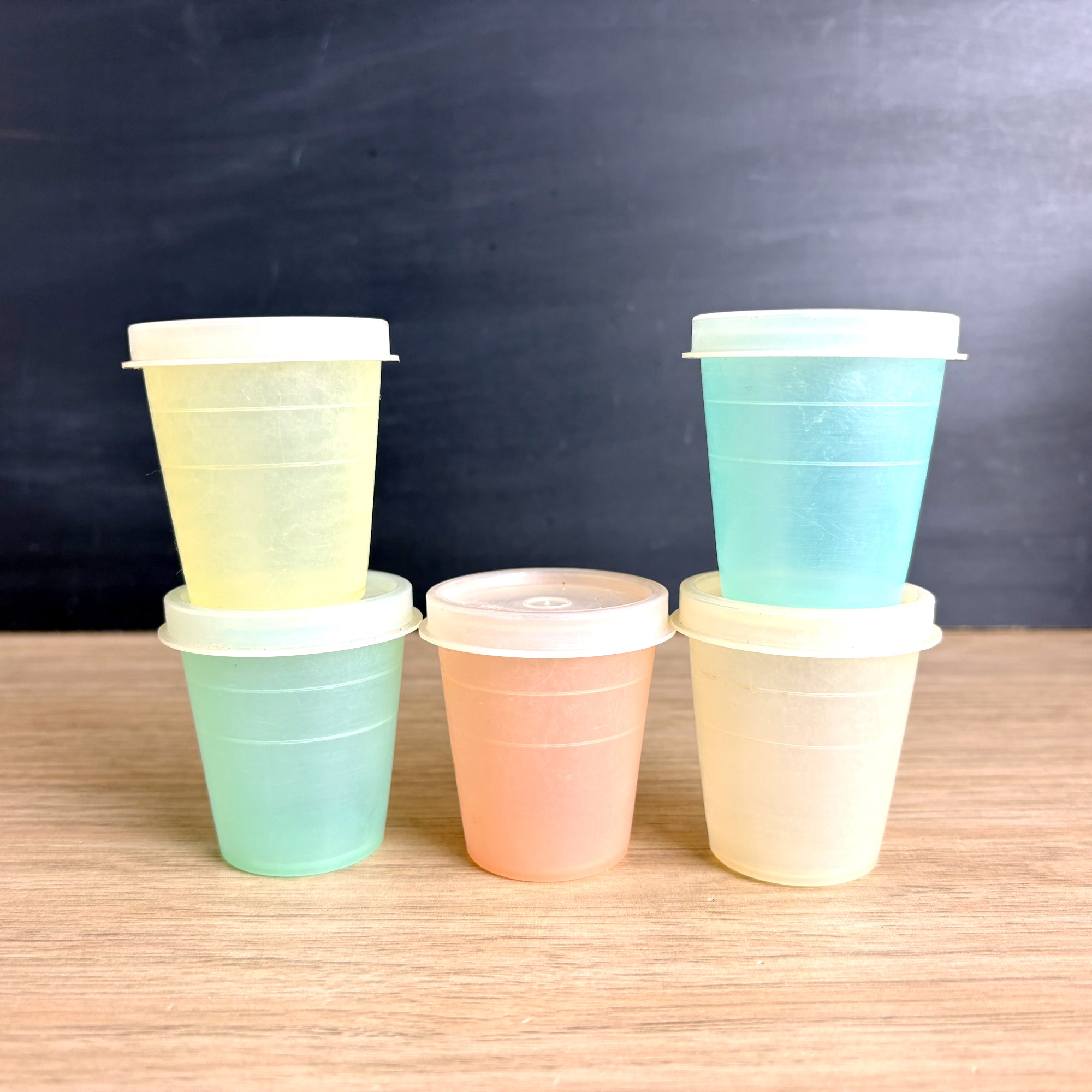 Vintage pastel pre-owned Tupperware mini midget containers 101 hold 2 ounces each and have 201 clear lids. Perfect for kids' snacks or small craft items.