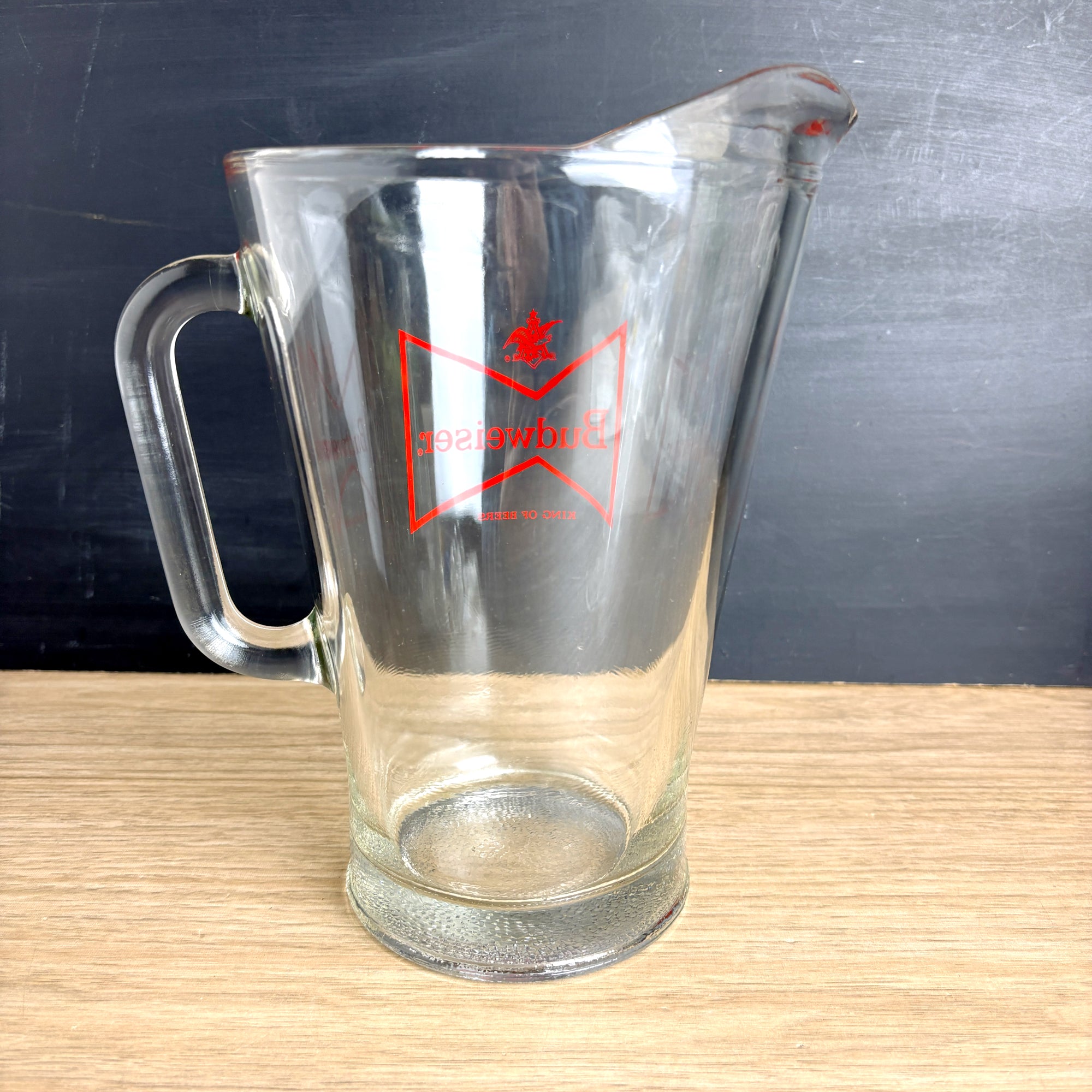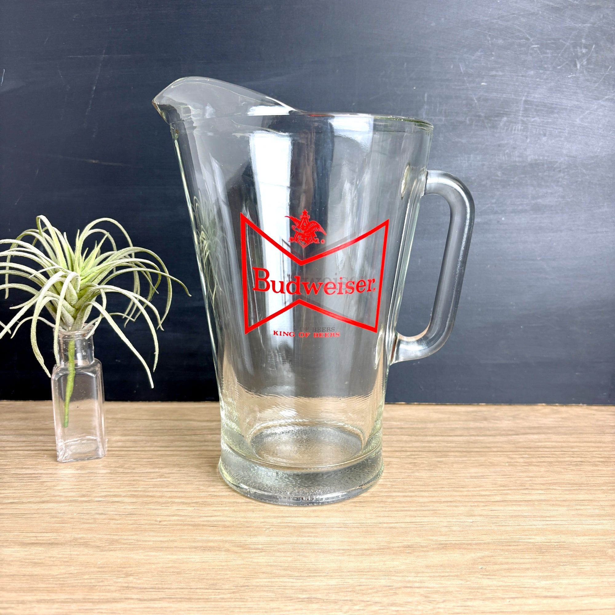 Serve your guests the King of Beers from this heavy glass pitcher. Thick, dimpled base to help keep the beer colder for longer. Classic Bud bowtie logo, with the Anheuser-Busch eagle logo above and "King of Beers" below.