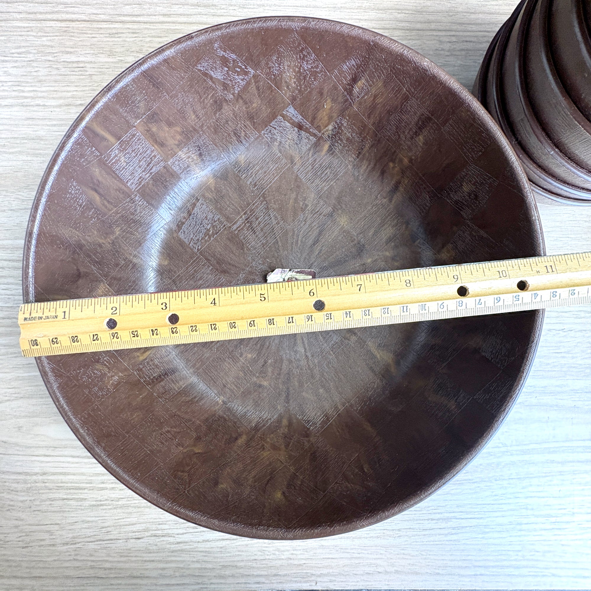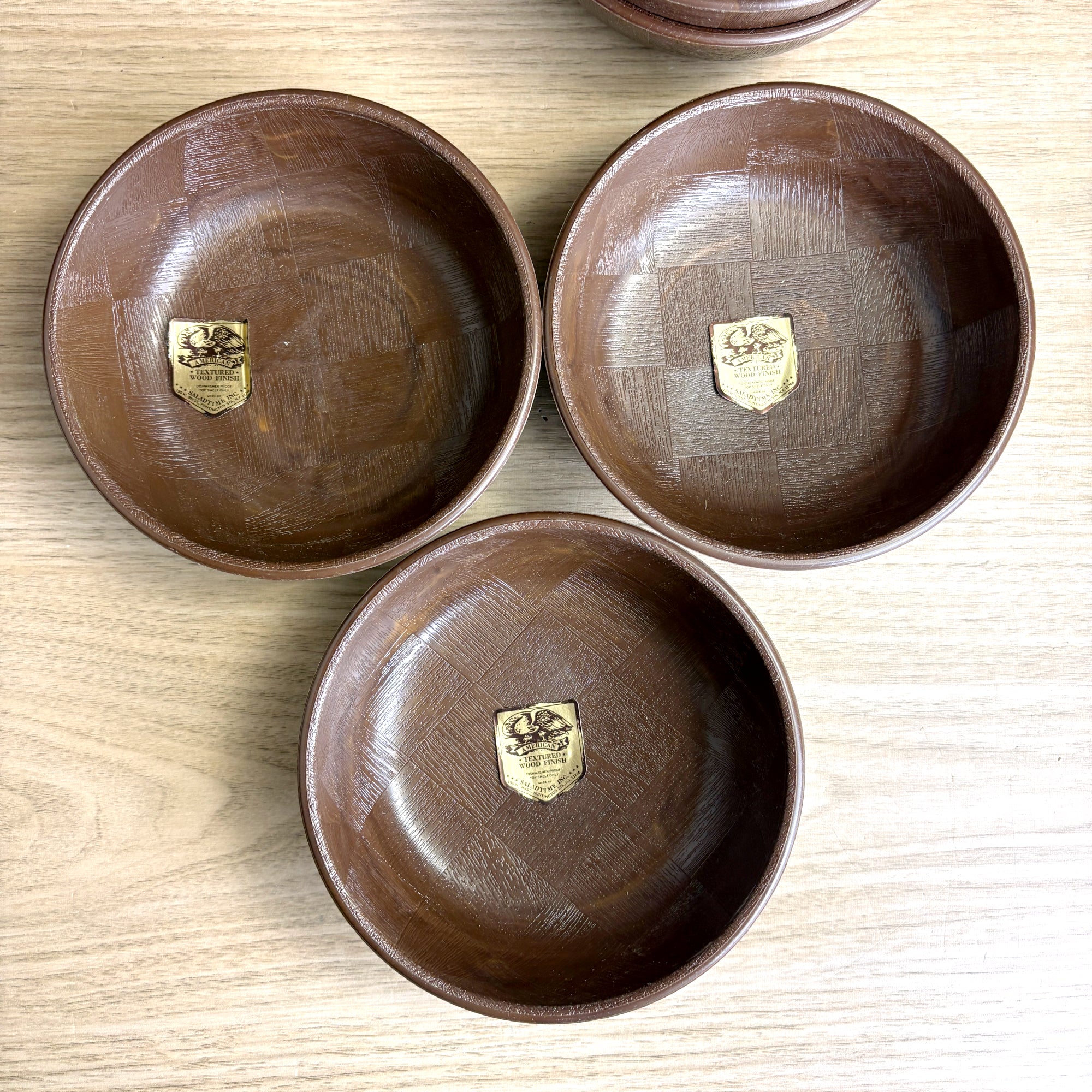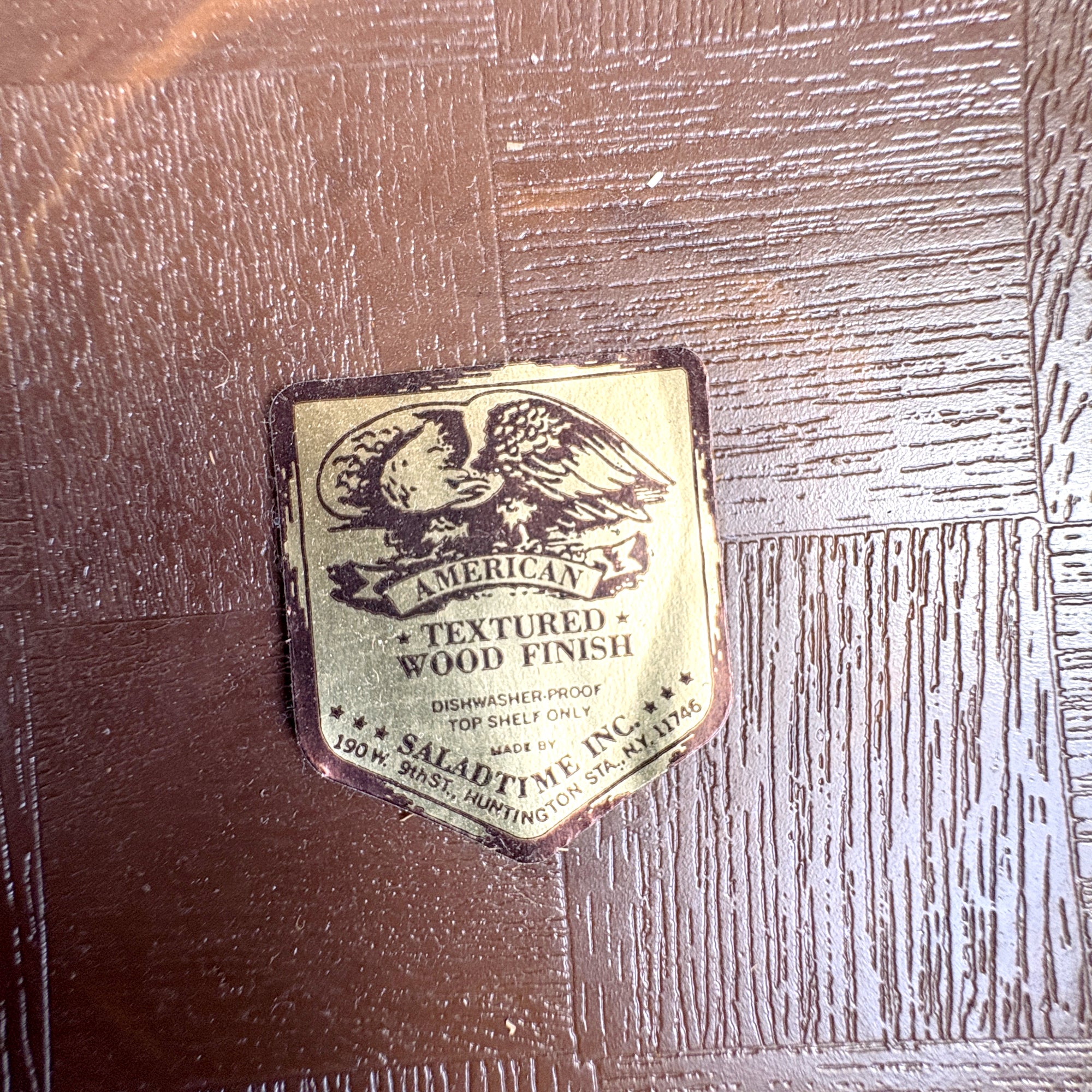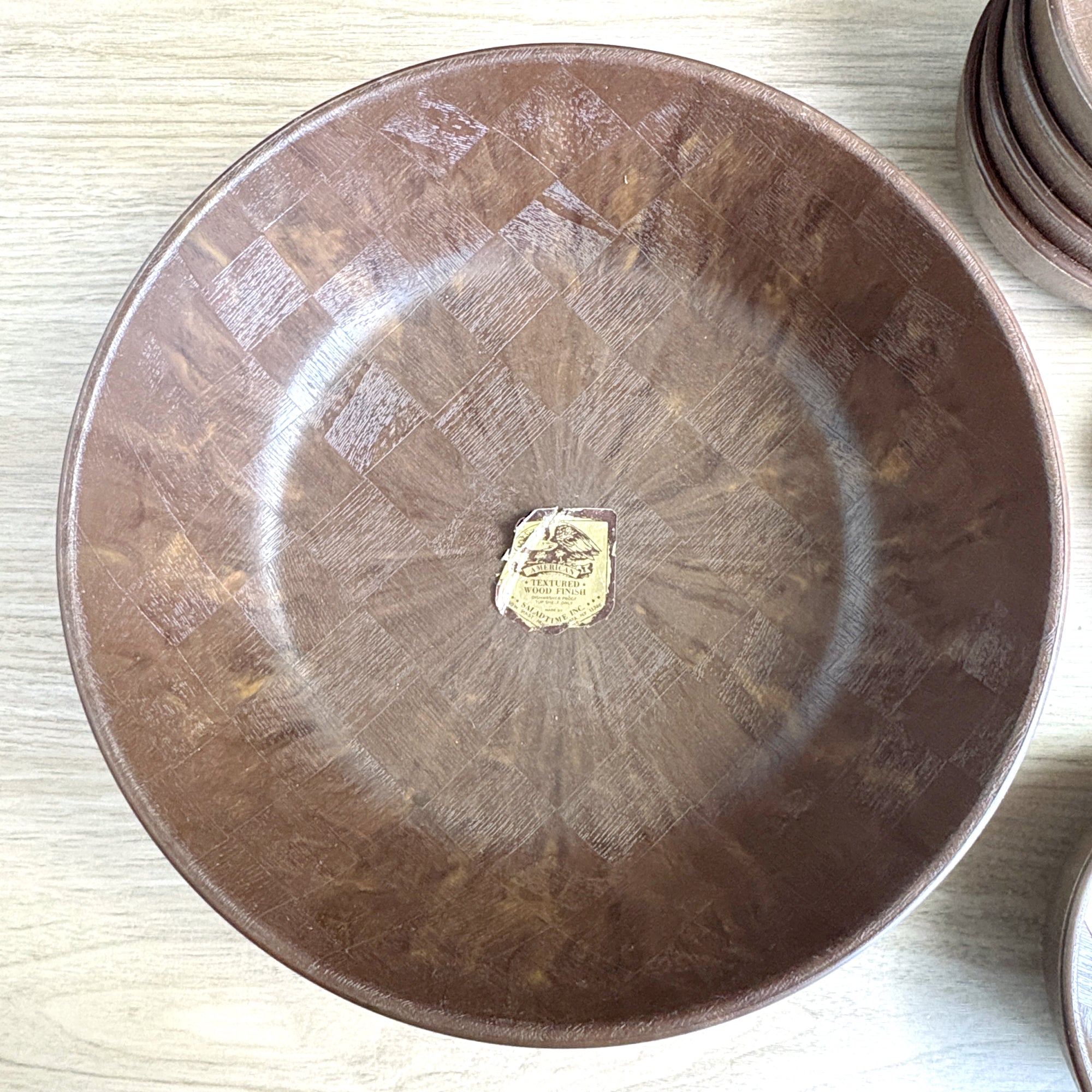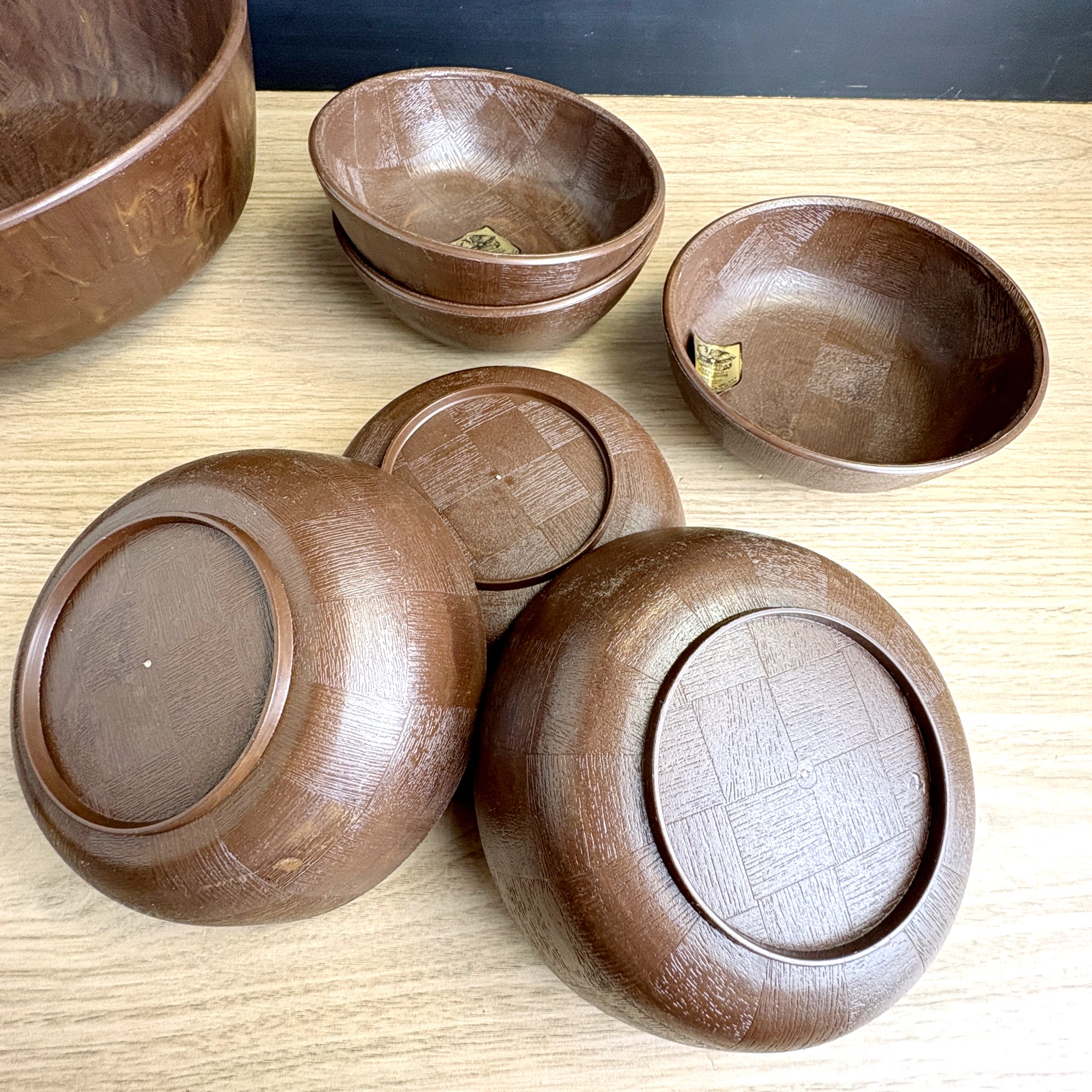 Vintage plastic salad set of 1 large and 6 small bowls, with a faux woven-wood look, was made by Saladtime, Inc of Huntington Station, NY. All but one of the bowls still sport their original stickers, making us wonder if it was ever used. We have seen lots of plastic bowls, but have never seen a set quite like this.