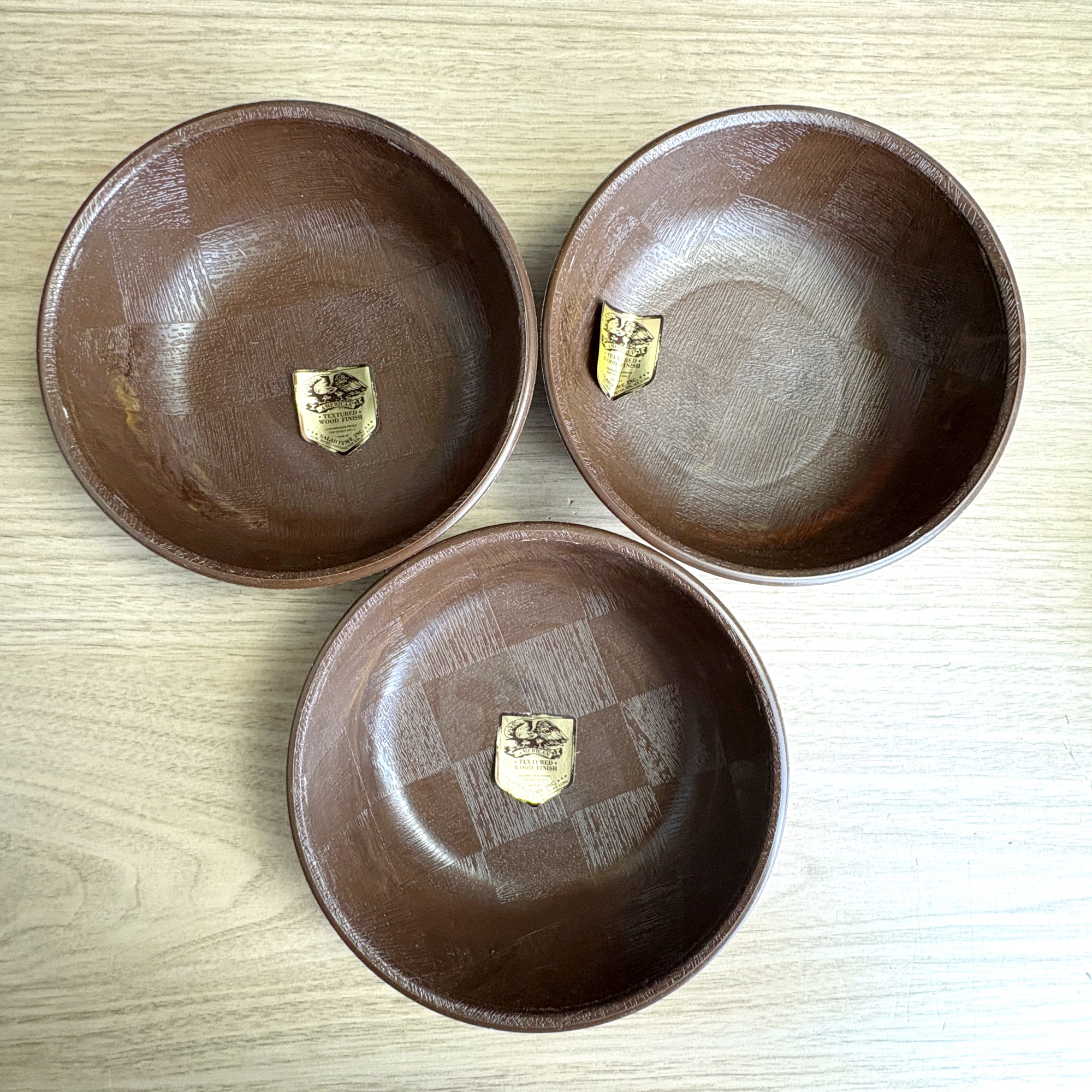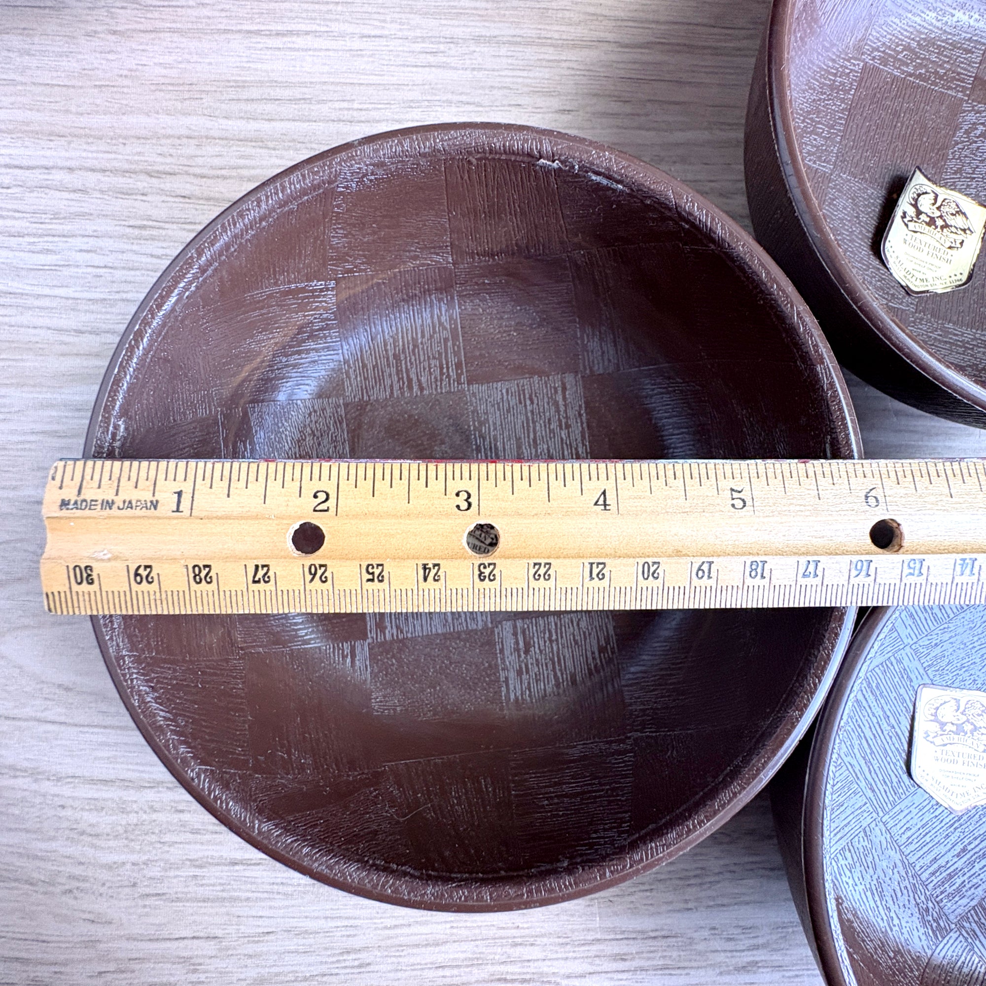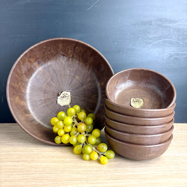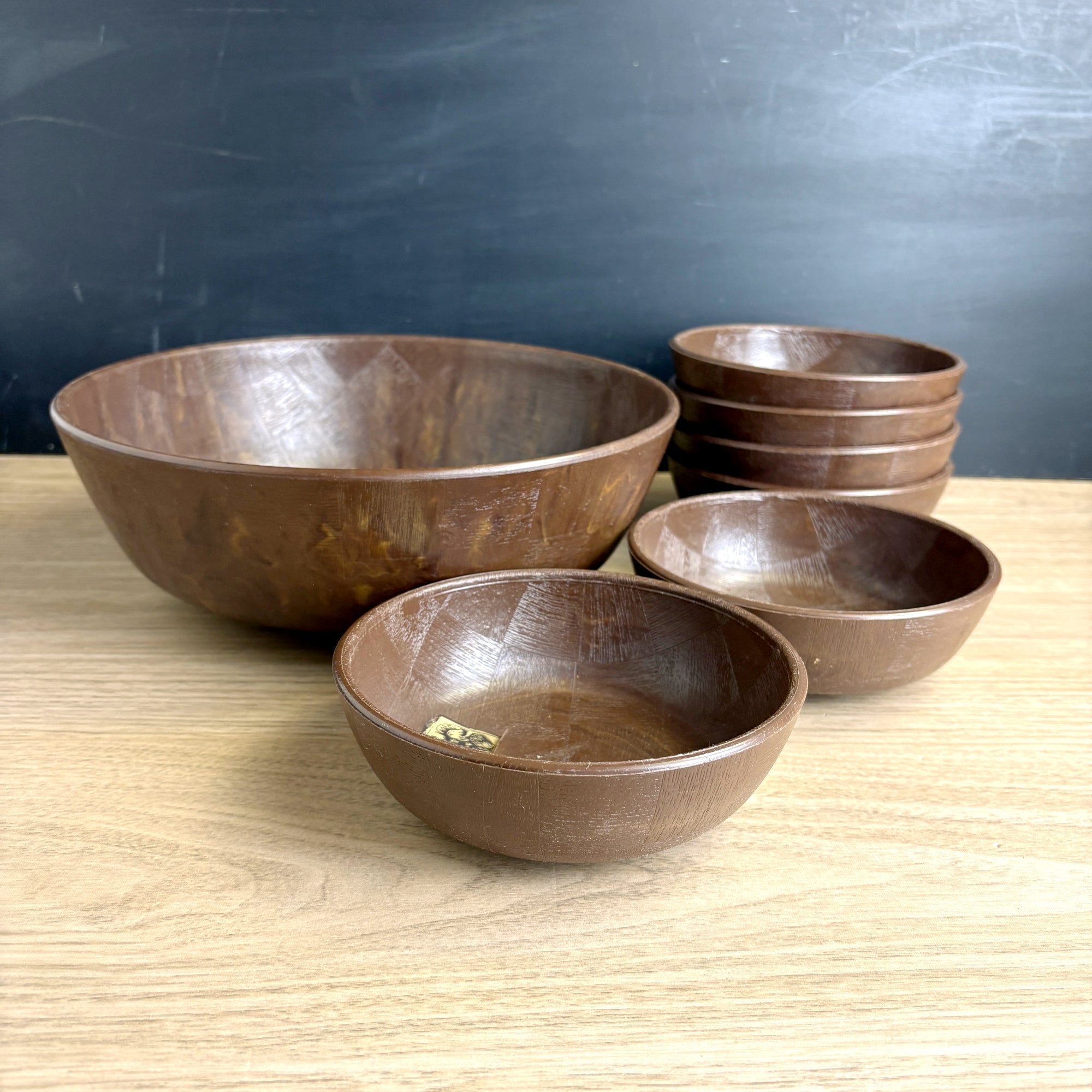 Vintage faux wood salad bowl set by Saladtime Inc - 1960s tableware