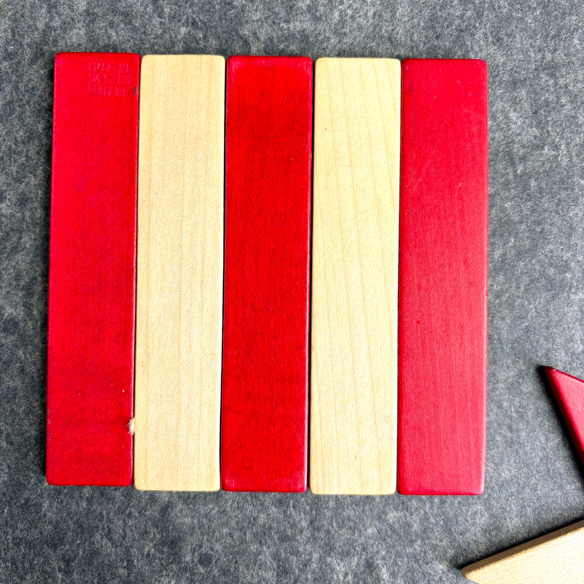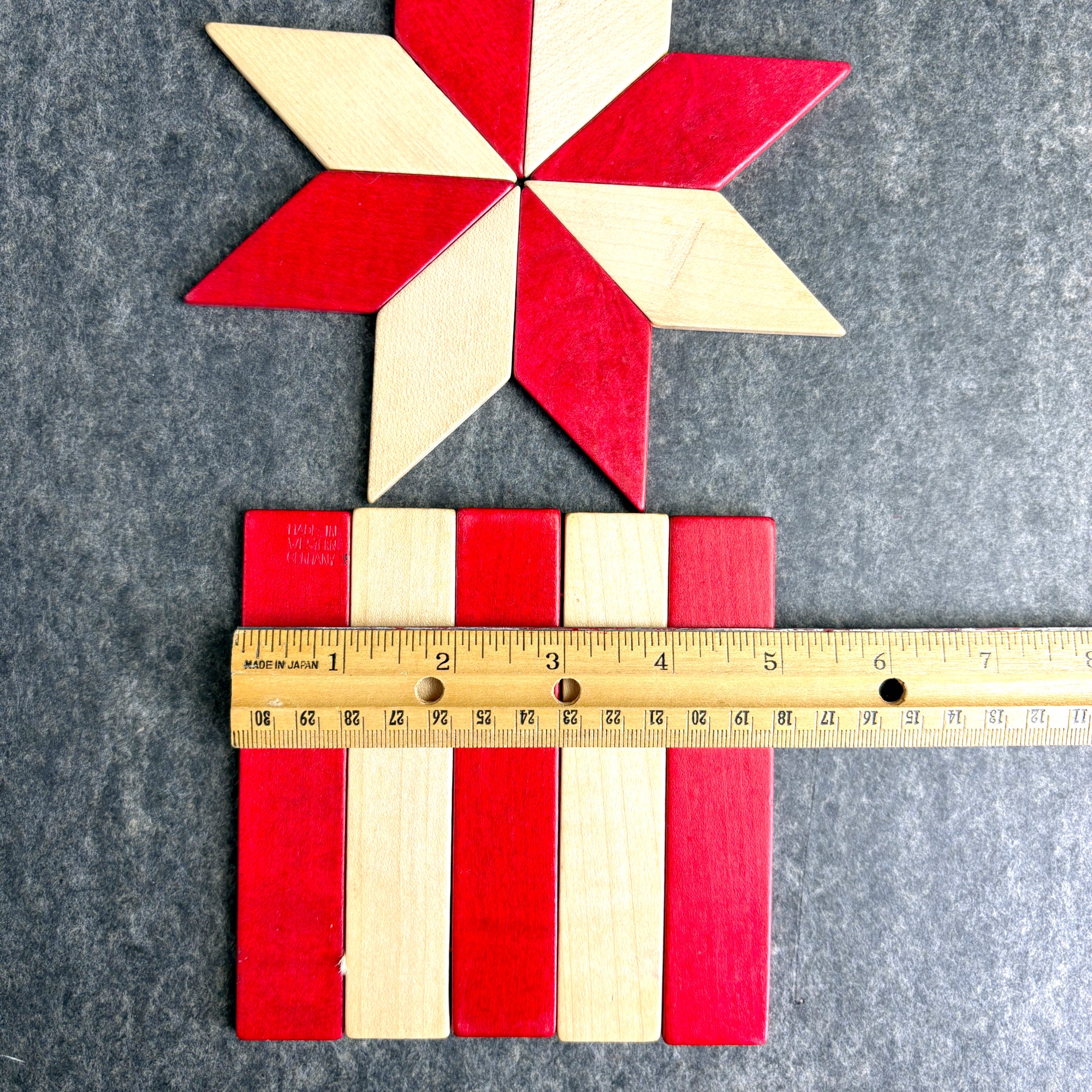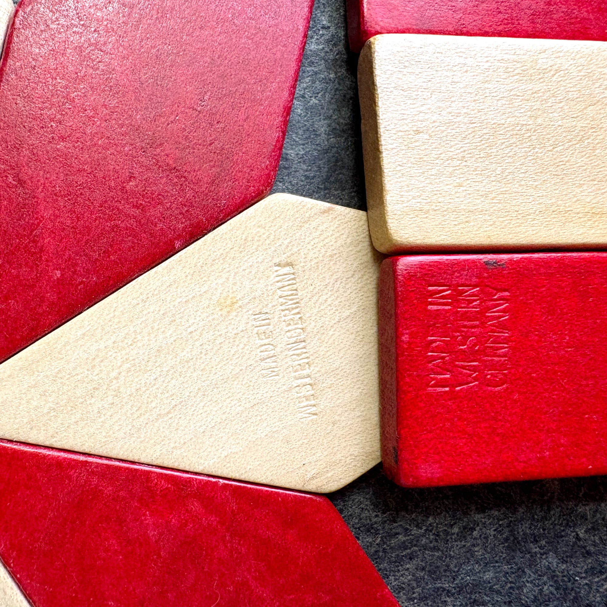 Pair of red and natural wood patchwork pattern trivets, made in Western Germany. Red stained and natural wood pieces are sewn together to make a flexible trivet to save your surfaces. Satiny smooth finish.