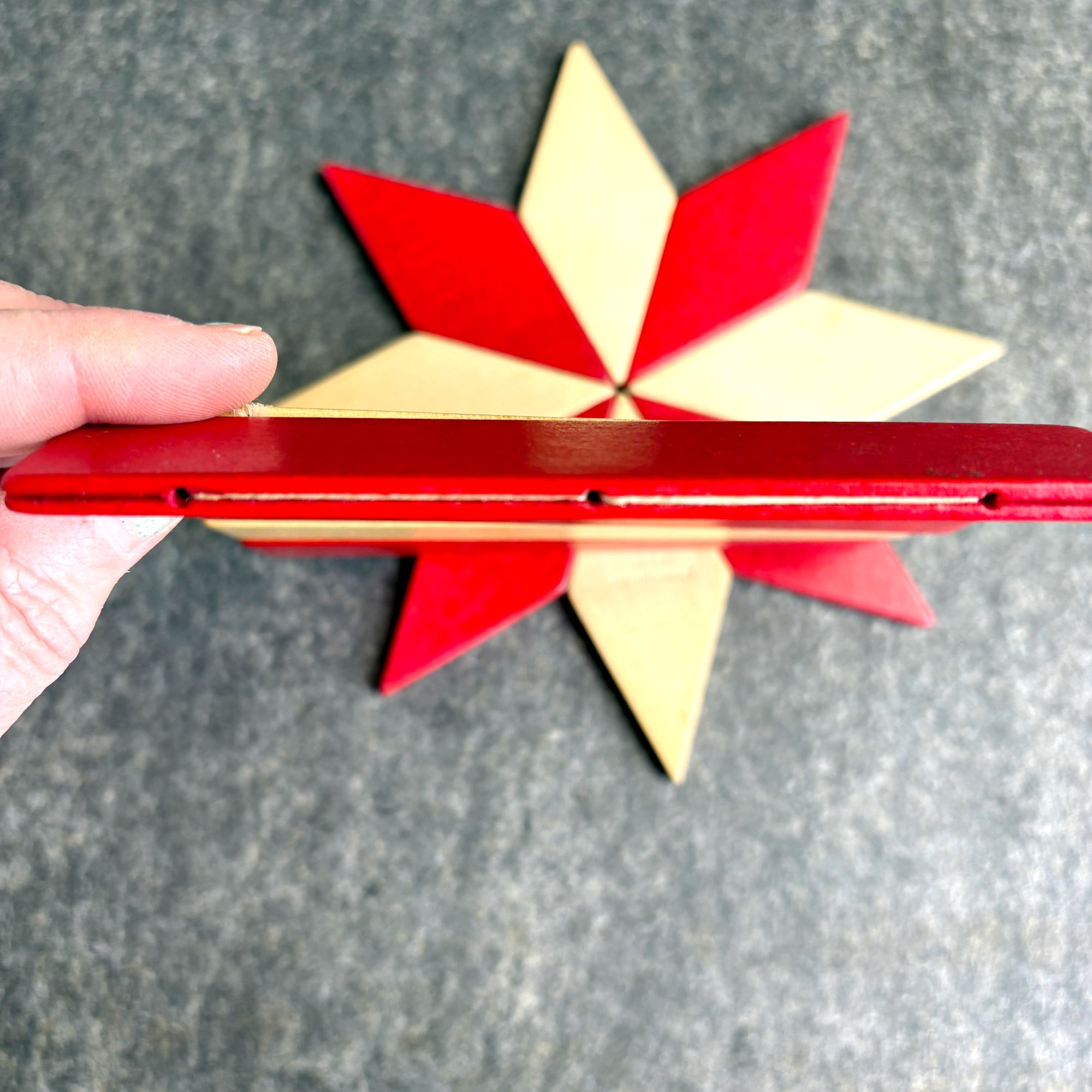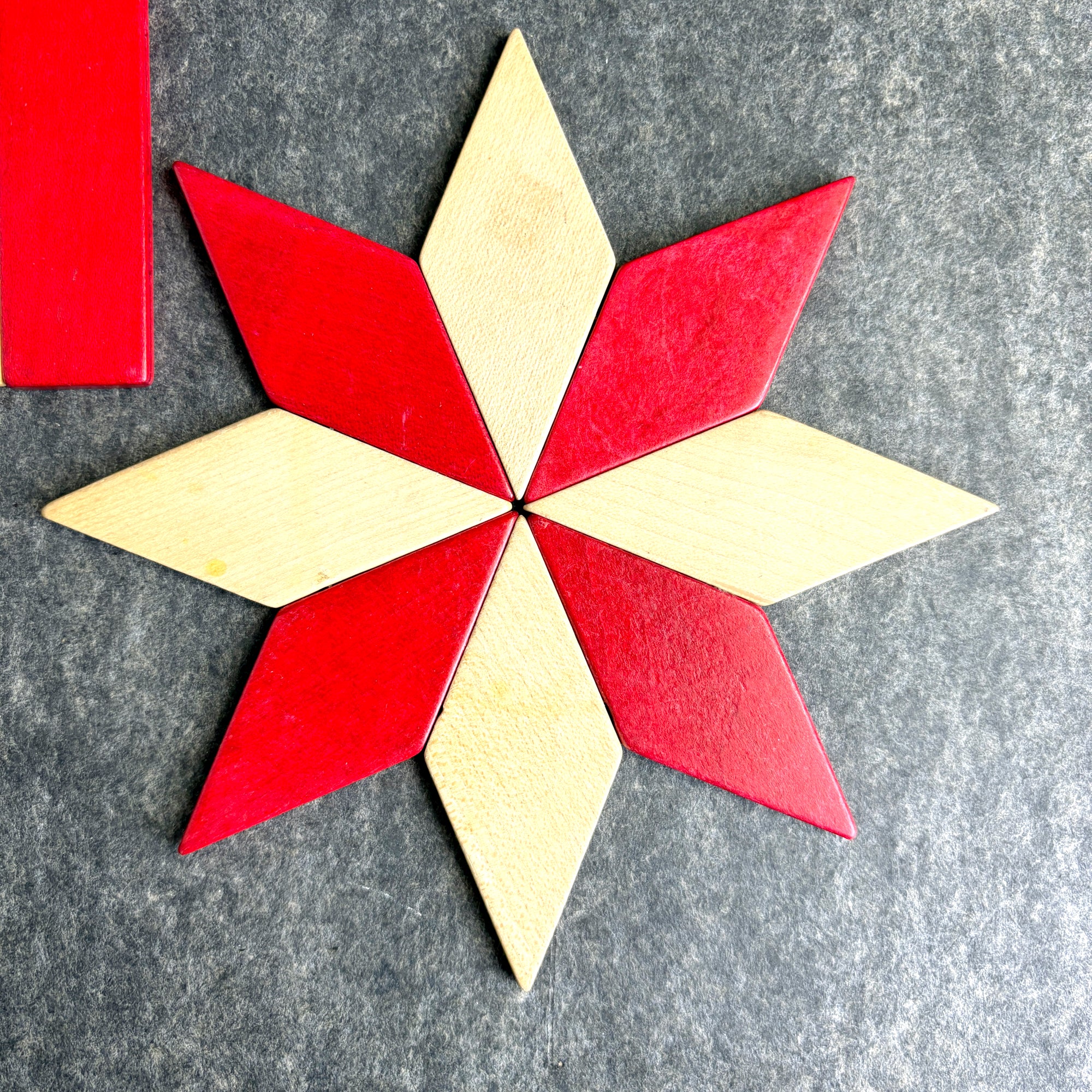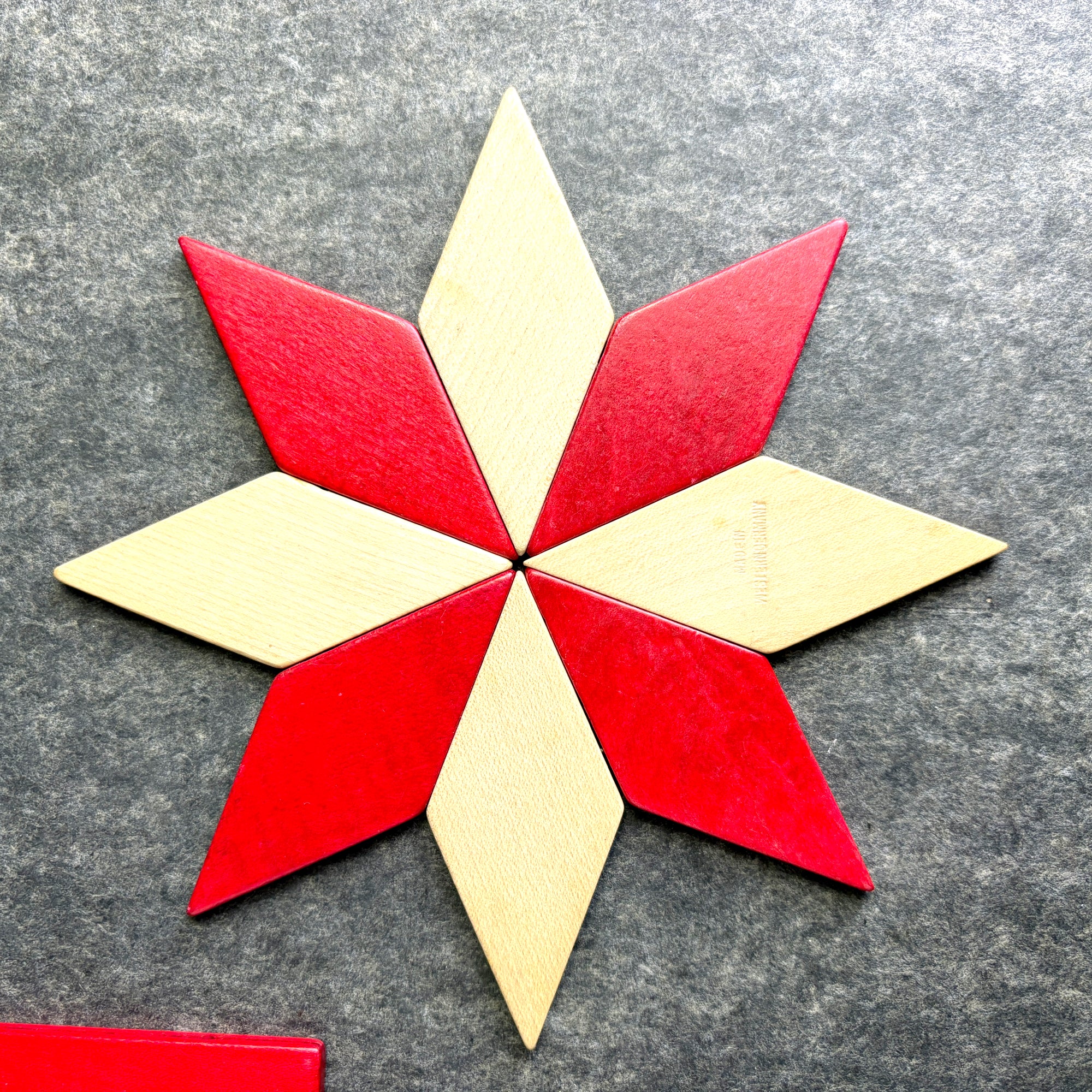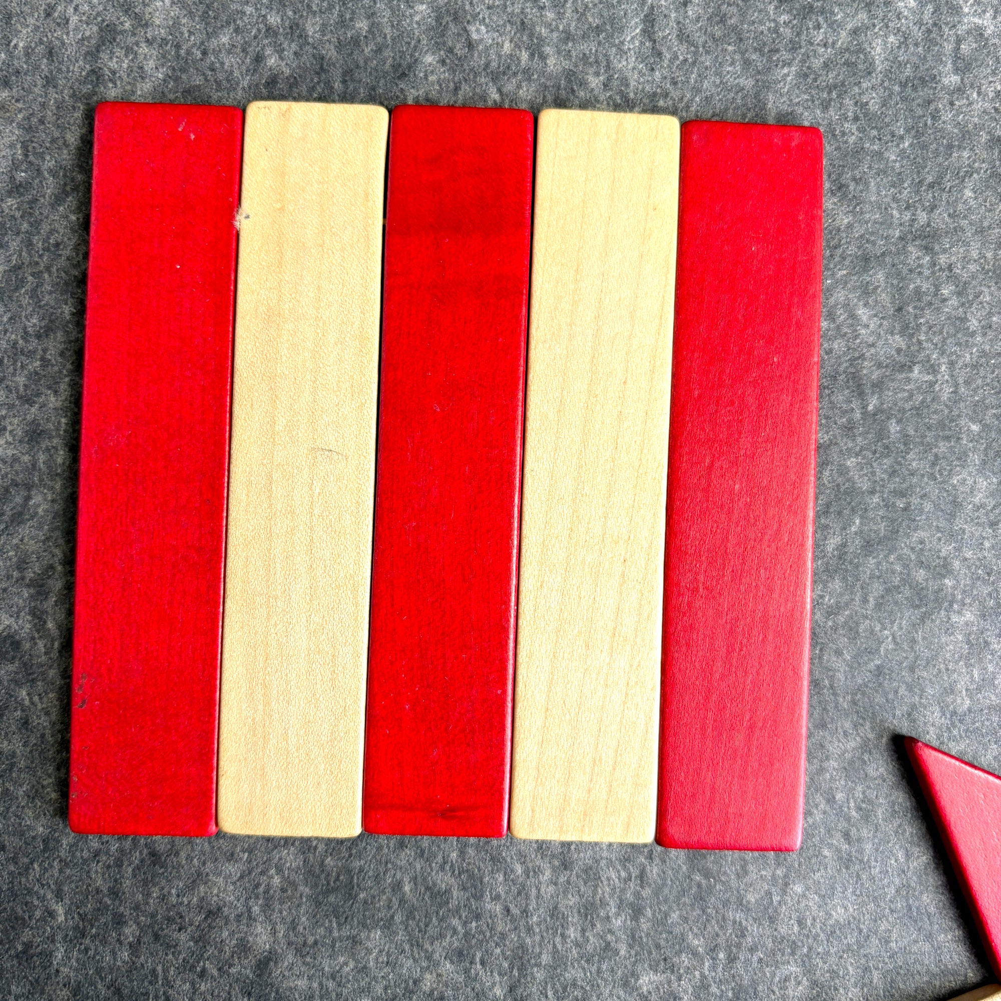 Pair of red and natural wood patchwork pattern trivets, made in Western Germany. Red stained and natural wood pieces are sewn together to make a flexible trivet to save your surfaces. Satiny smooth finish.