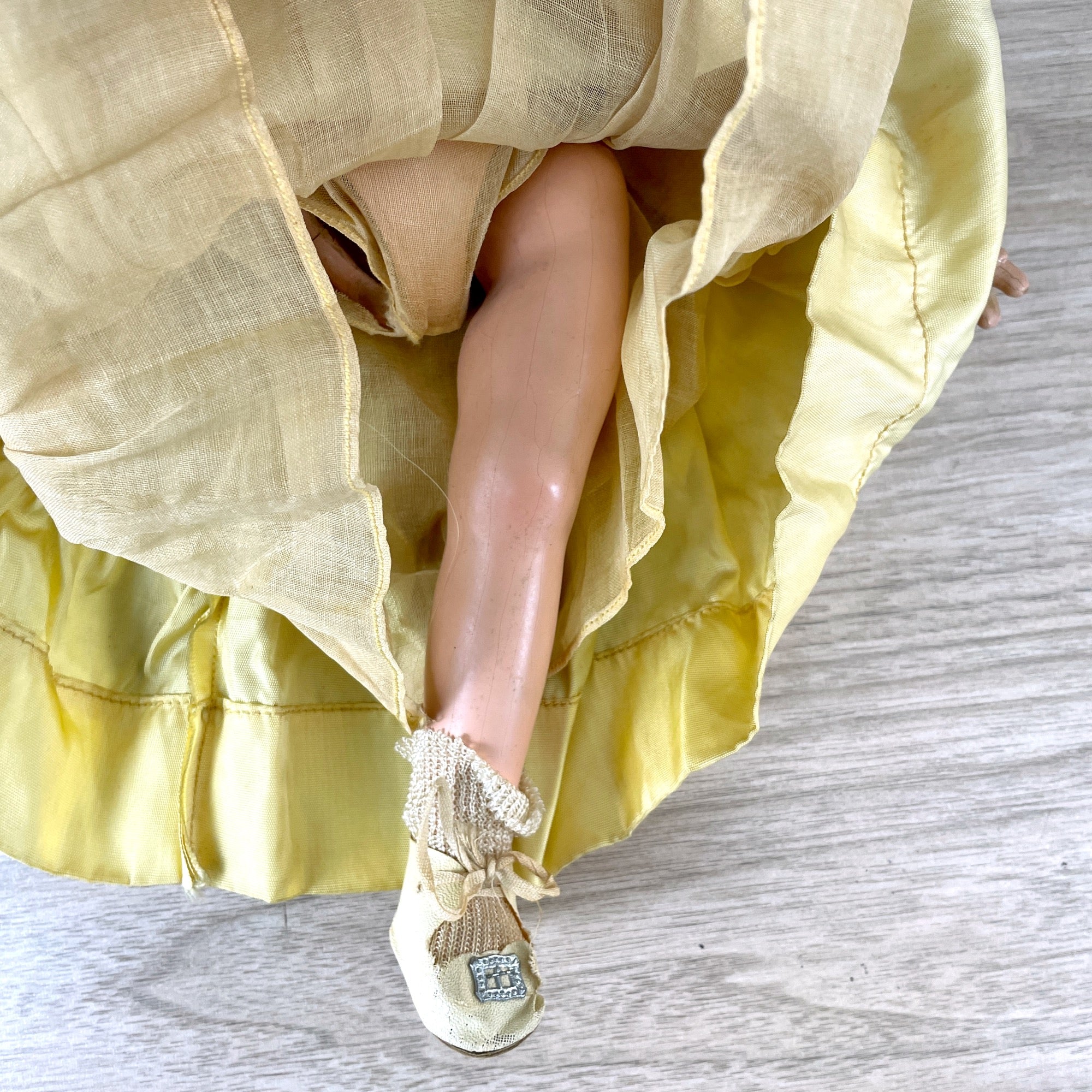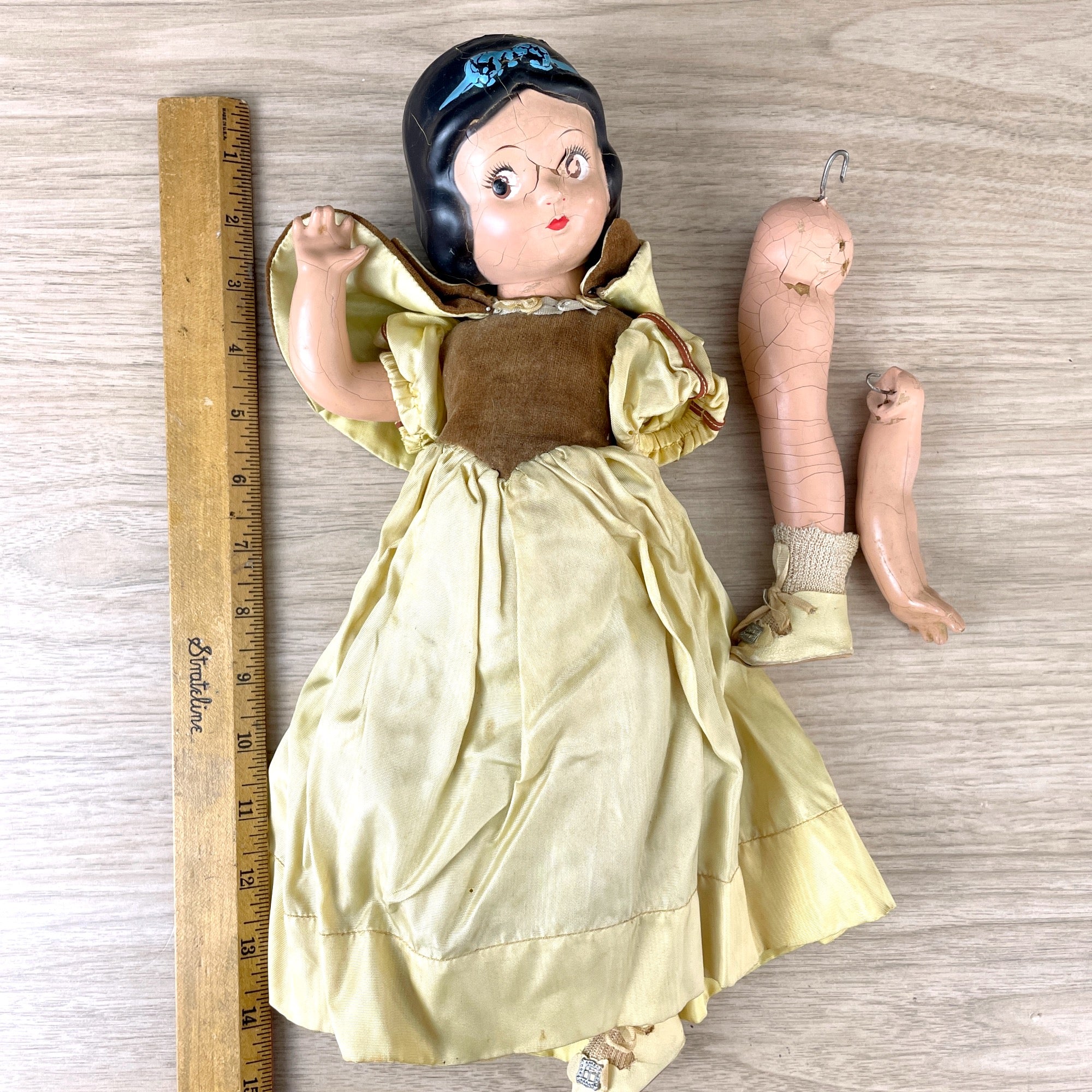 1930s Fully jointed composition Snow White doll made by Knickerbocker Toy Co out of NY. She is in her original clothing and is marked "Walt Disney" on the back of her neck and Knickerbocker Toy Co on her back. She needs some love and repairs as her joint connectors are no longer attached and there is crazing throughout.