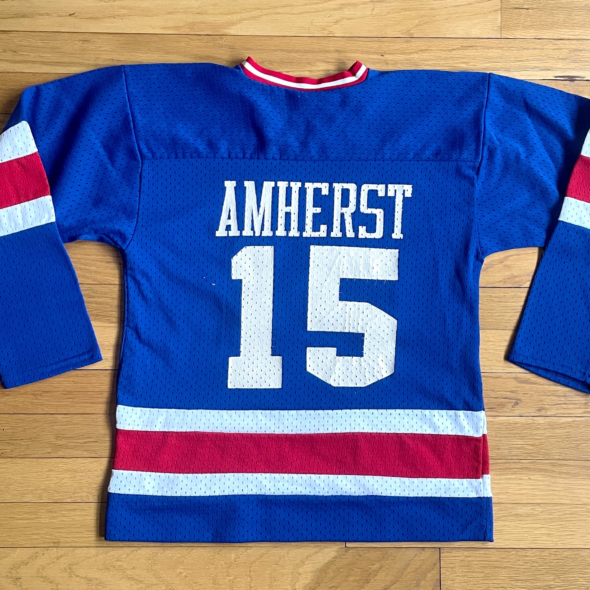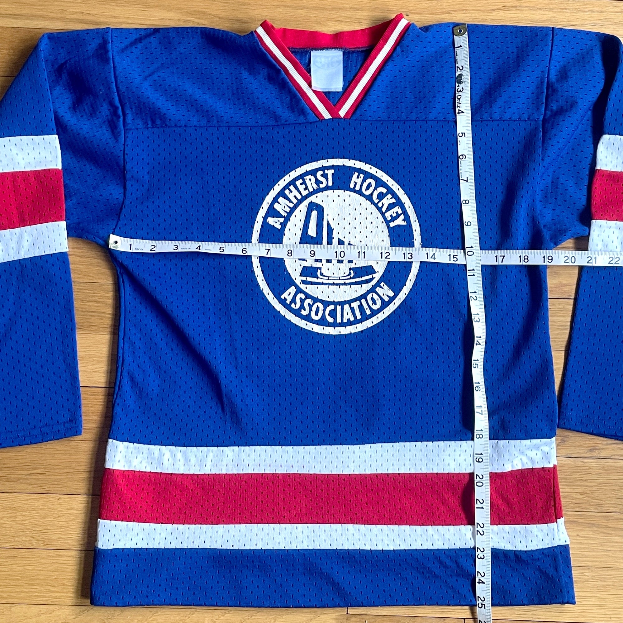 Vintage Amherst Hockey Association youth jersey. By Venus Knitting Mills. Royal blue, red and white.