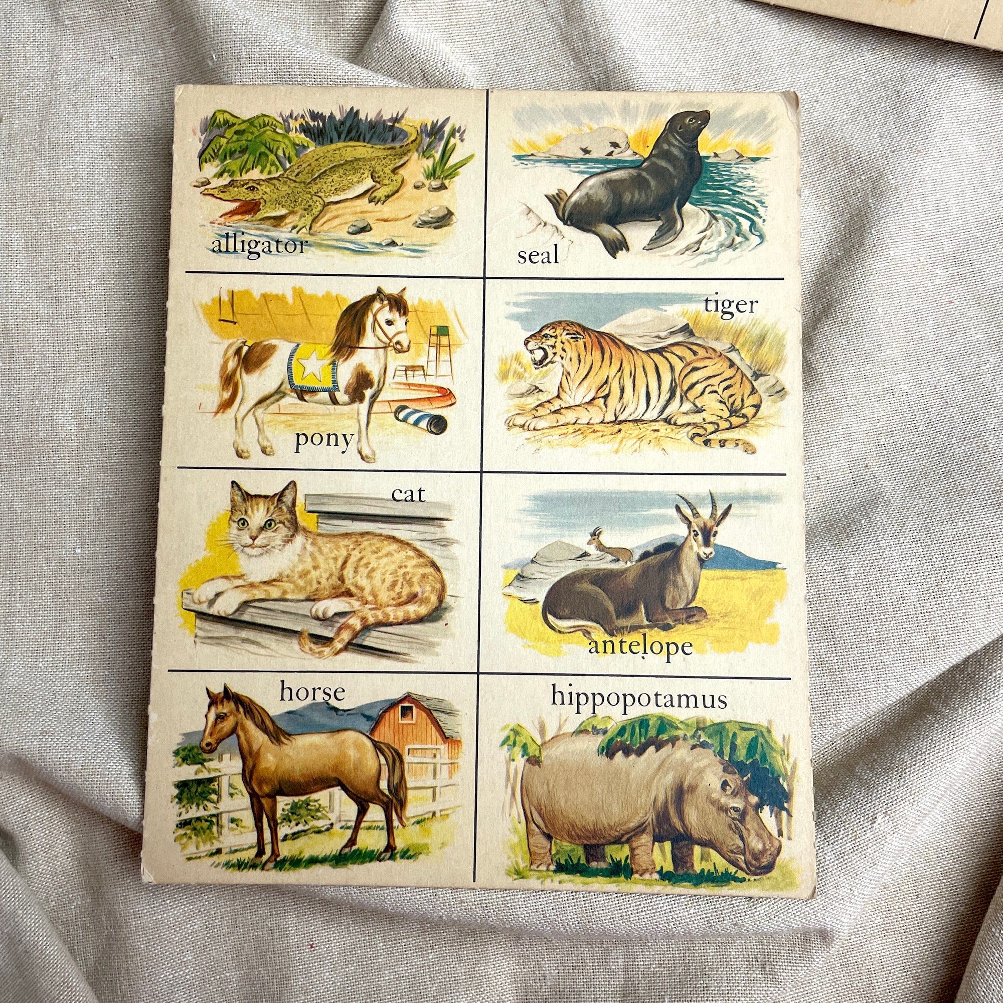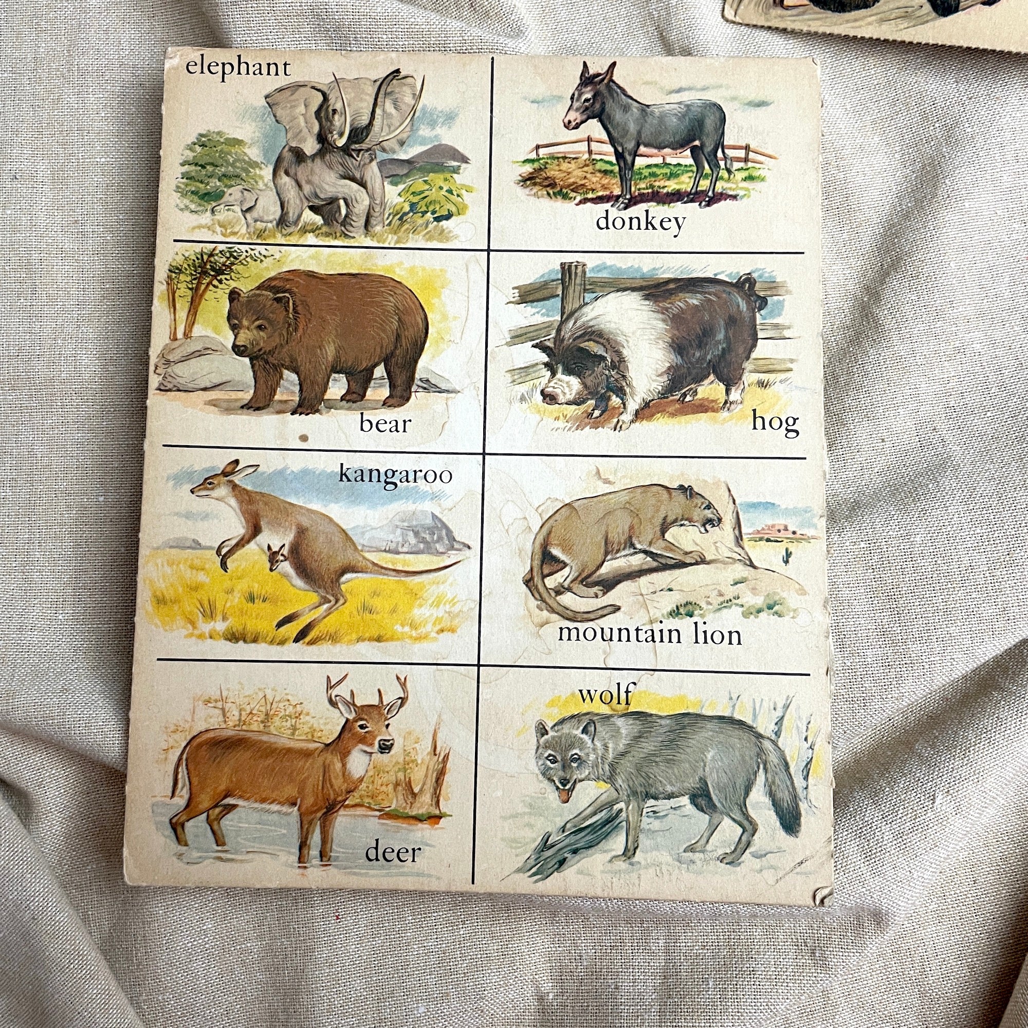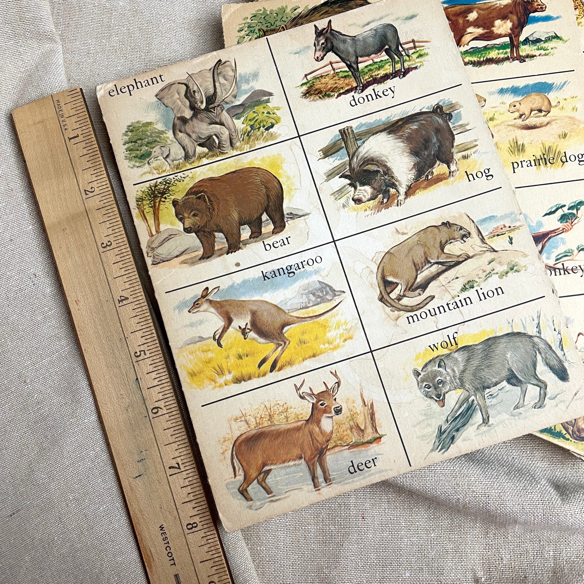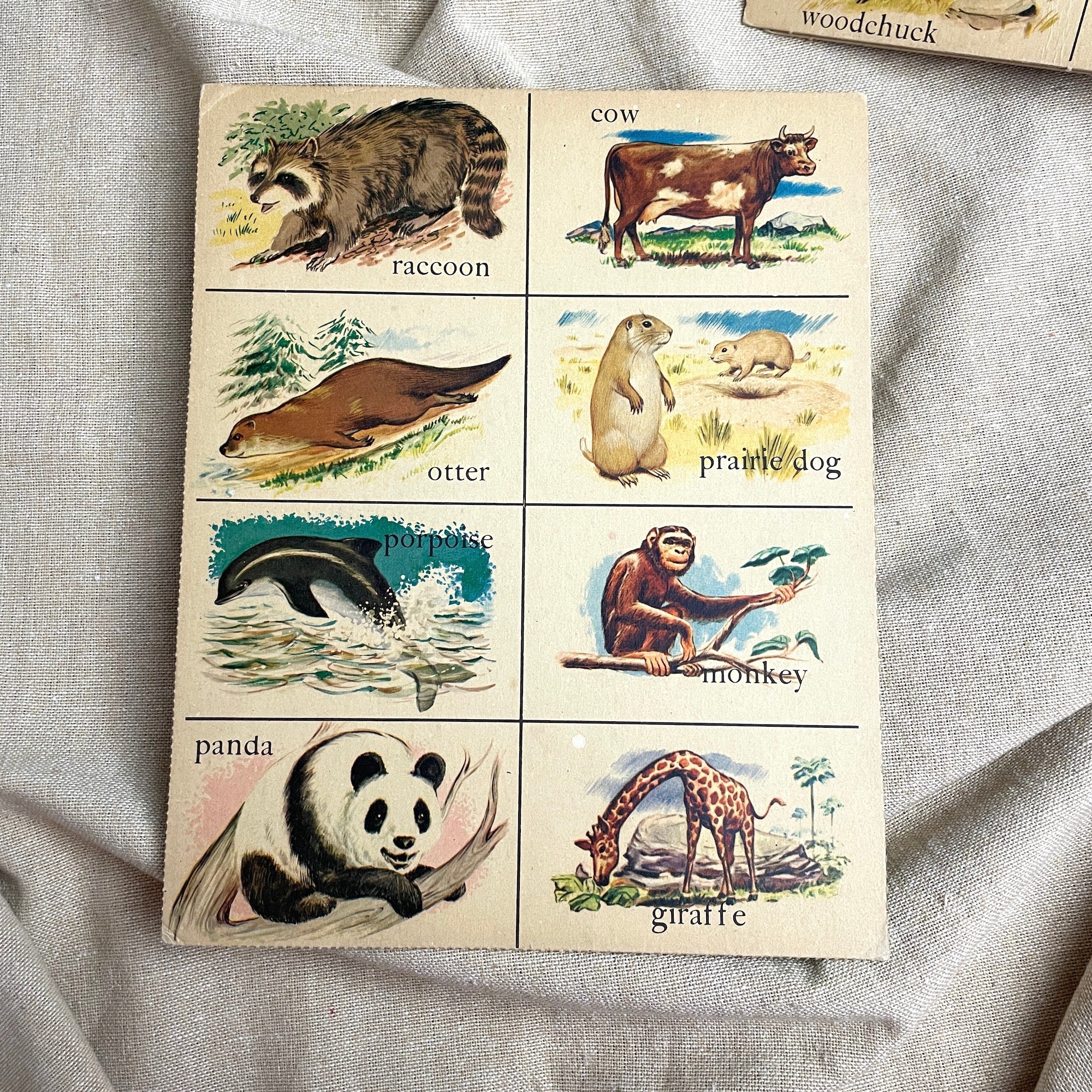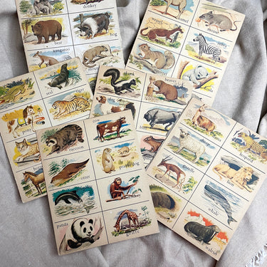 Vintage 1950s animal game cards from Milton Bradley Animal Lotto. Color illustrations on beige cardboard. Six cards, eight illustrations on the front, animal names only on the back. They would be adorable framed.