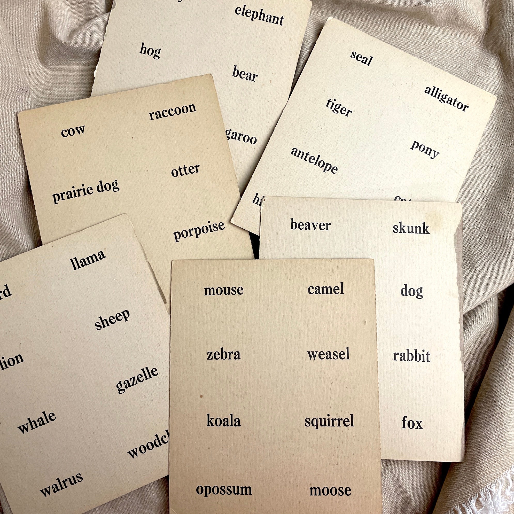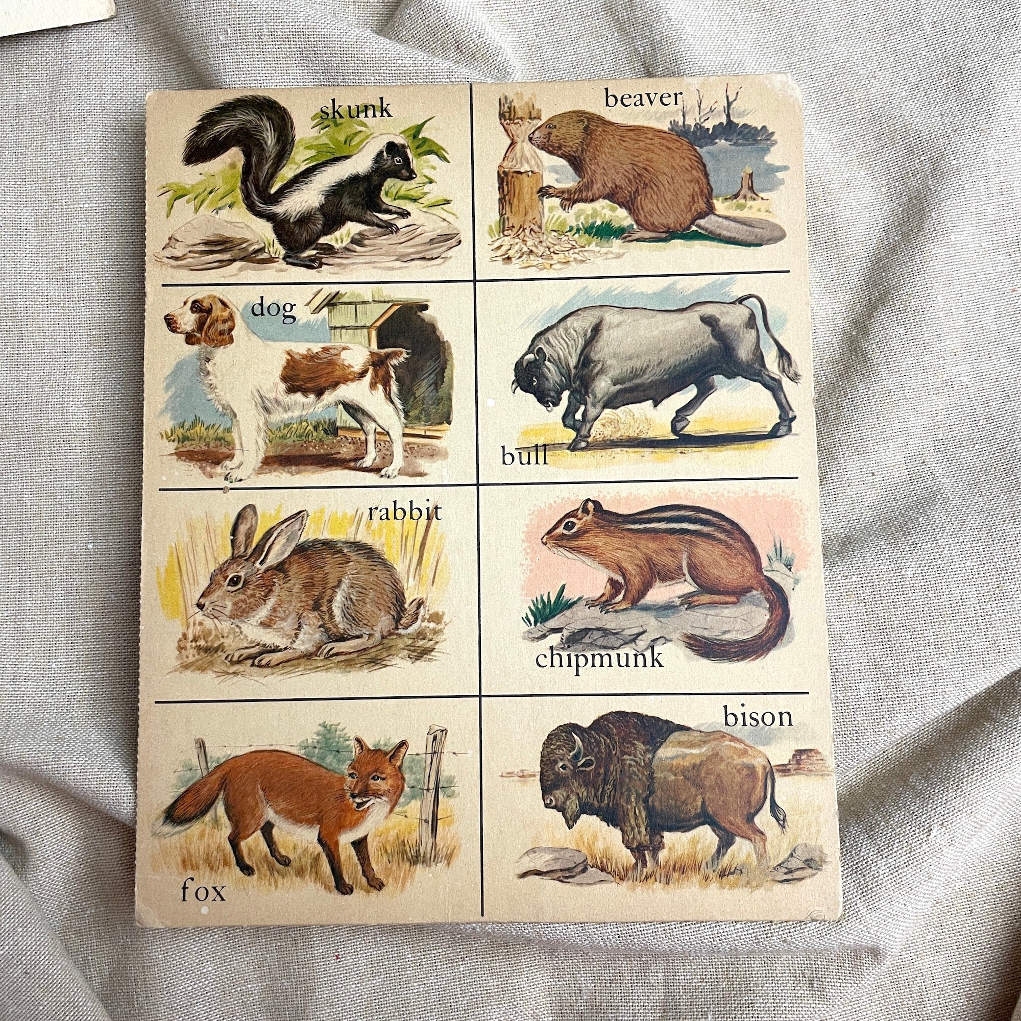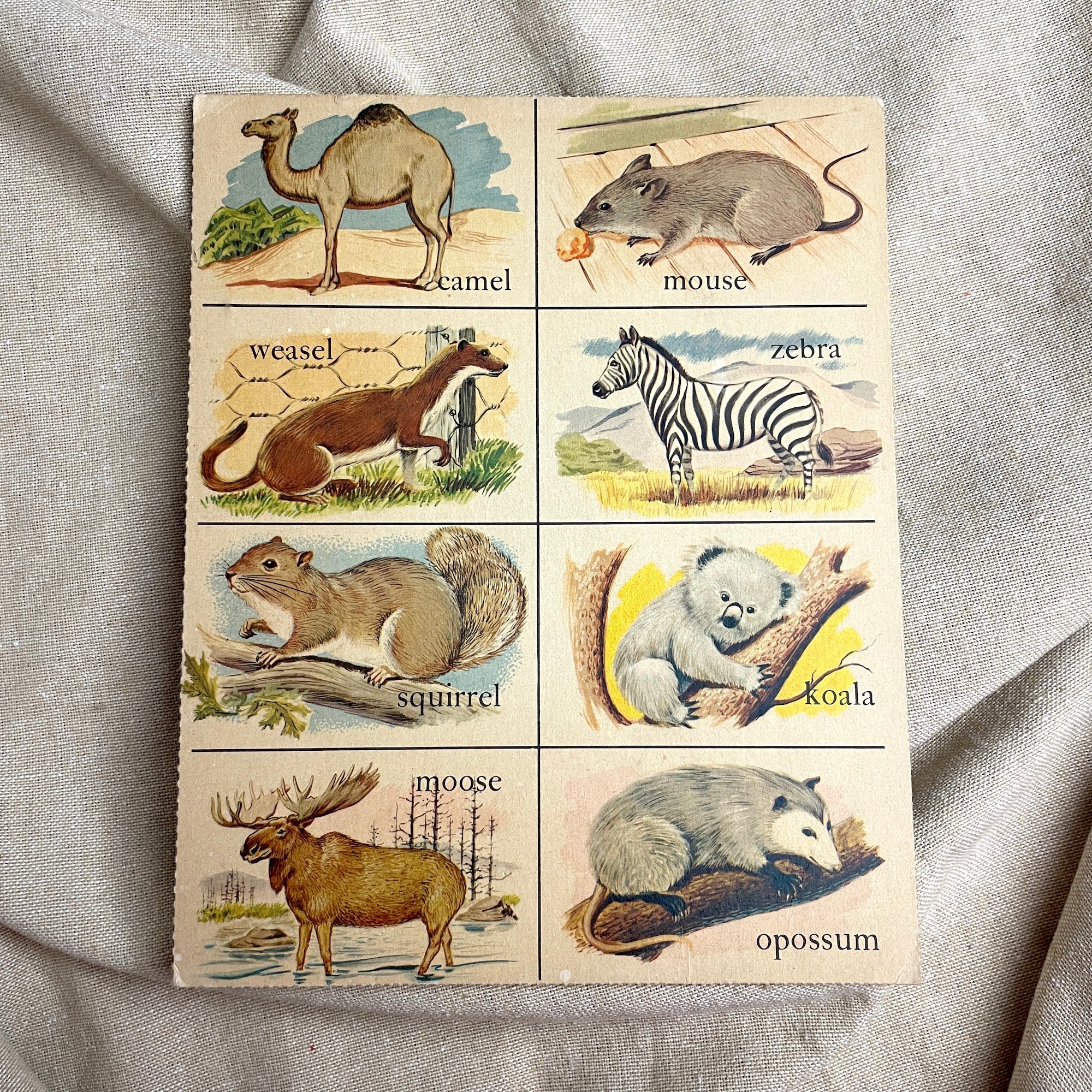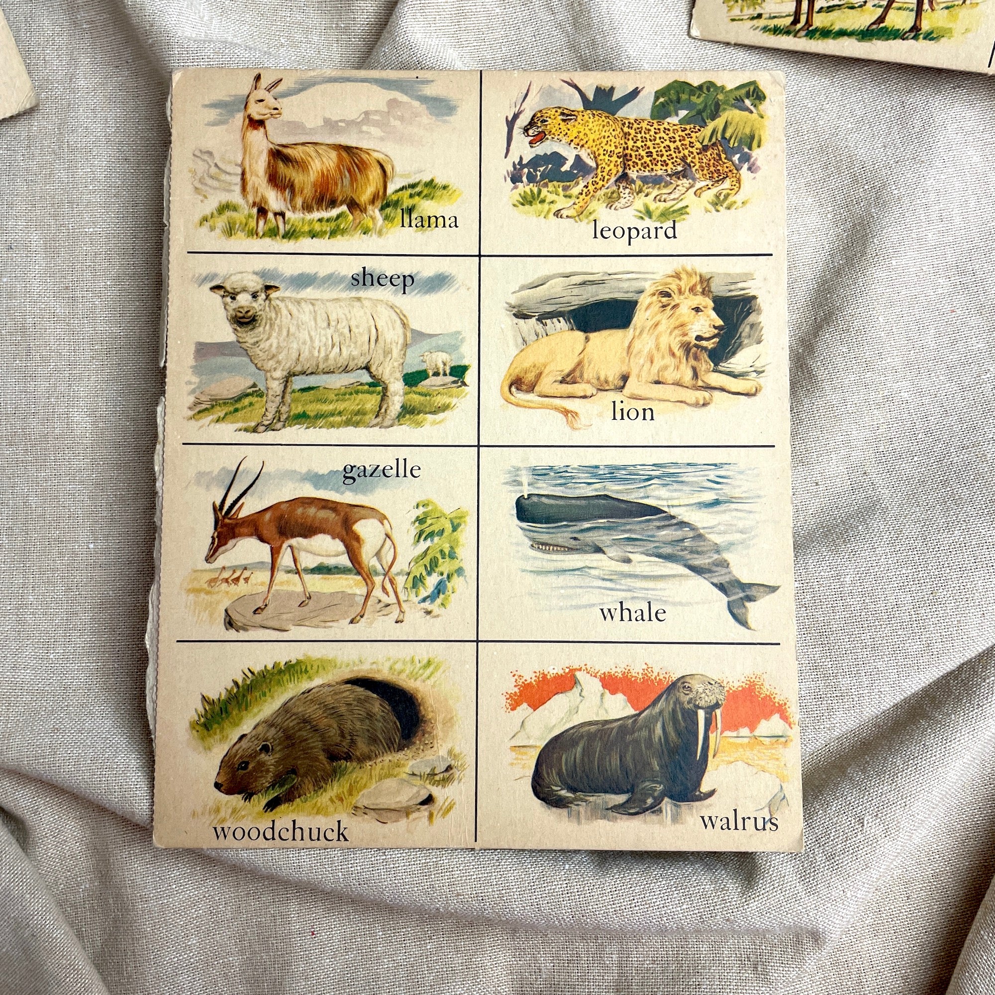Vintage 1950s animal game cards from Milton Bradley Animal Lotto. Color illustrations on beige cardboard. Six cards, eight illustrations on the front, animal names only on the back. They would be adorable framed.