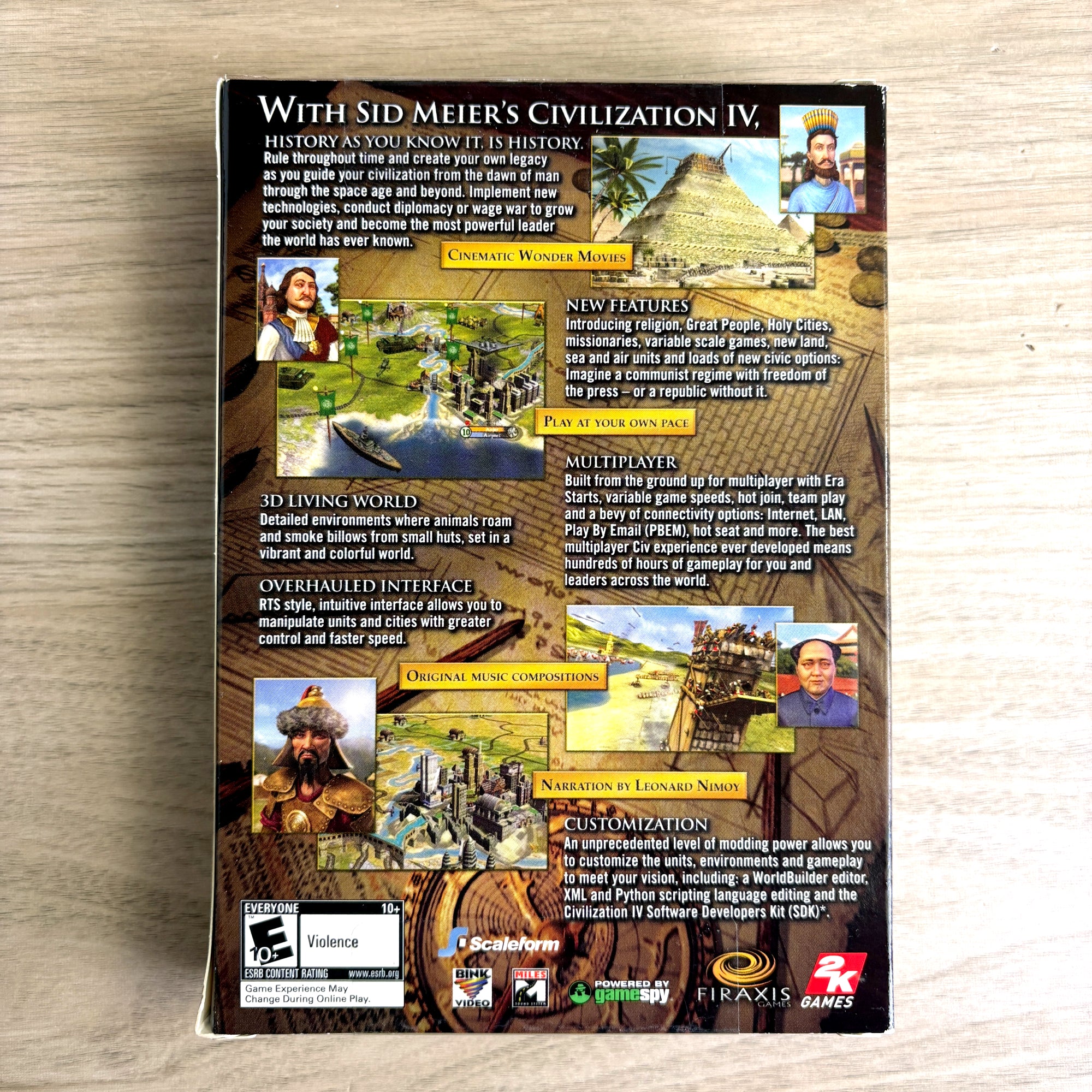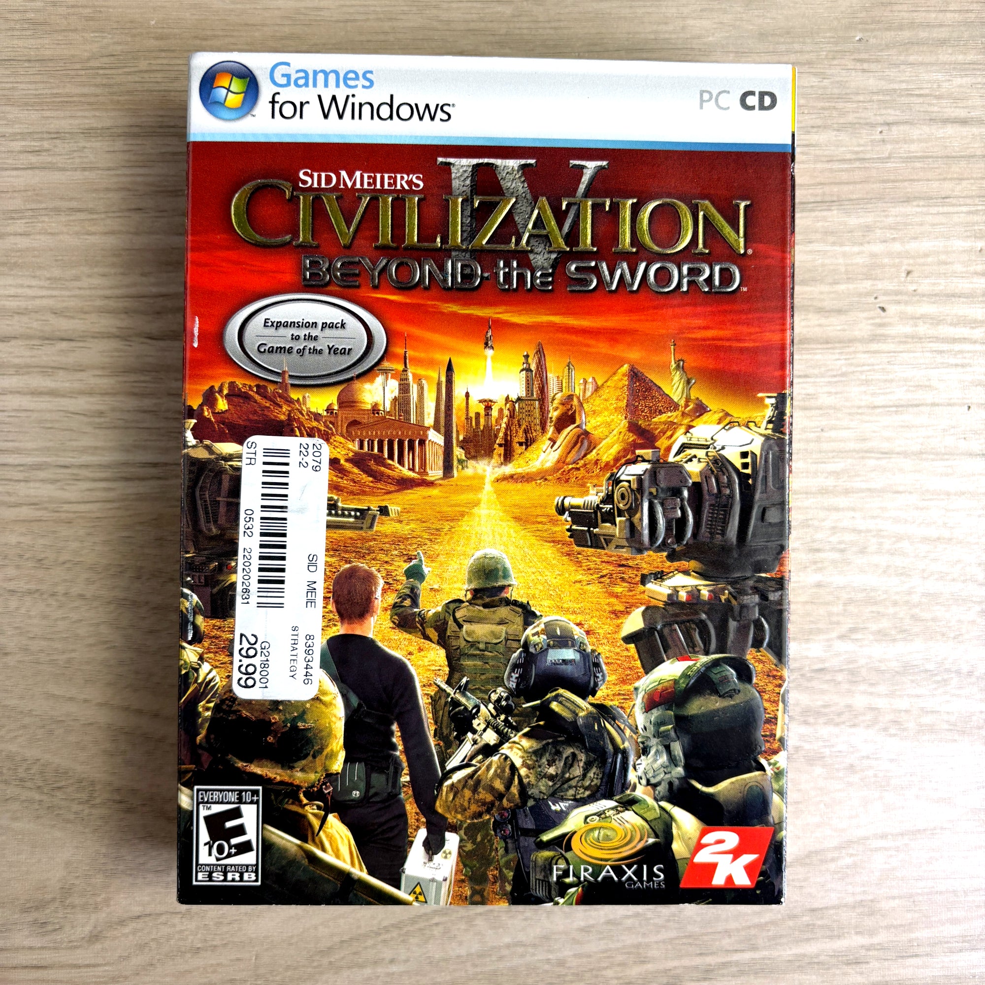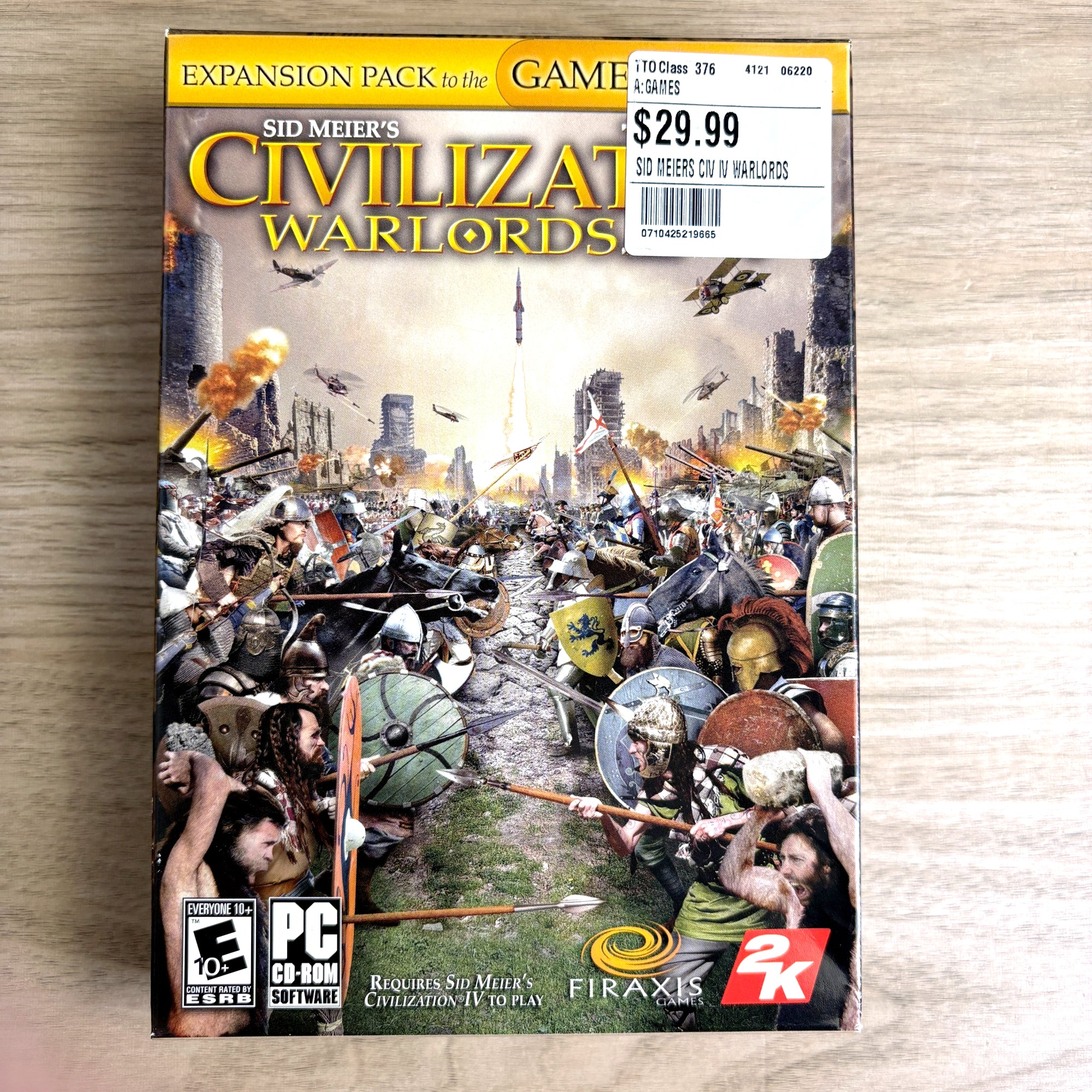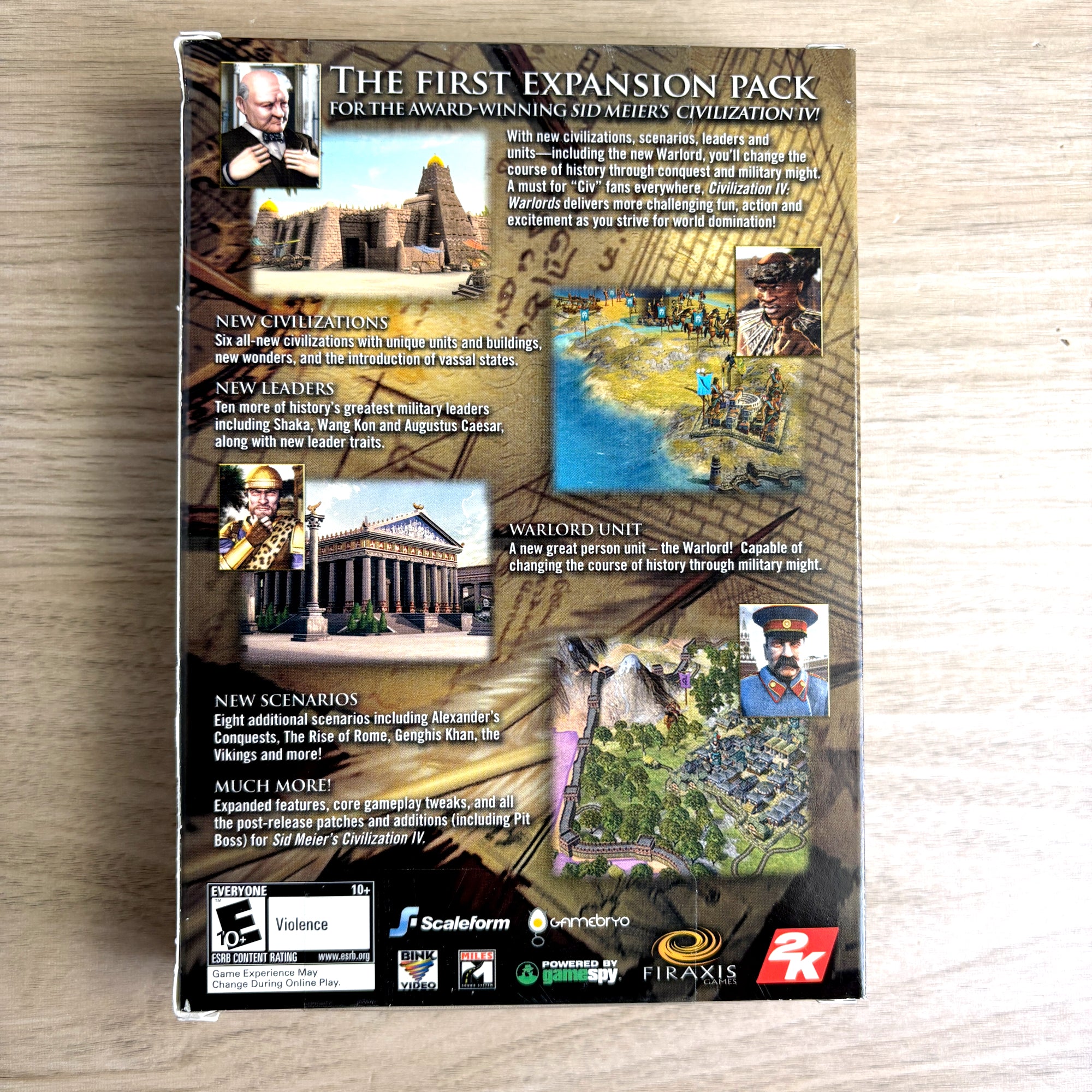 Sid Meier's Civilization games by FIRAXIS games - Civilization III (2001) with Conquests (2003) expansion pack, includes instruction manuals for both. Civilization IV (2005) with Beyond the Sword (2005-2007) and Warlords (2006) expansion packs - all in sealed packages. Civilization V in sealed package. Rated Everyone 10+.