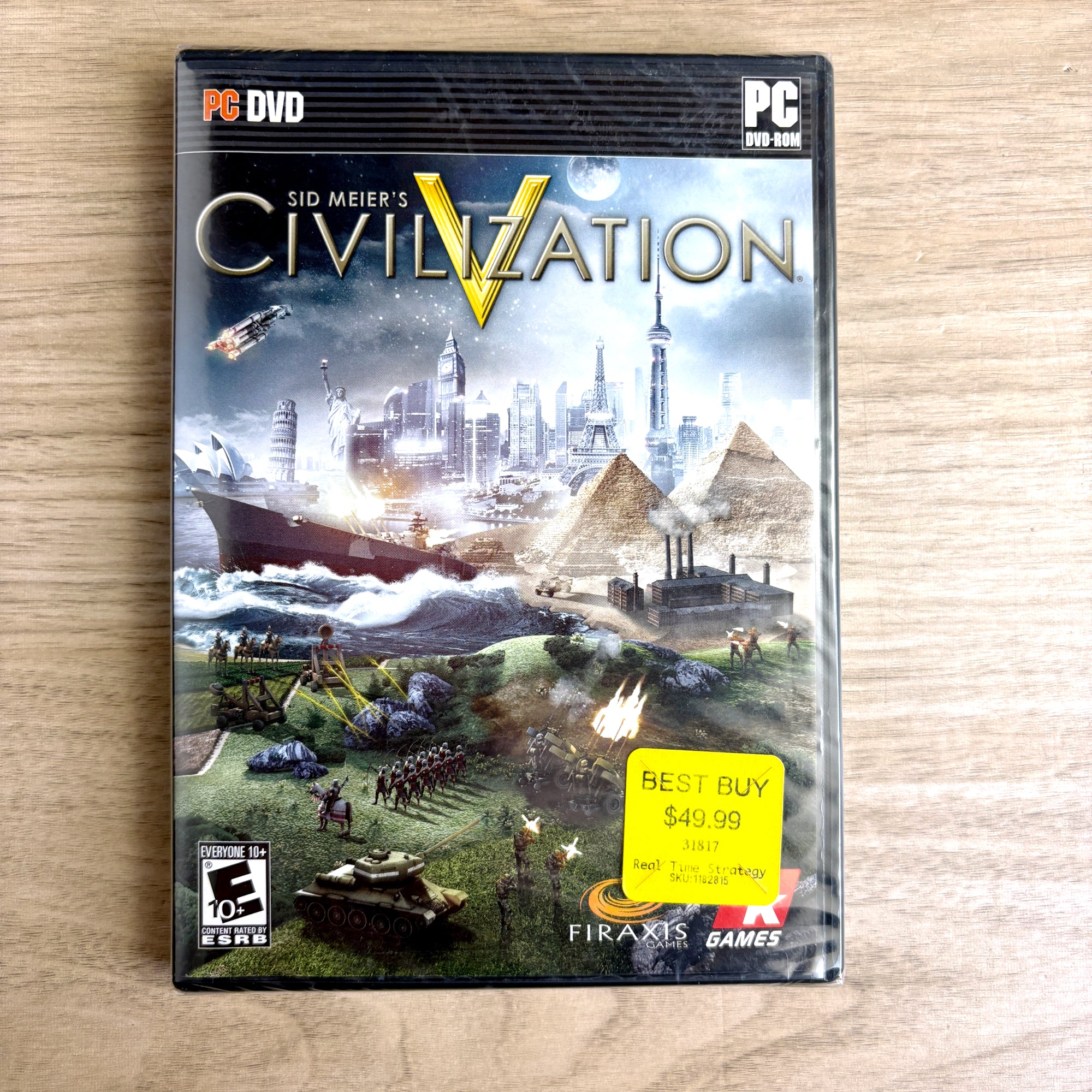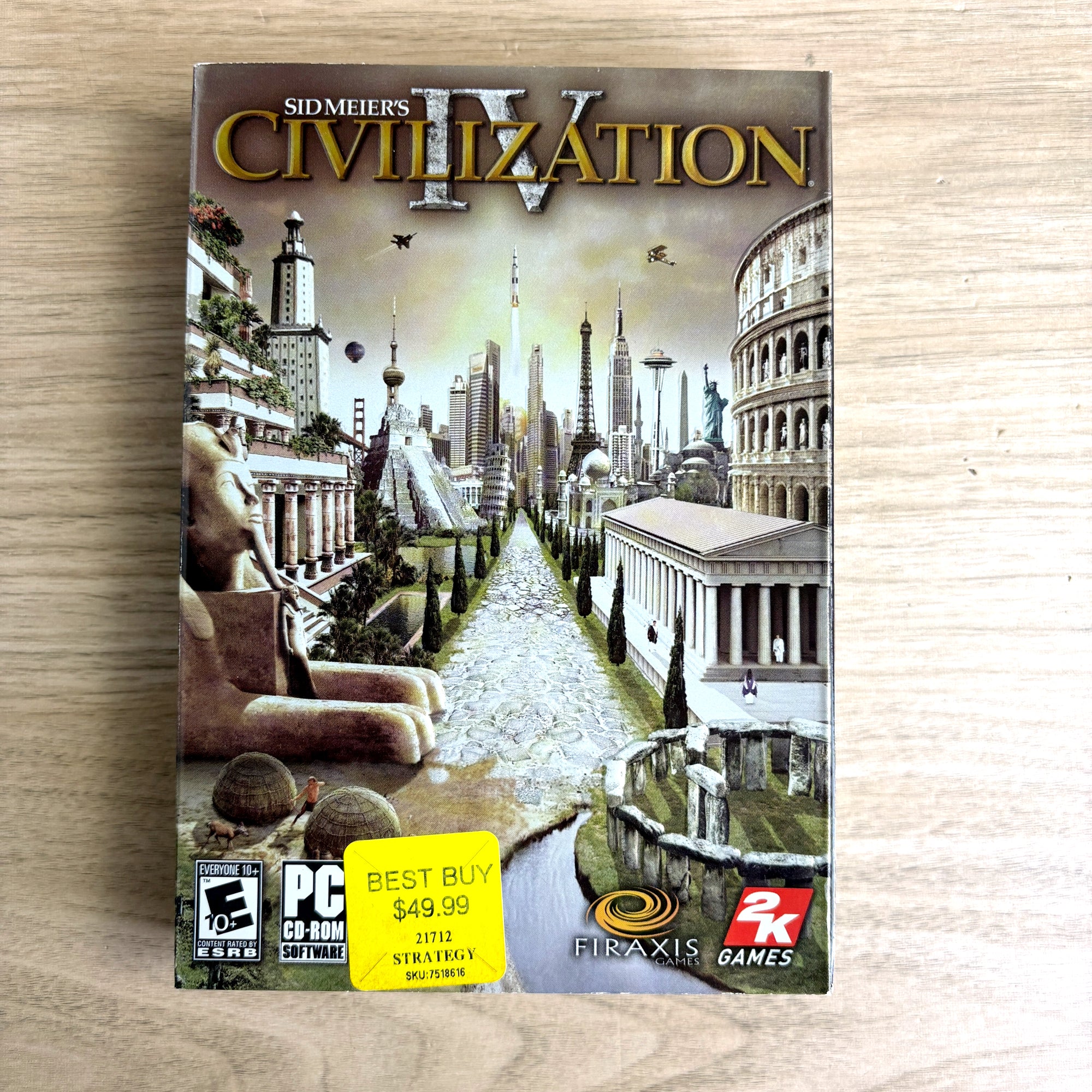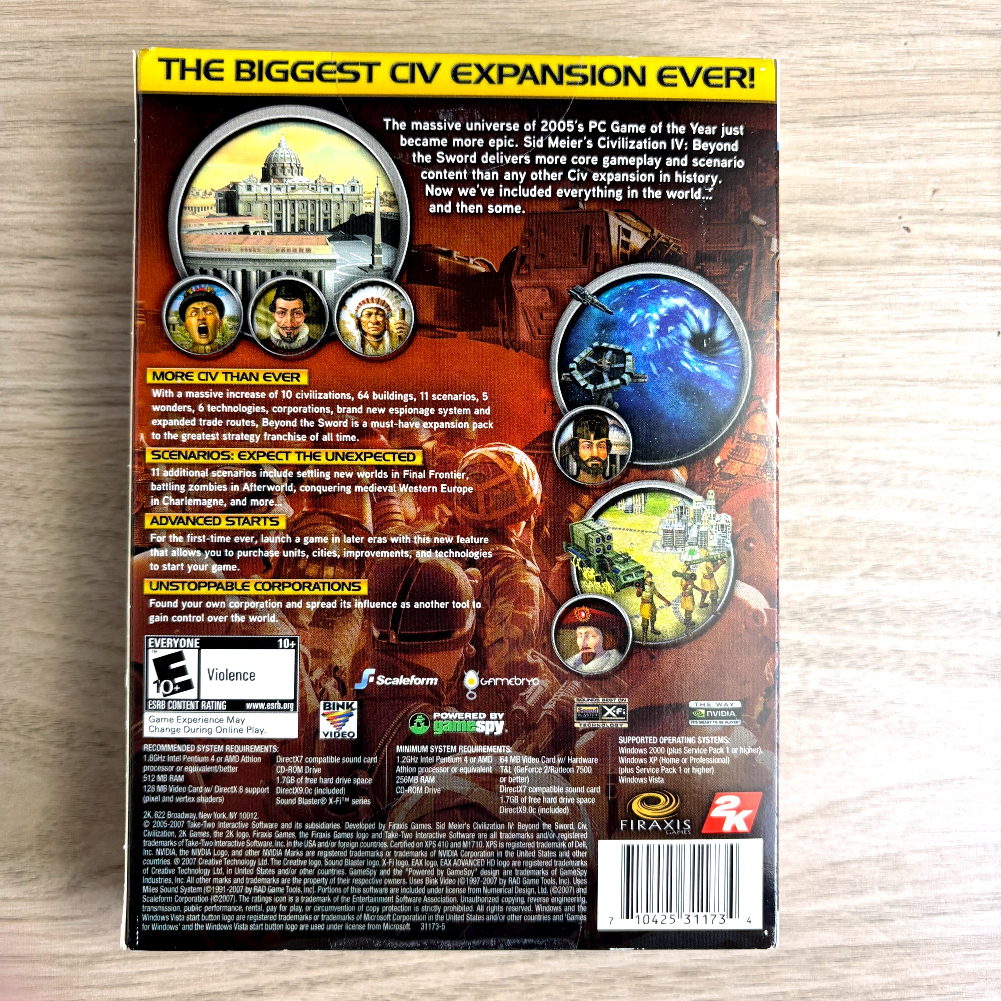 Sid Meier's Civilization games by FIRAXIS games - Civilization III (2001) with Conquests (2003) expansion pack, includes instruction manuals for both. Civilization IV (2005) with Beyond the Sword (2005-2007) and Warlords (2006) expansion packs - all in sealed packages. Civilization V in sealed package. Rated Everyone 10+.