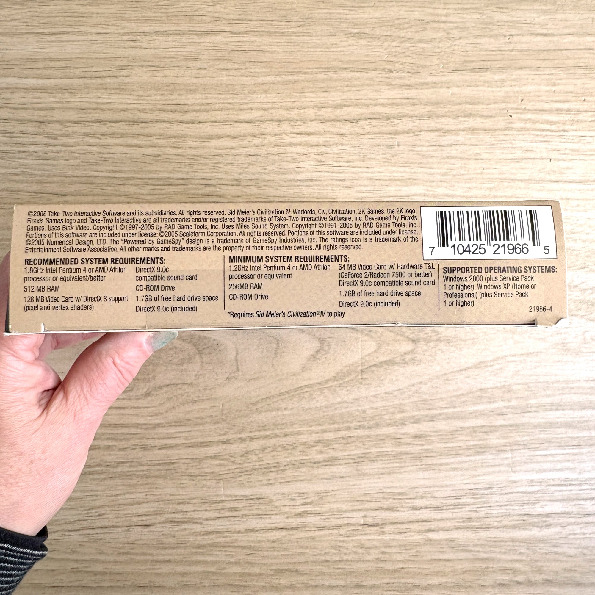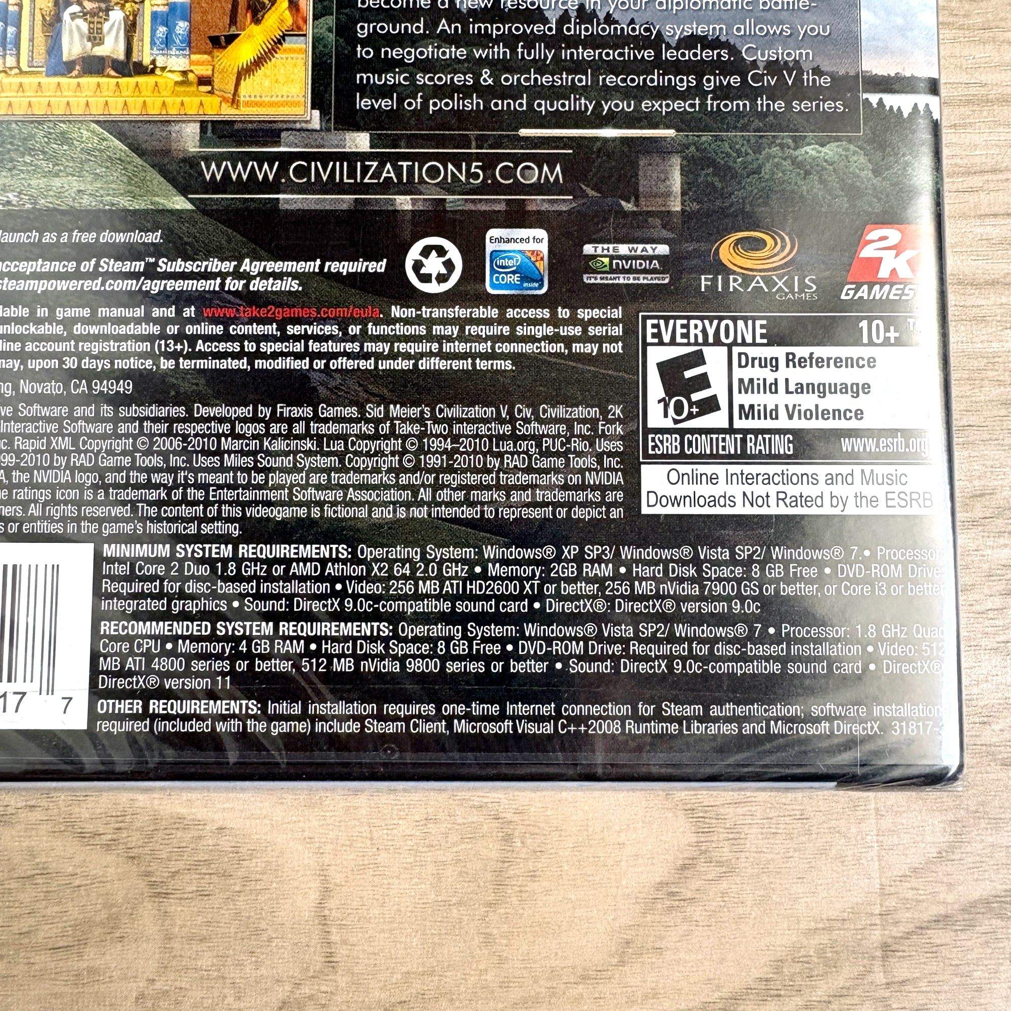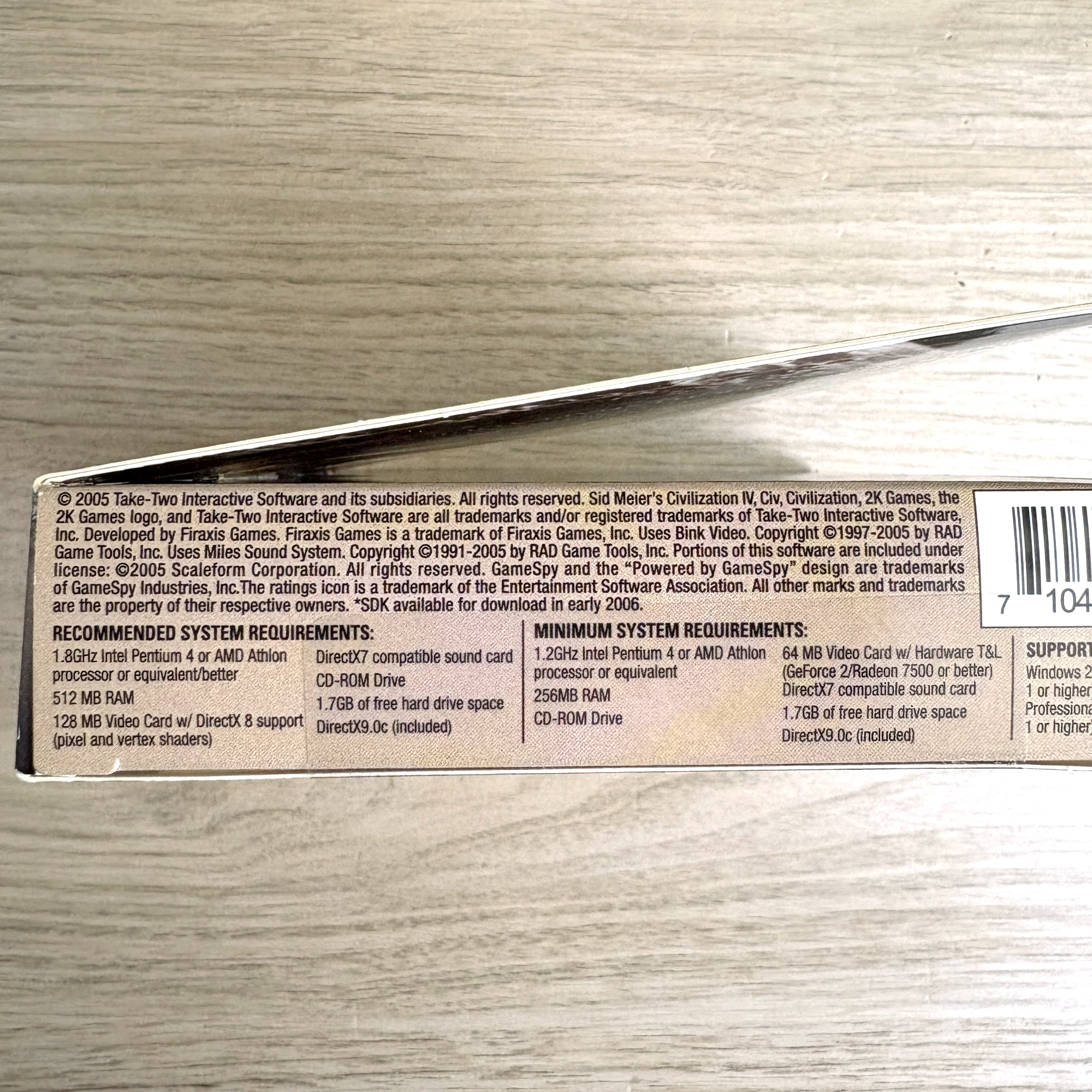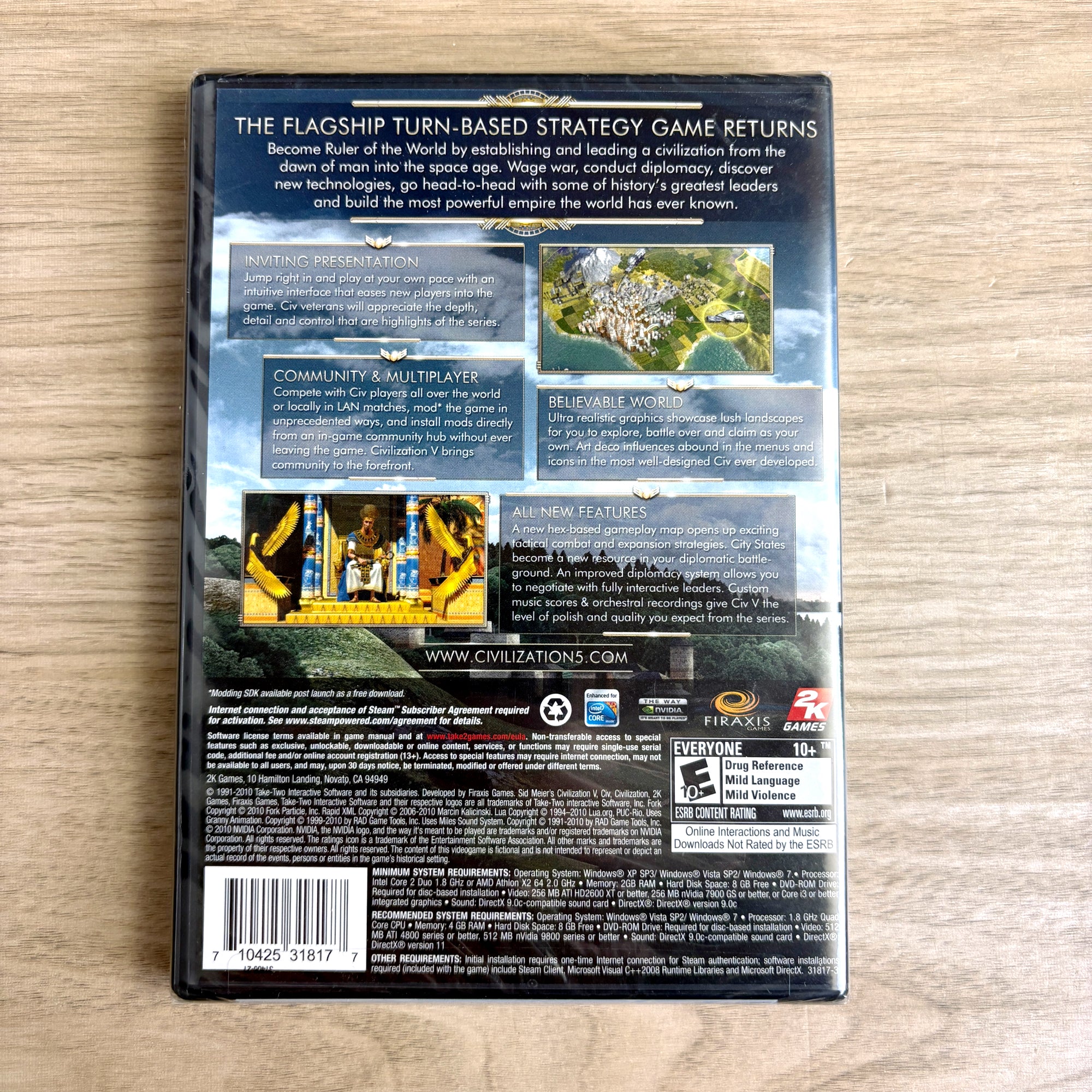 Sid Meier's Civilization games by FIRAXIS games - Civilization III (2001) with Conquests (2003) expansion pack, includes instruction manuals for both. Civilization IV (2005) with Beyond the Sword (2005-2007) and Warlords (2006) expansion packs - all in sealed packages. Civilization V in sealed package. Rated Everyone 10+.