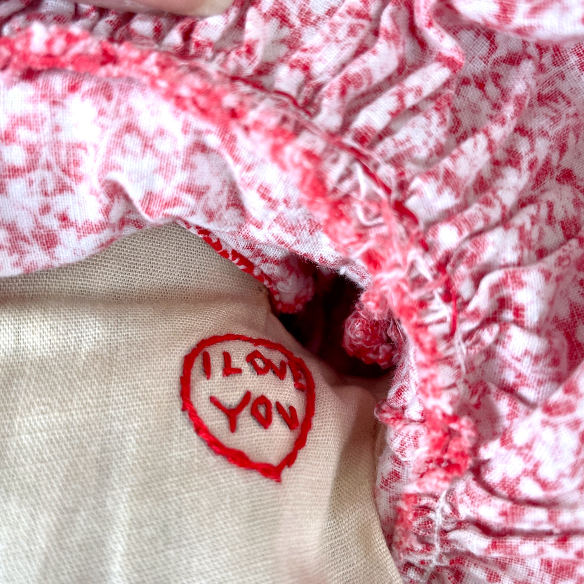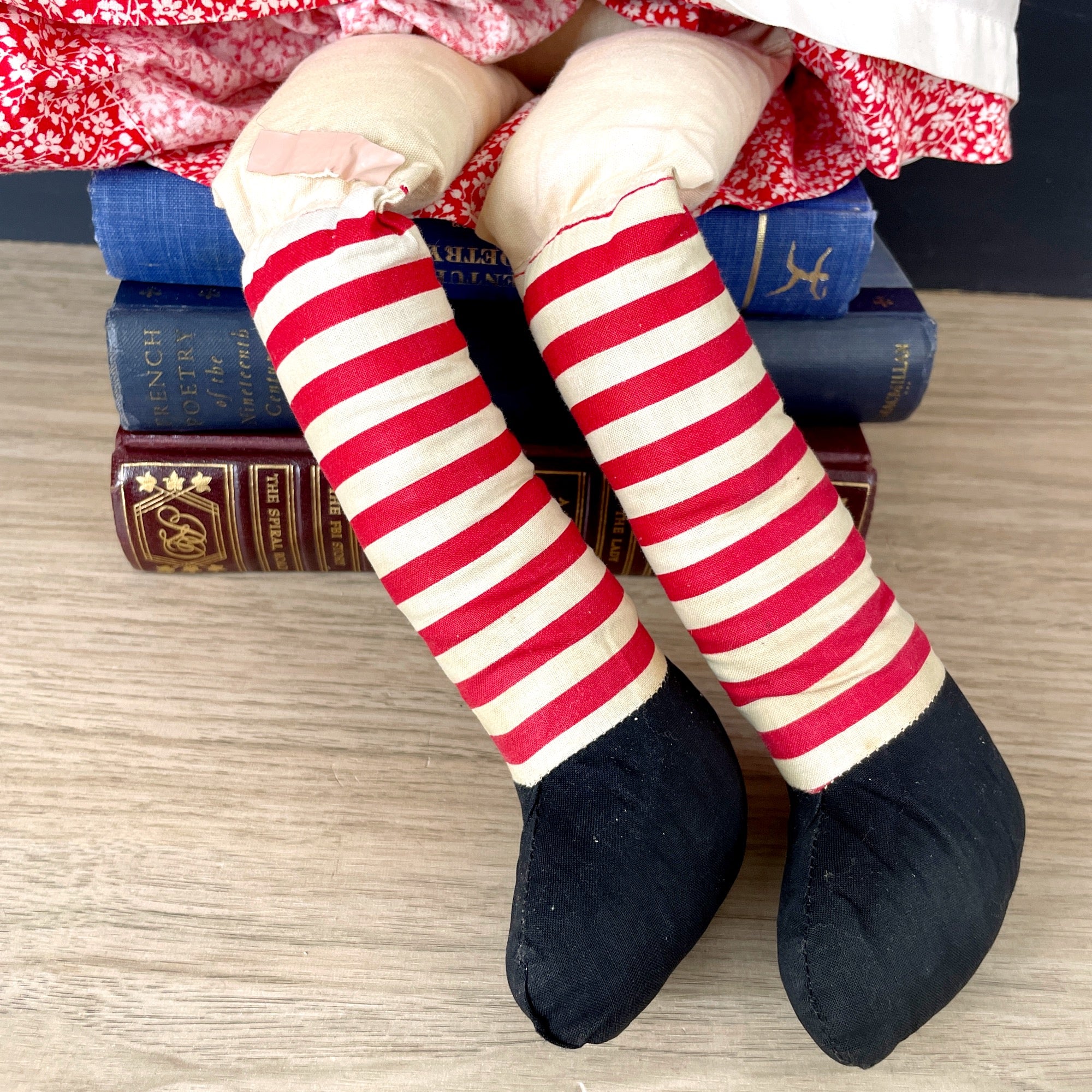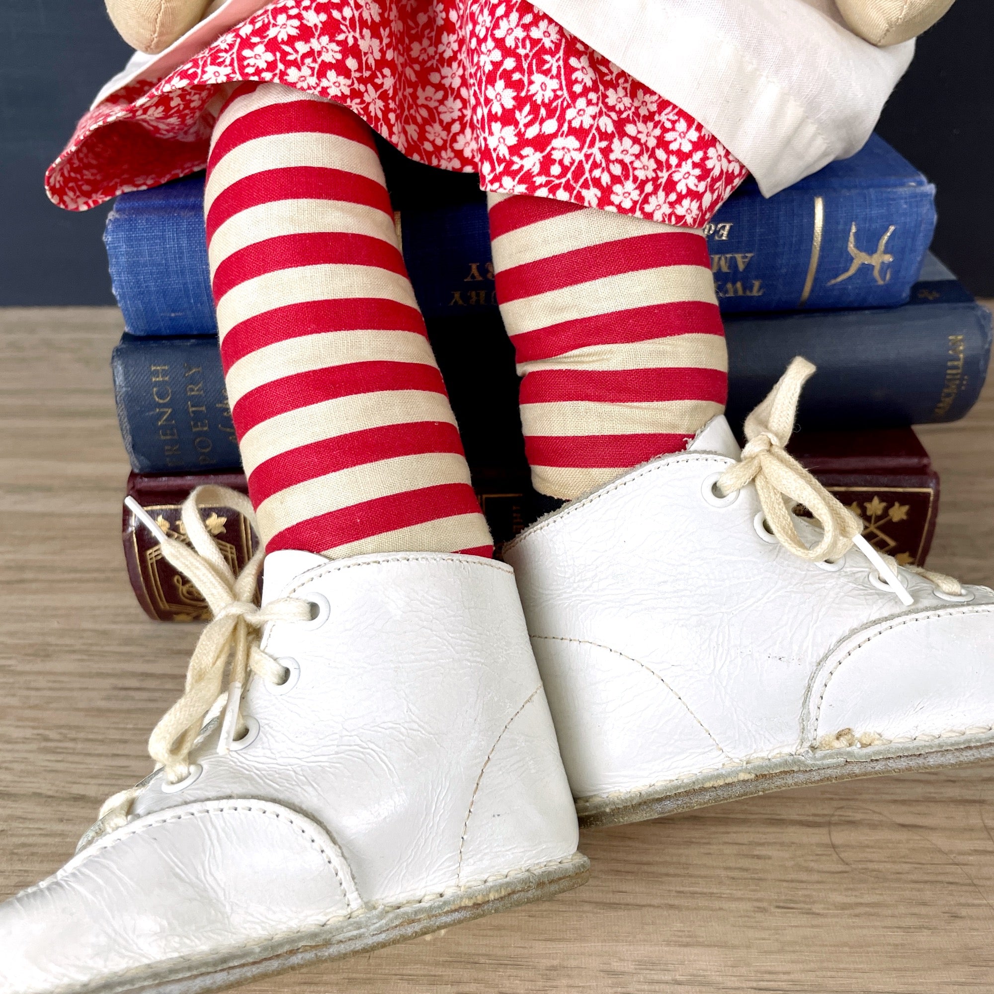From the 1960s, 20" tall Raggedy Ann doll handmade with love. Embroidered "I Love You" in heart on her chest. She has a red and white flower dress covered by a white pinafore, striped legs and white leather toddler shoes over her sewn black shoes. Face 2 faceted button eyes, triangle red fabric nose and embroidered features. She has a bandaid on her knee.