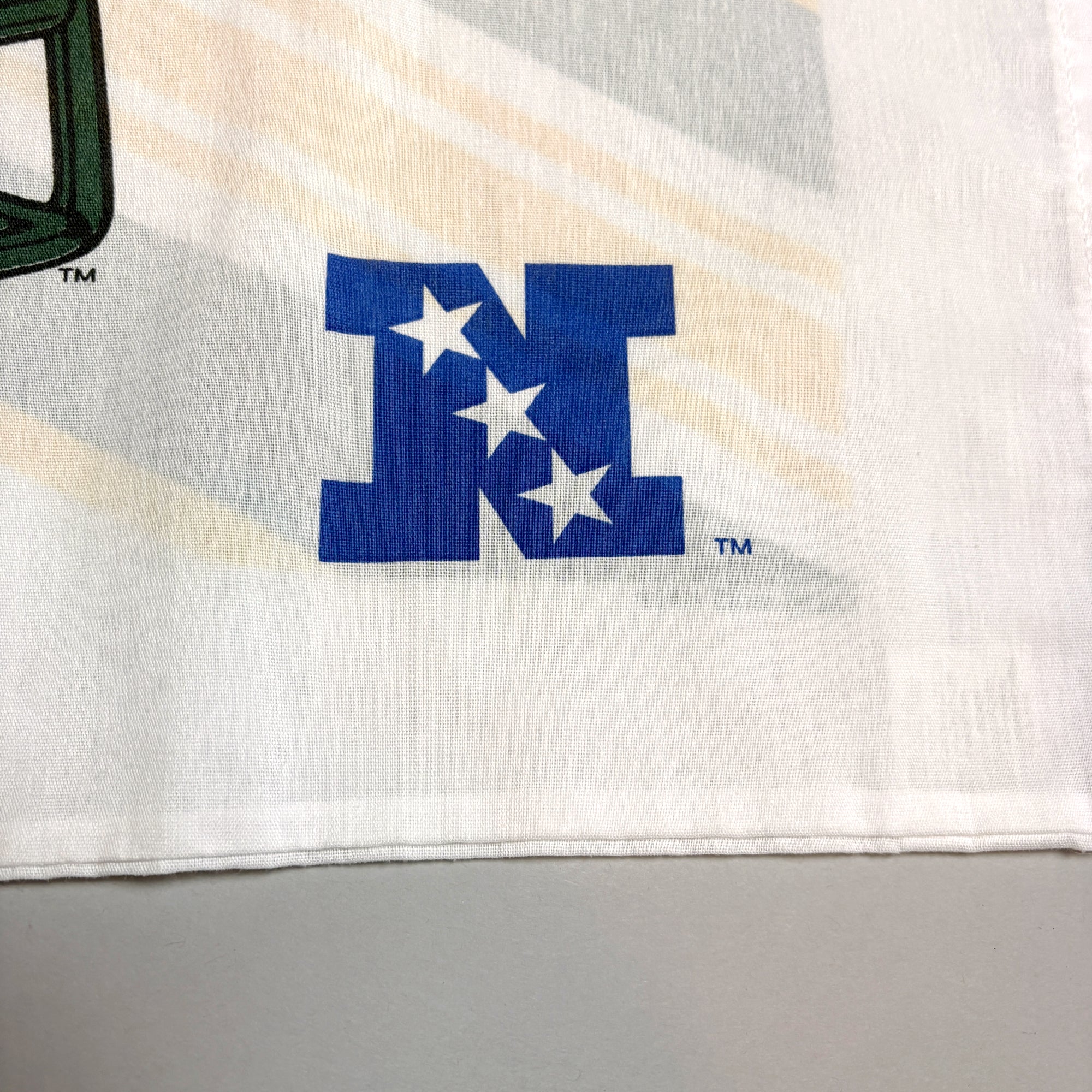 The Green Bay Packers fan in your life would love this collectible 1995 NFL pillowcase, with the "G" logo on one side and yellow Green Bay helmet on the other. The original National Football Conference (NFC) logo appears on both sides. Made in the US by the Bibb Company of Macon, GA. 70% polyester, 30% cotton blend lightweight fabric, see fabric closeup photo.
