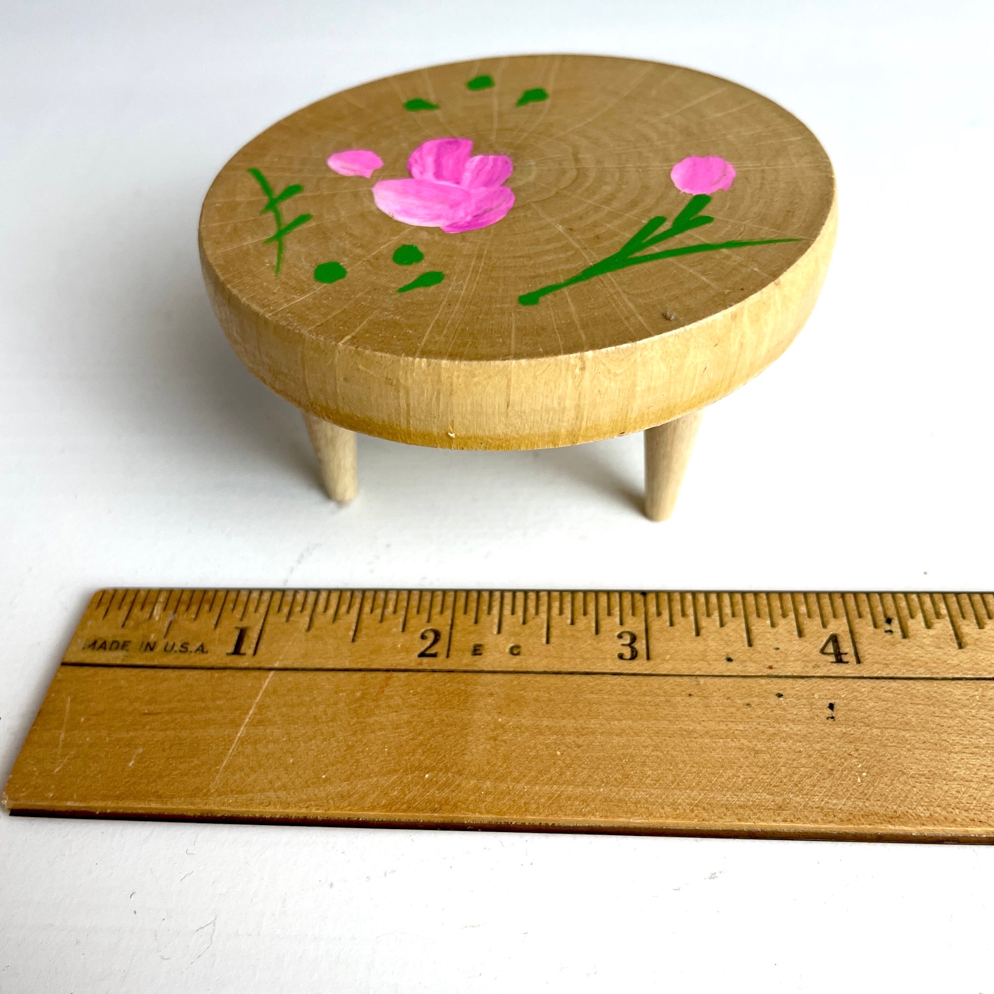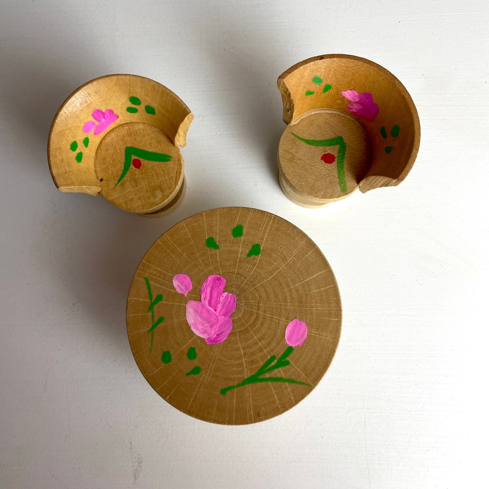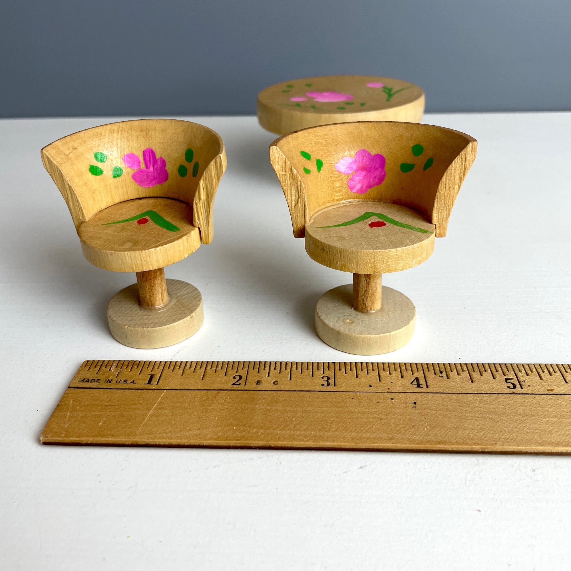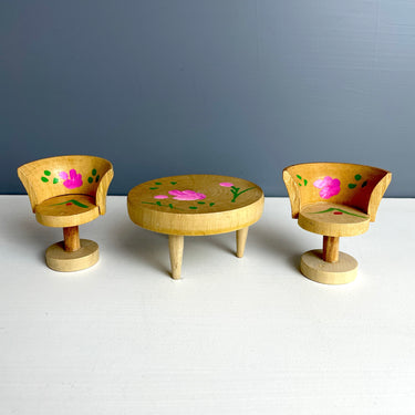 Vintage 1970s dollhouse furniture, made in Japan. Two pedestal bucket chairs and three legged table. Natural wood with painted flowers.