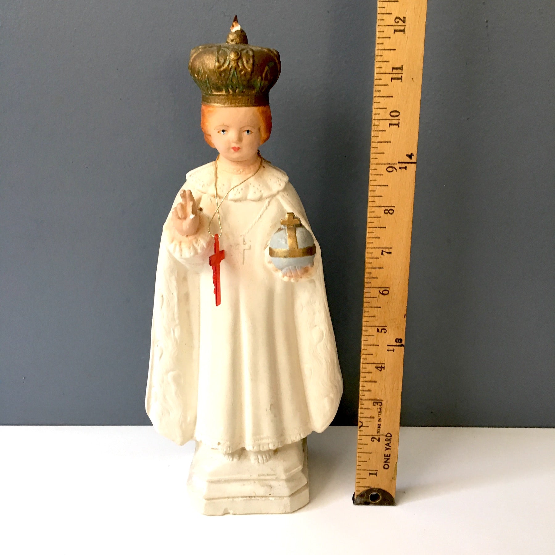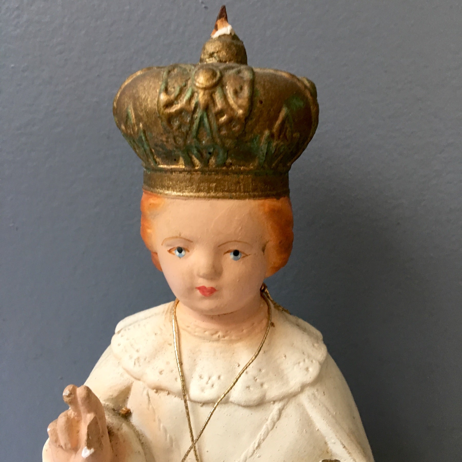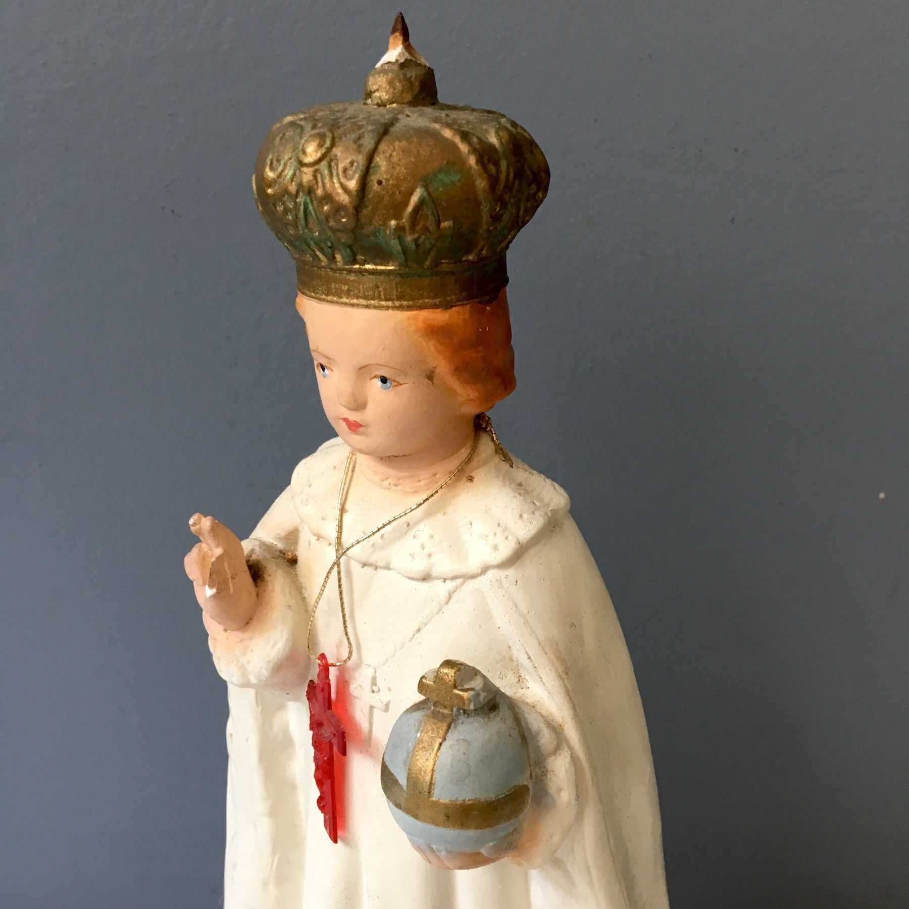 Chalkware Infant of Prague statue that is a bit chippy and shabby. Molded and painted chalk ware figure has a chipped hand and a few chips other places. The cross on the top of the crown is gone and the rusty armature that was used in molding shows.