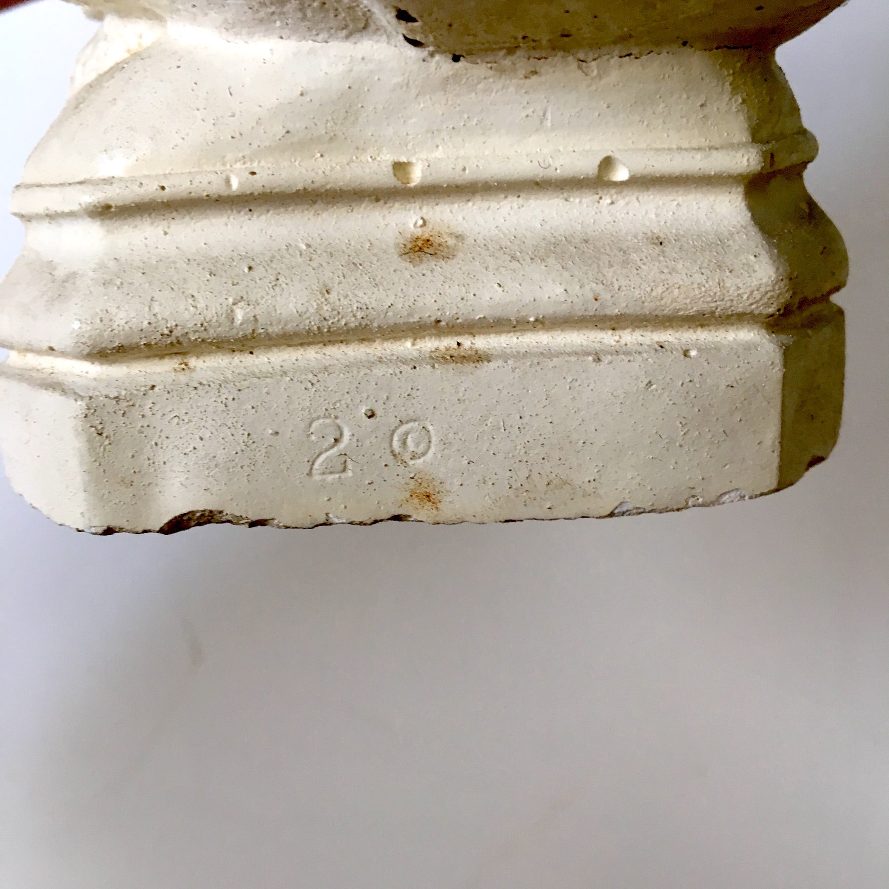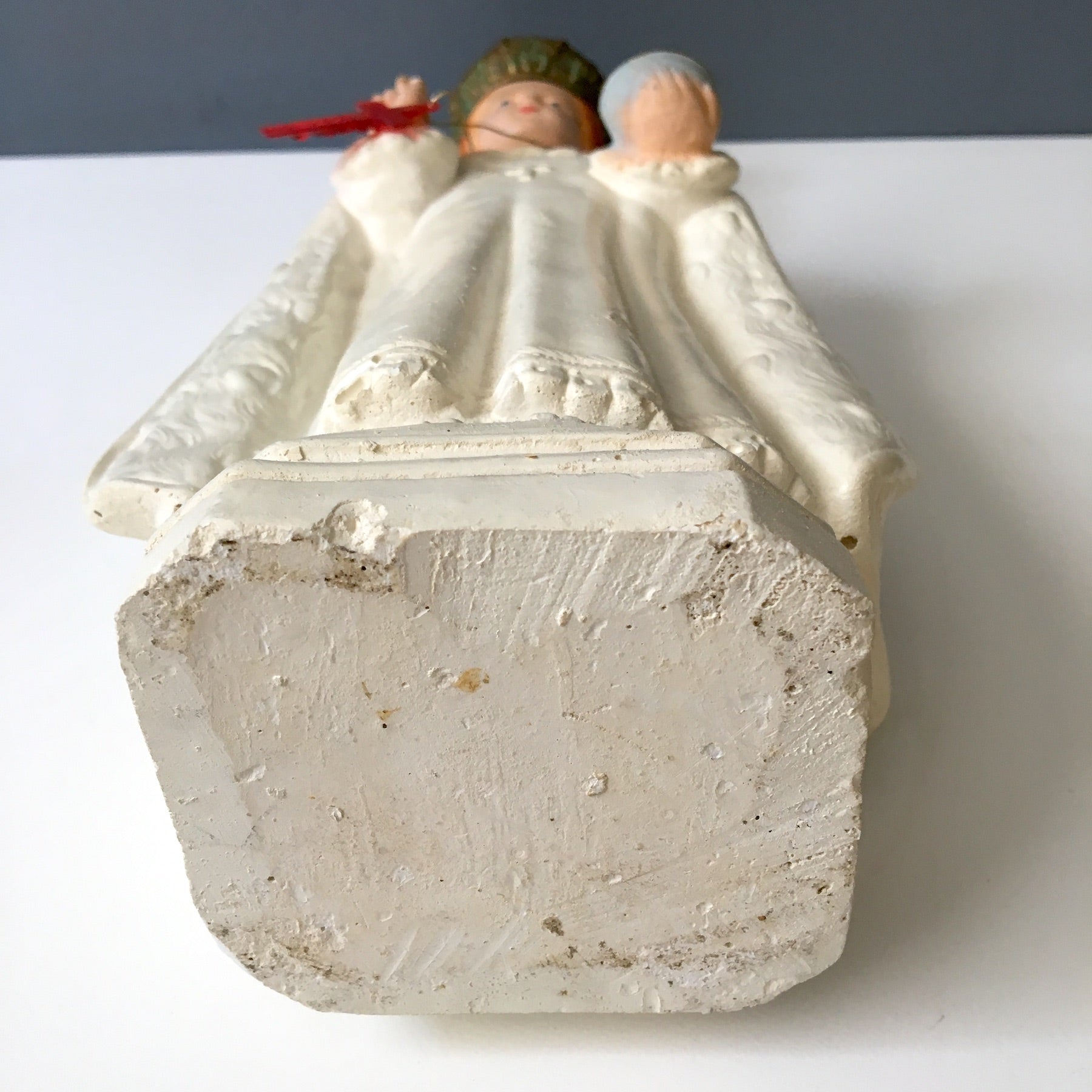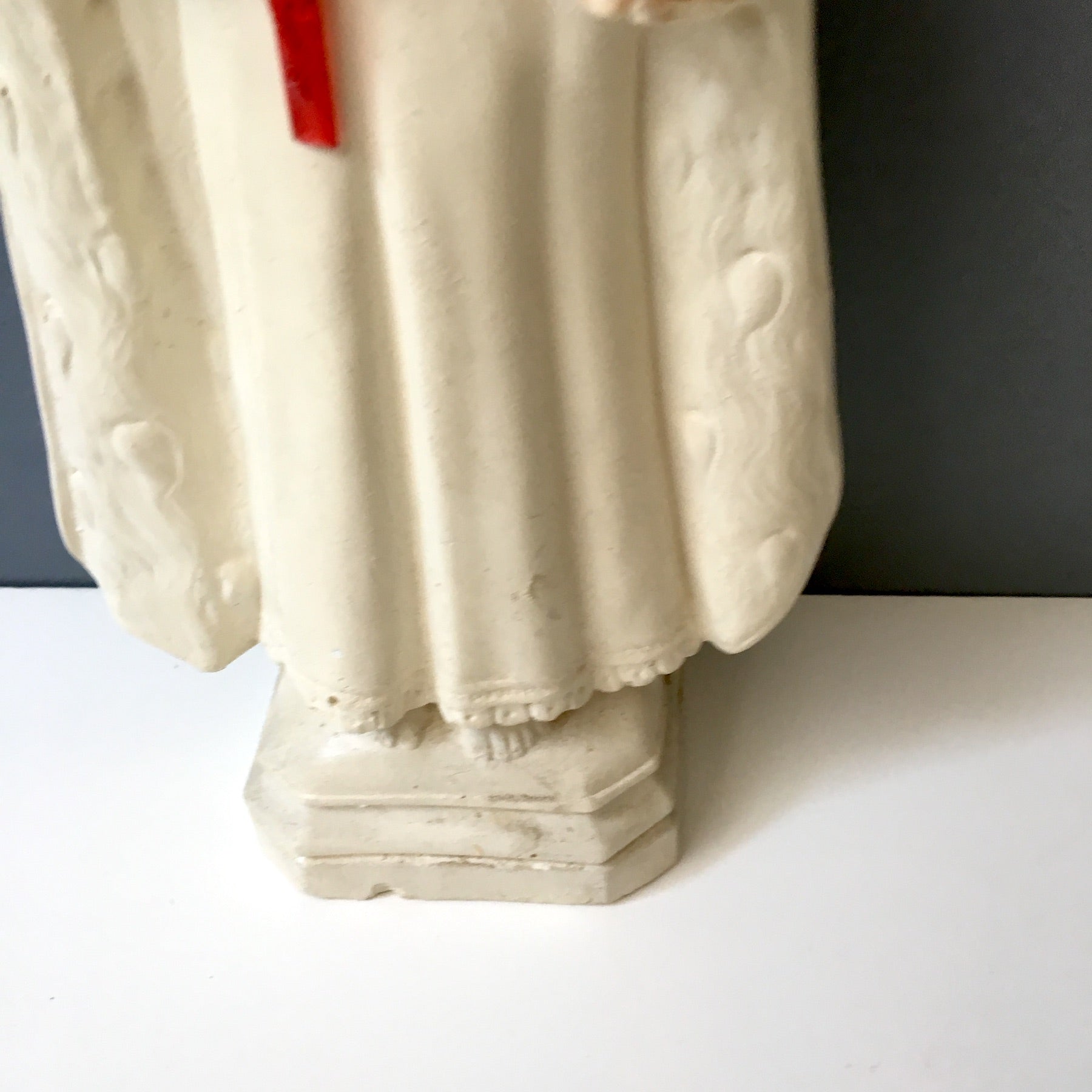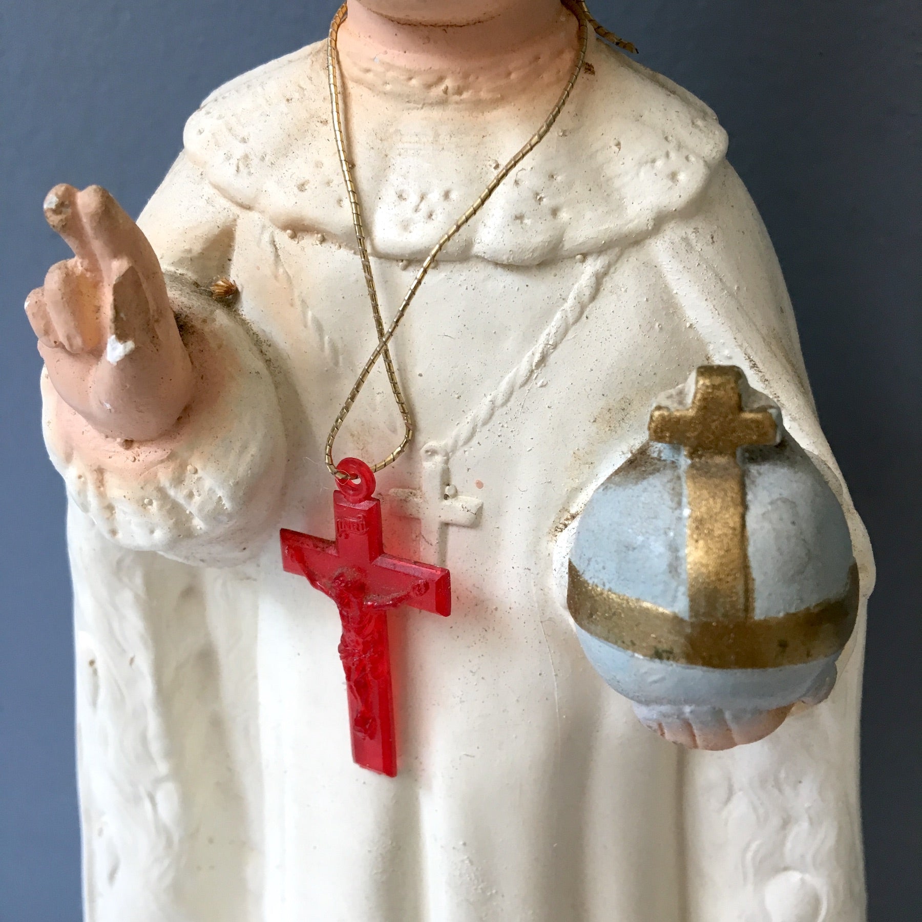 Chalkware Infant of Prague statue that is a bit chippy and shabby. Molded and painted chalk ware figure has a chipped hand and a few chips other places. The cross on the top of the crown is gone and the rusty armature that was used in molding shows.
