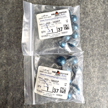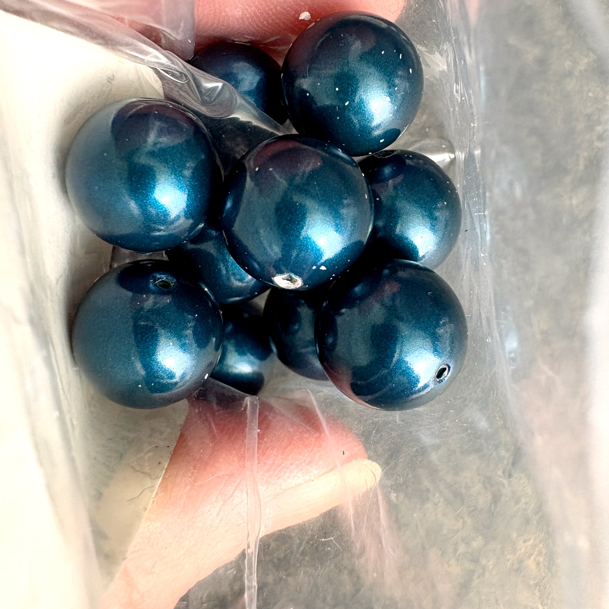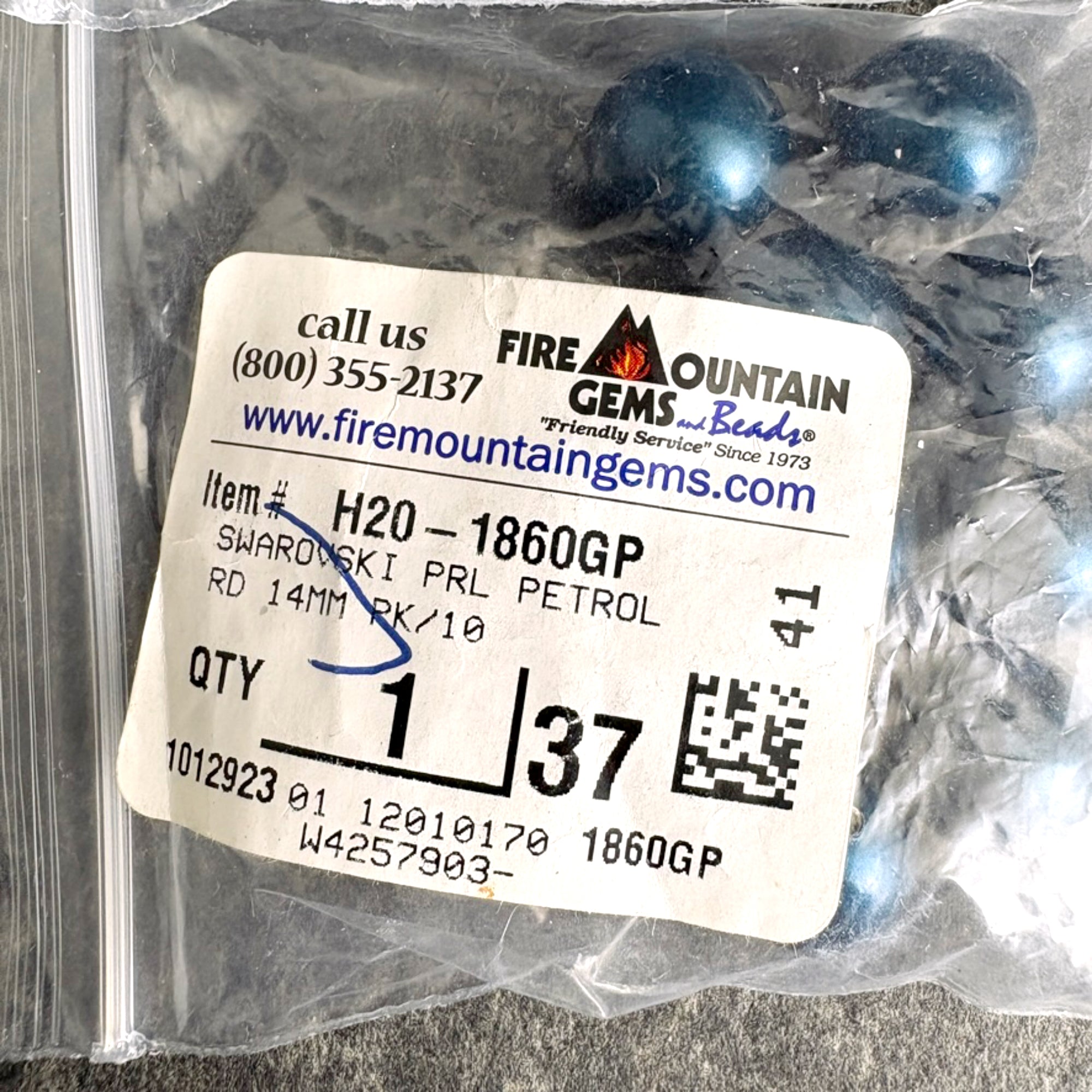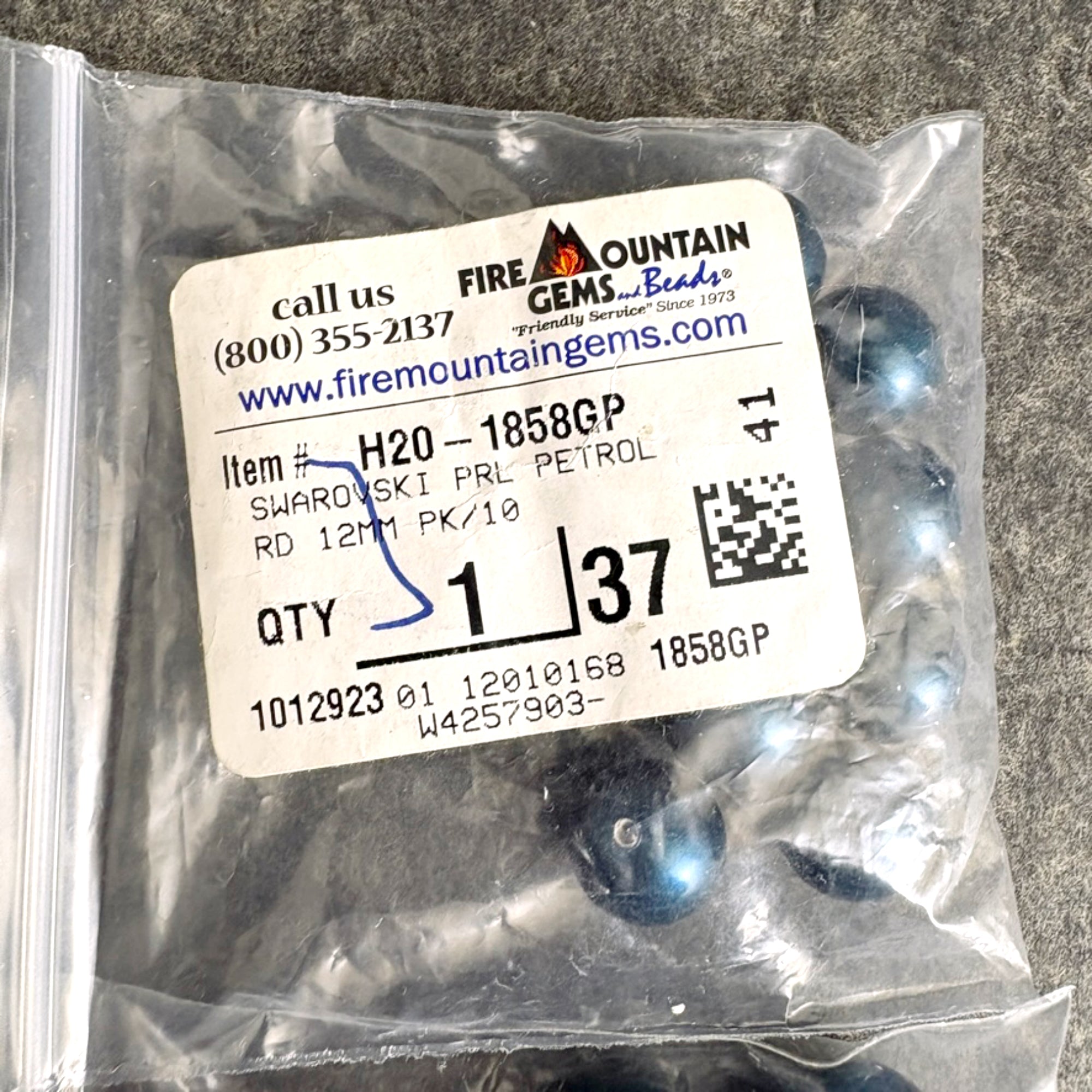 Two bags with 10/bag of Swarovski 12mm round crystal pearls in petrol (a deep, rich blue-teal color with a metallic, pearlescent shimmer, similar to the iridescent hues of an oil slick) for a total of 20 beads. These beautiful crystal pearls are full-drilled and ready for your next jewelry or craft project. Still in their original packaging from Fire Mountain Gems.