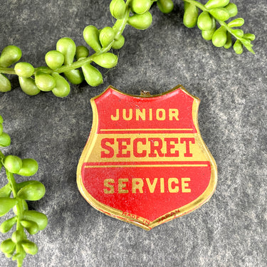 Vintage 1950s red and gold tin Junior Secret Service badge. Small straight pin on the back. We'd snip that off and glue on a pin back to actually wear it. Made in Japan. Five and dime store quality.