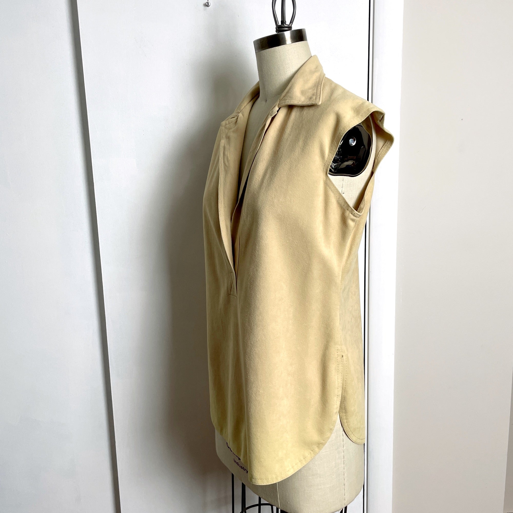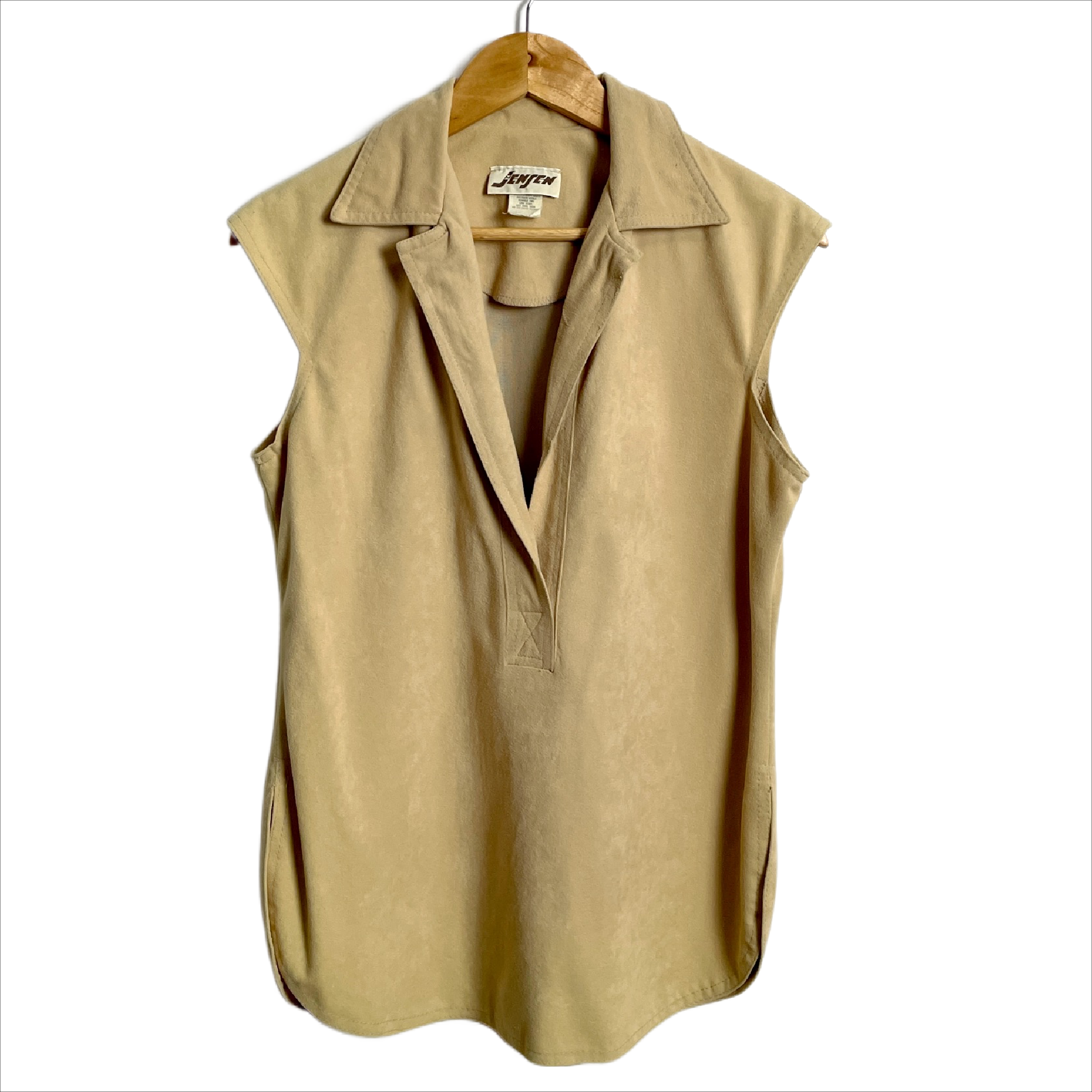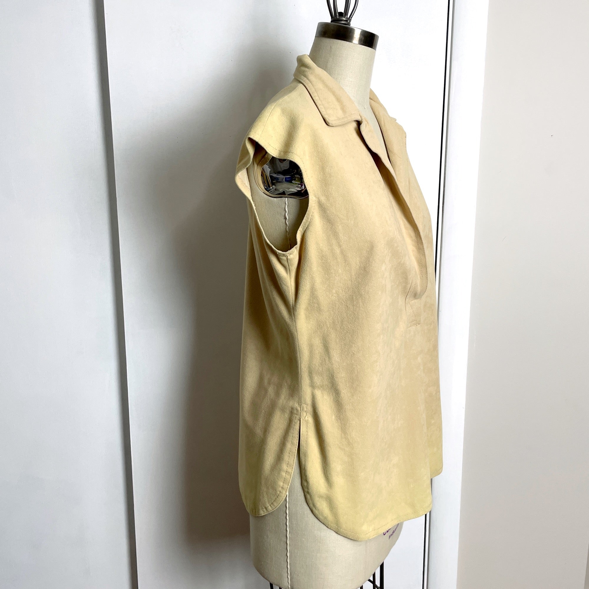 Vintage 1970s sleeveless top with deep V and notched johnny collar. Shaped hem with side slits. By M. Jensen. Plush feel sueded finish fabric. ILGWU union label. Made in USA.