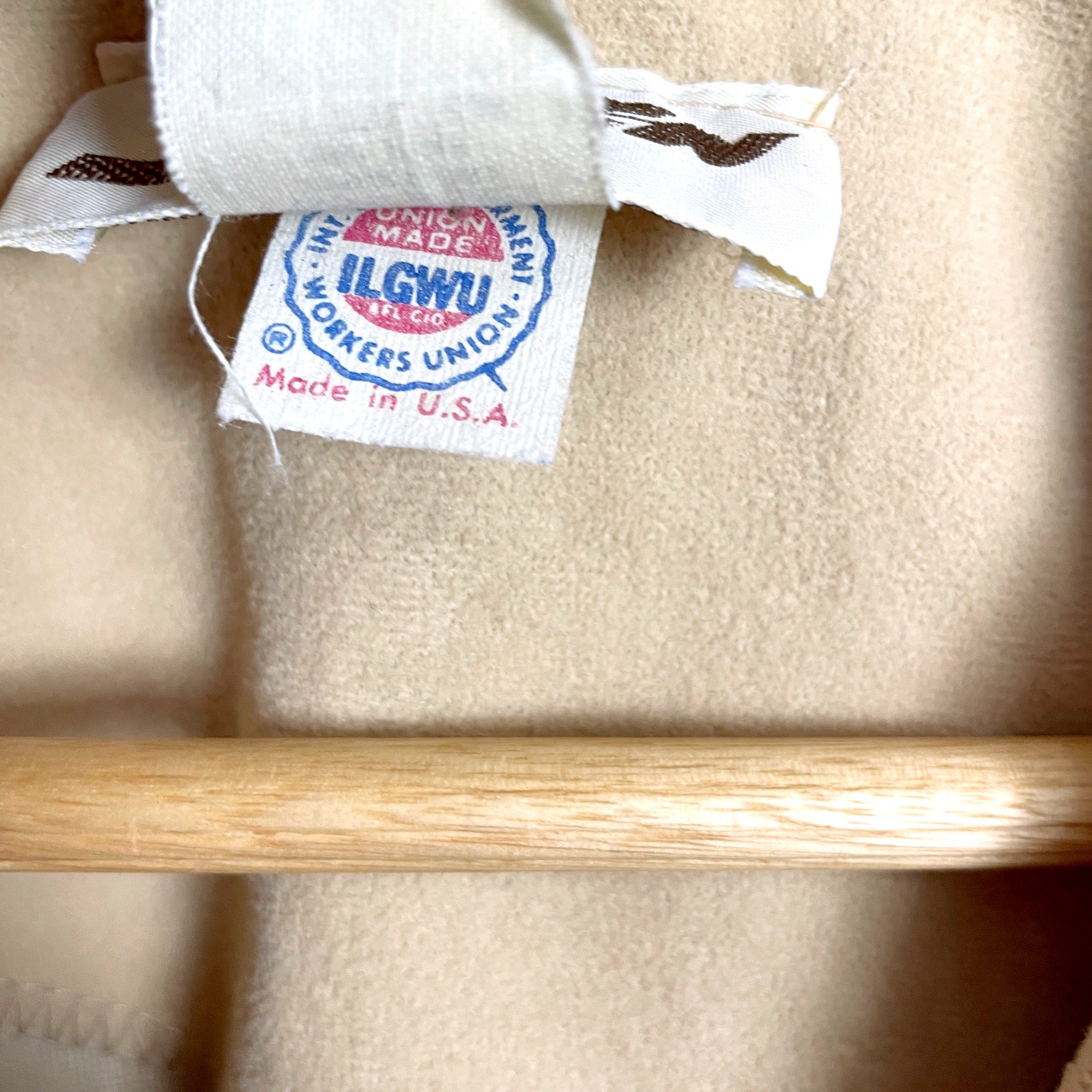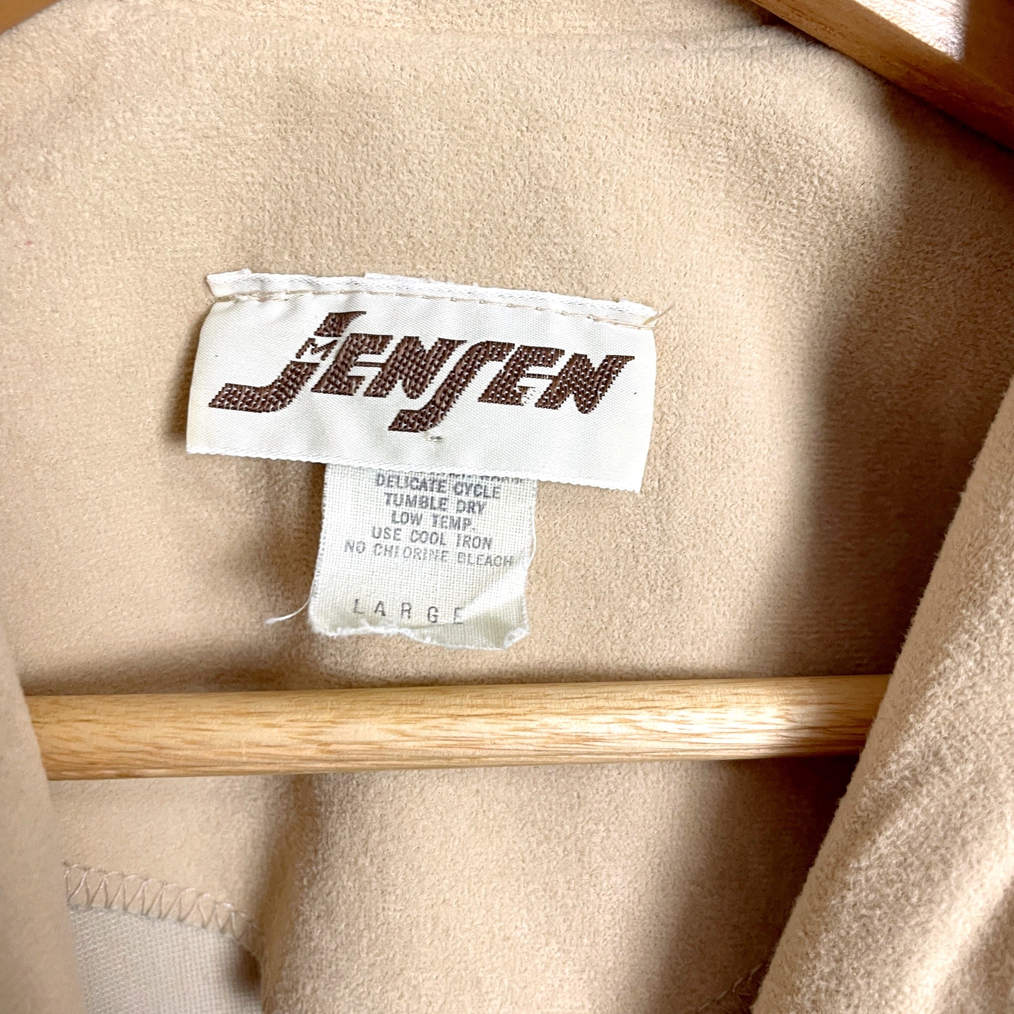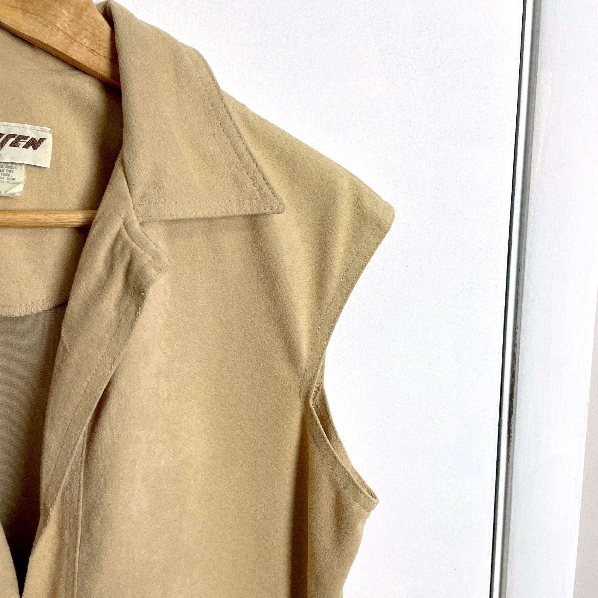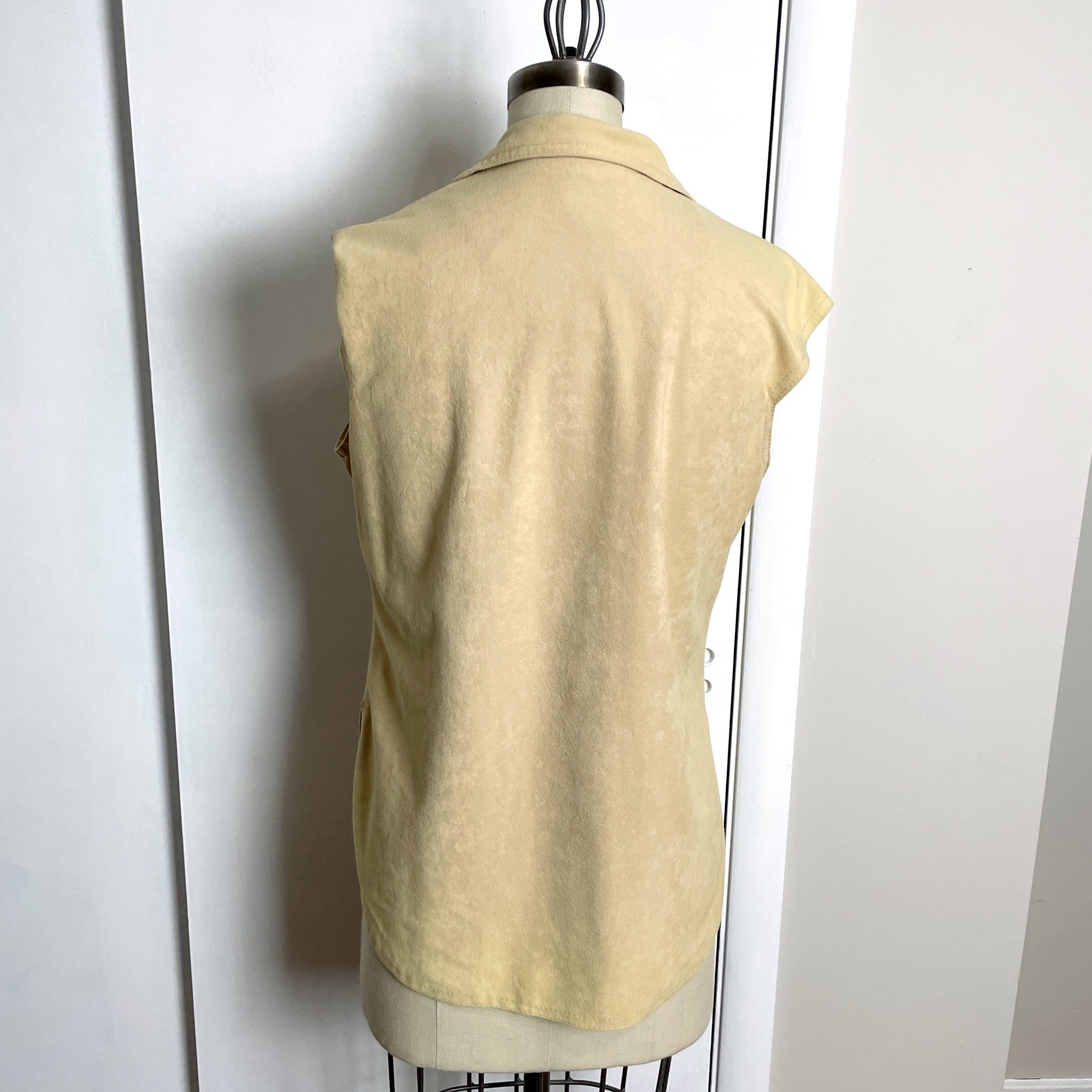 Vintage 1970s sleeveless top with deep V and notched johnny collar. Shaped hem with side slits. By M. Jensen. Plush feel sueded finish fabric. ILGWU union label. Made in USA.
