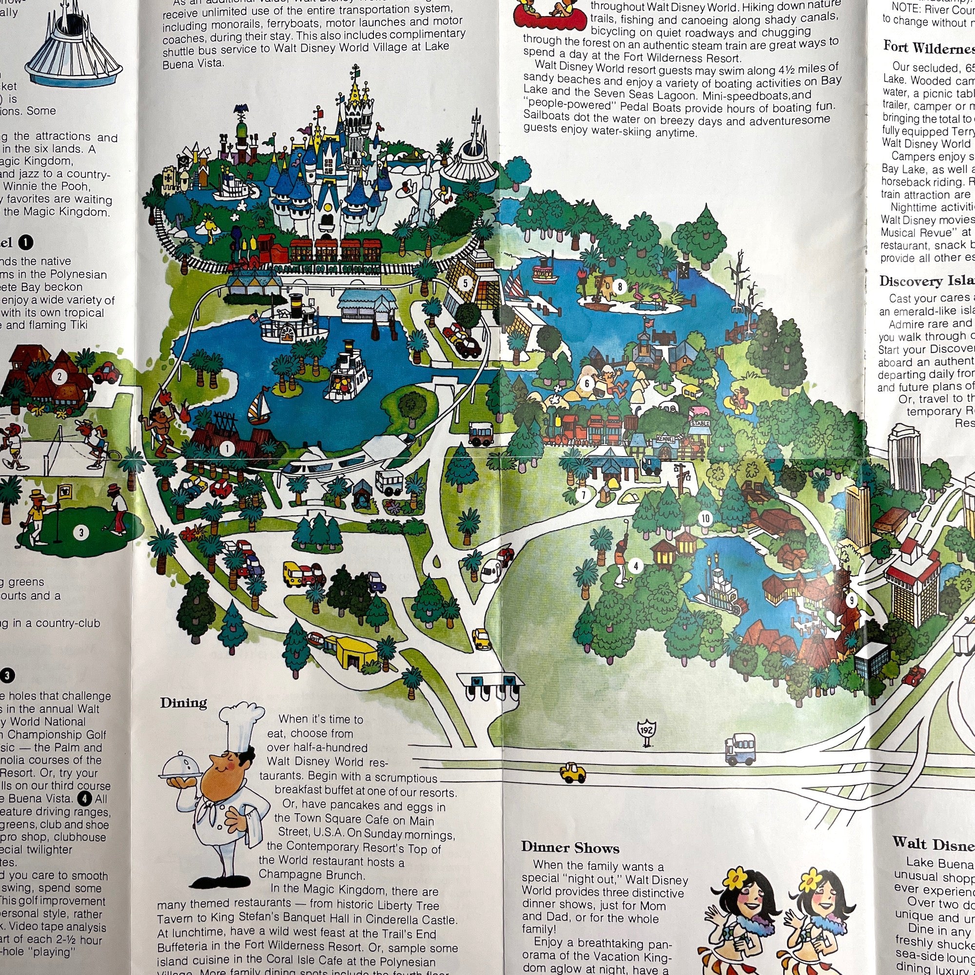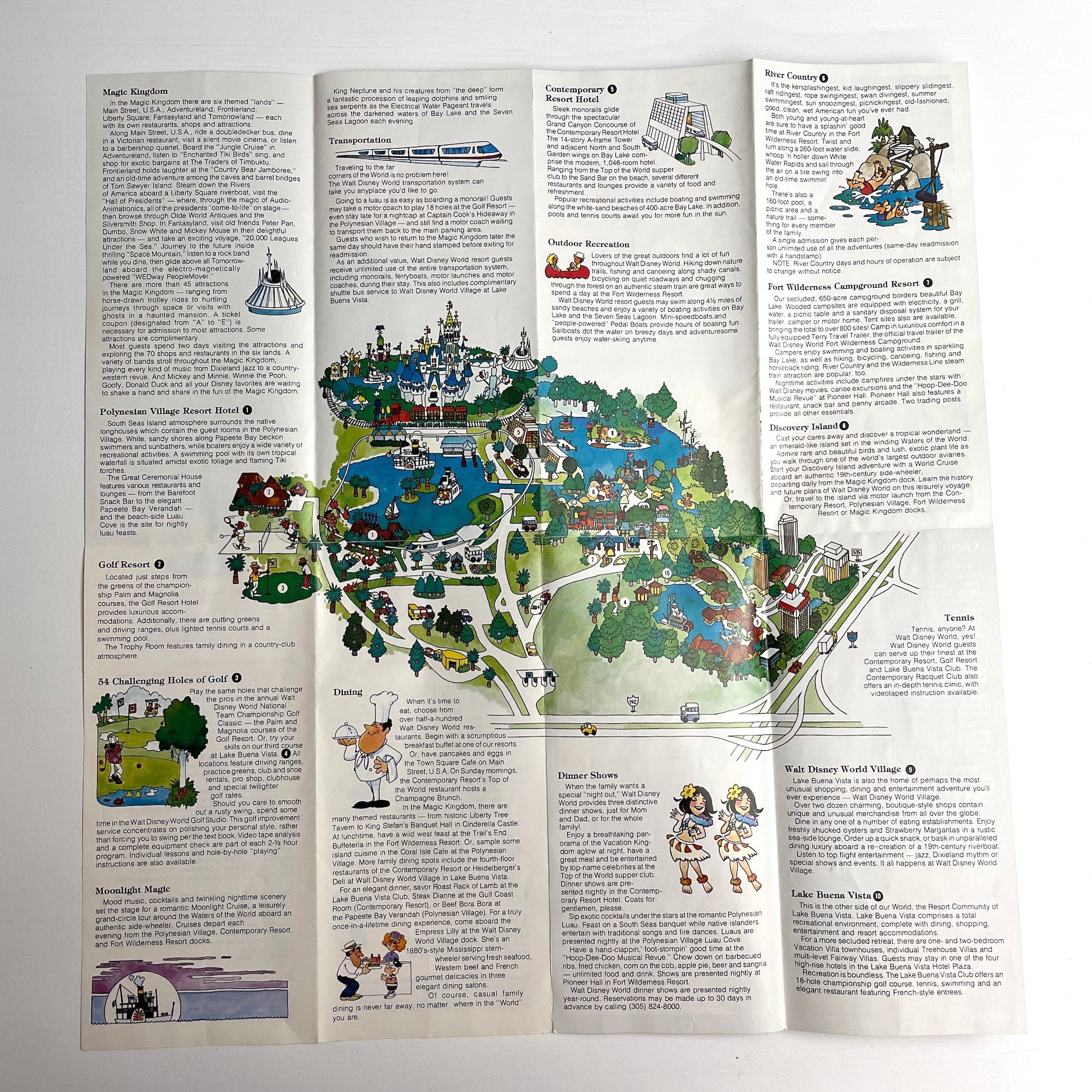 Vintage 1978 Walt Disney World Vacationer's Guide, a paper fold-out brochure. Includes attraction and coupon information. Folds out with a map on the inside surrounded by accommodations, restaurants and activities.