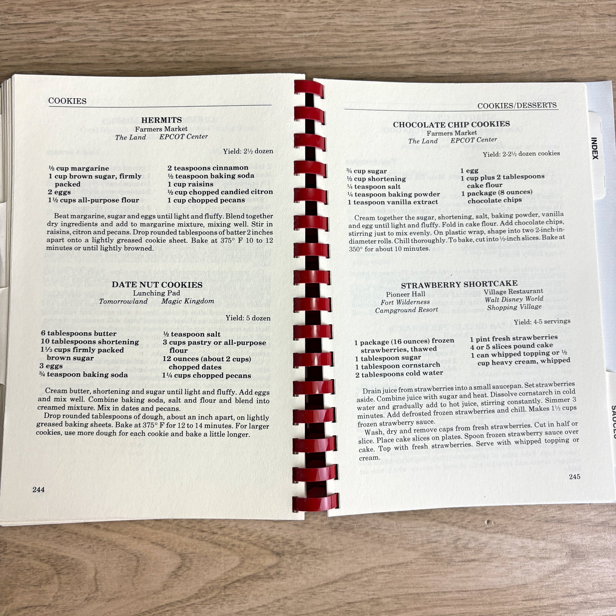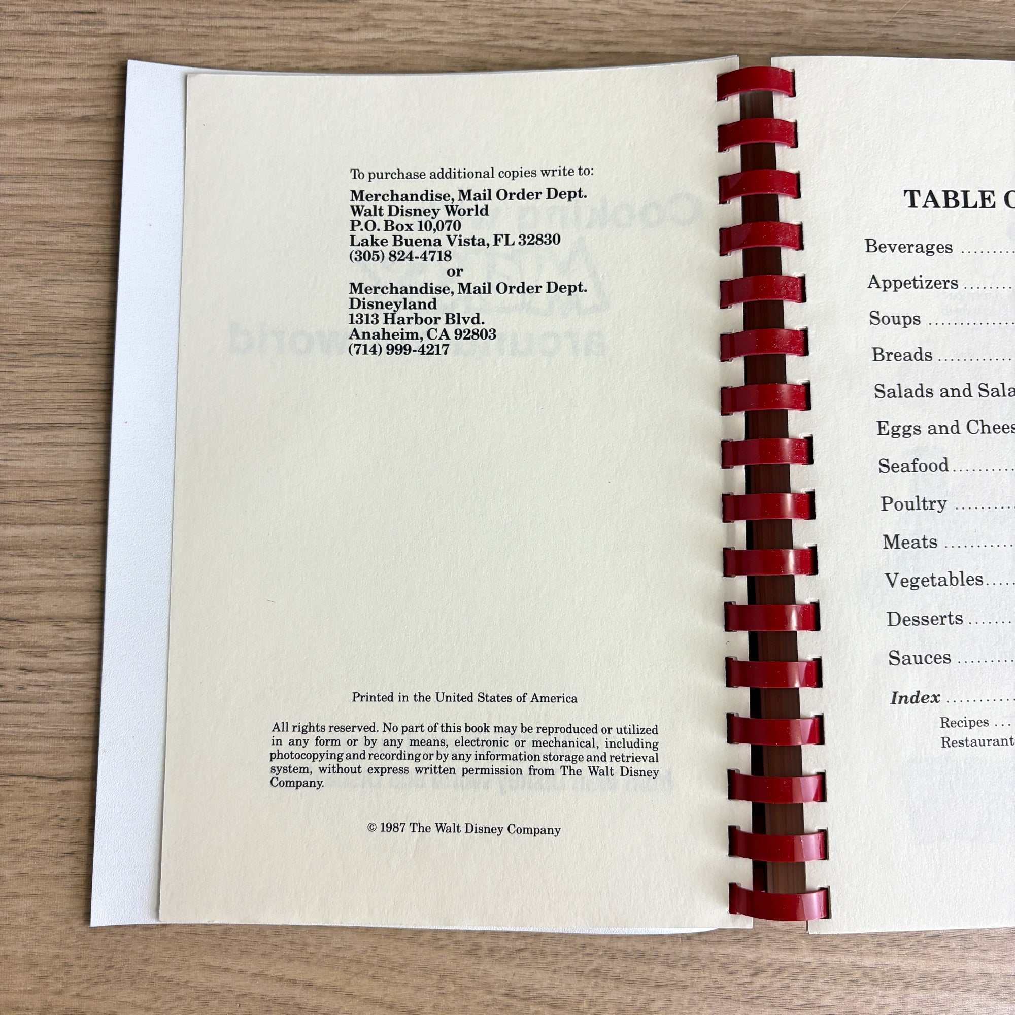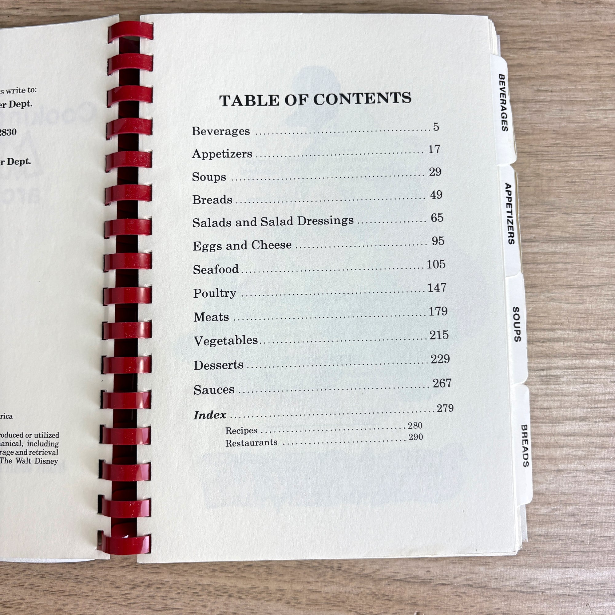 1987 edition of Cooking with Mickey around our world cookbook, sharing 'The MOST requested recipes from Walt Disney World and Disneyland". Each section has a tabbed divider page with a color illustration of Mickey preparing that type of food - Beverages, Appetizers, Soups, Breads, Salads, Eggs and Cheese, Seafood, Poultry, Meats, Vegetables, Desserts, and Sauces. Fully indexed. Each recipe lists the location at which it is served. Plastic spiral binding.