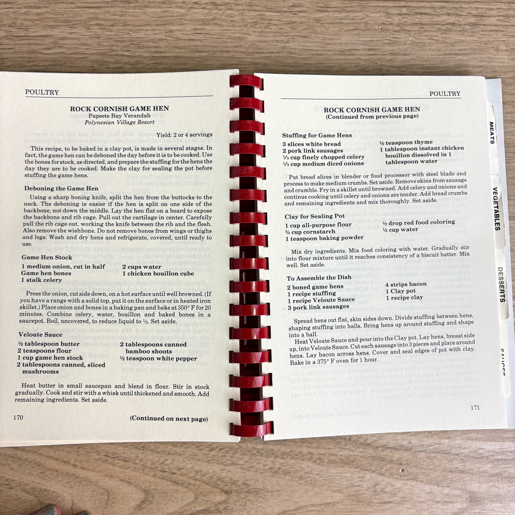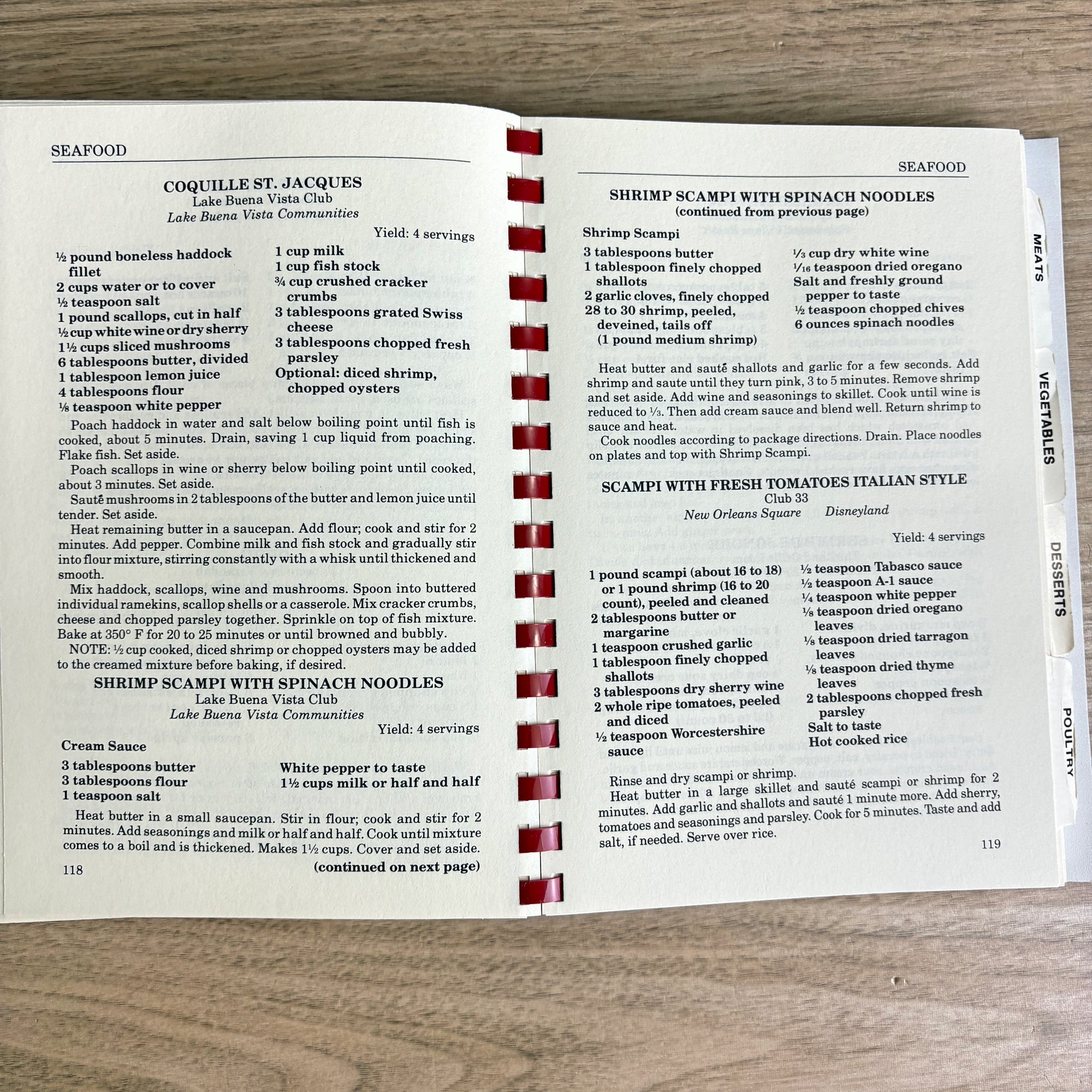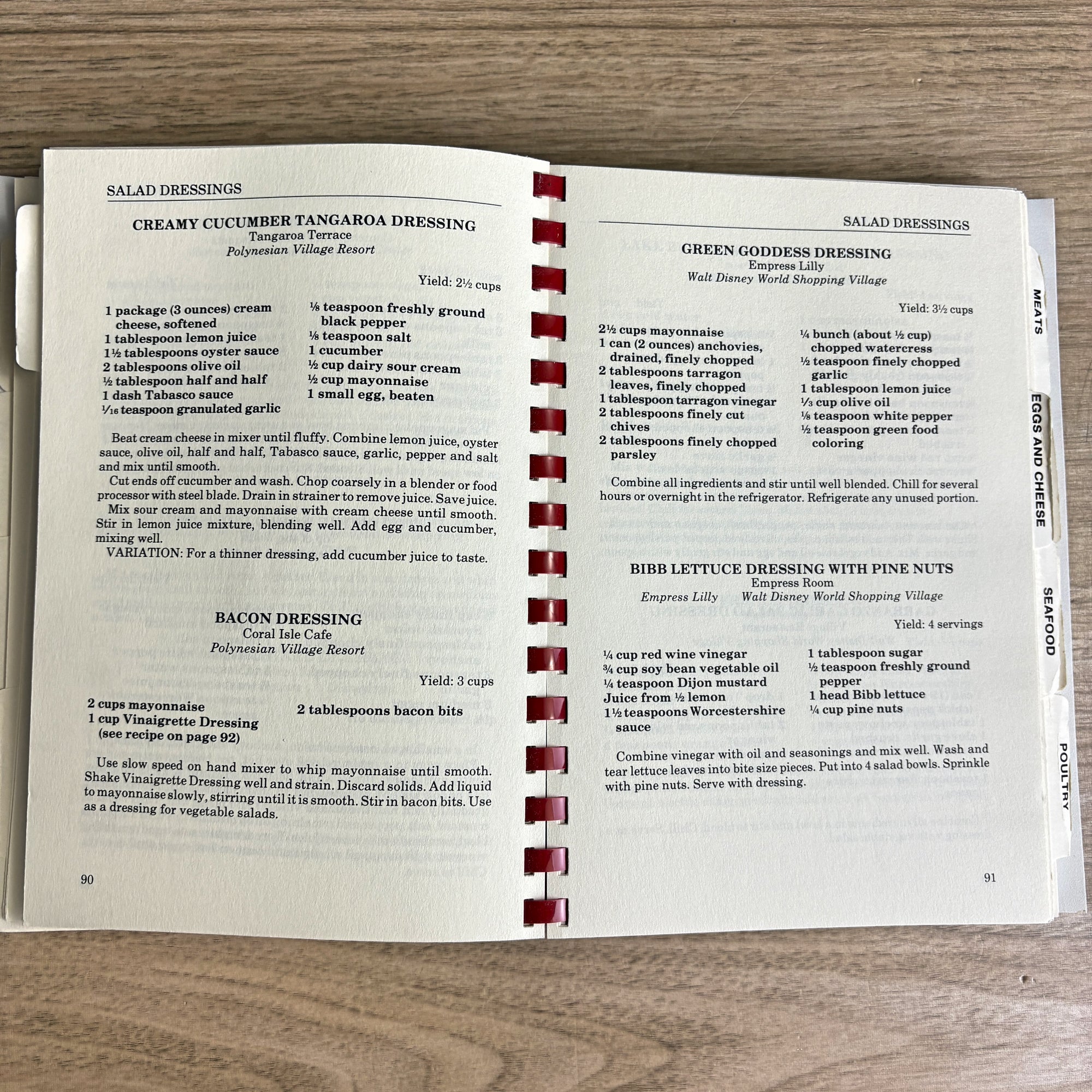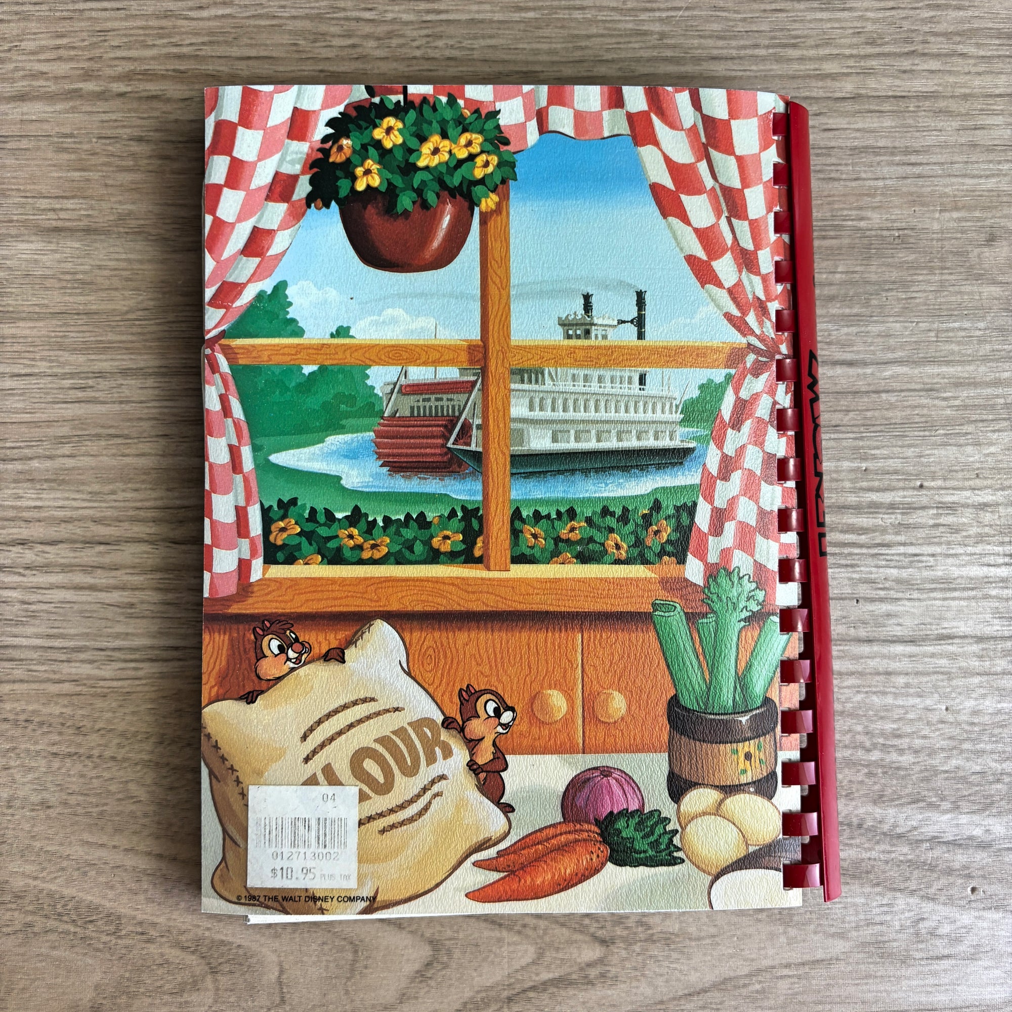 1987 edition of Cooking with Mickey around our world cookbook, sharing 'The MOST requested recipes from Walt Disney World and Disneyland". Each section has a tabbed divider page with a color illustration of Mickey preparing that type of food - Beverages, Appetizers, Soups, Breads, Salads, Eggs and Cheese, Seafood, Poultry, Meats, Vegetables, Desserts, and Sauces. Fully indexed. Each recipe lists the location at which it is served. Plastic spiral binding.