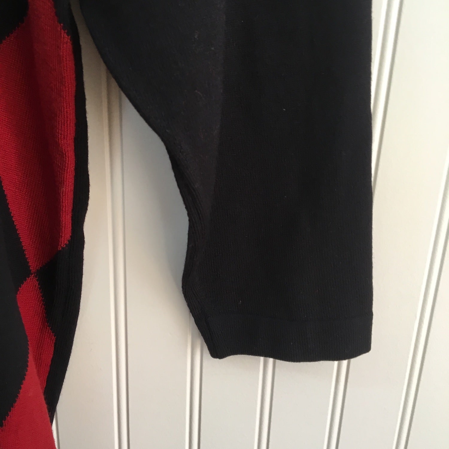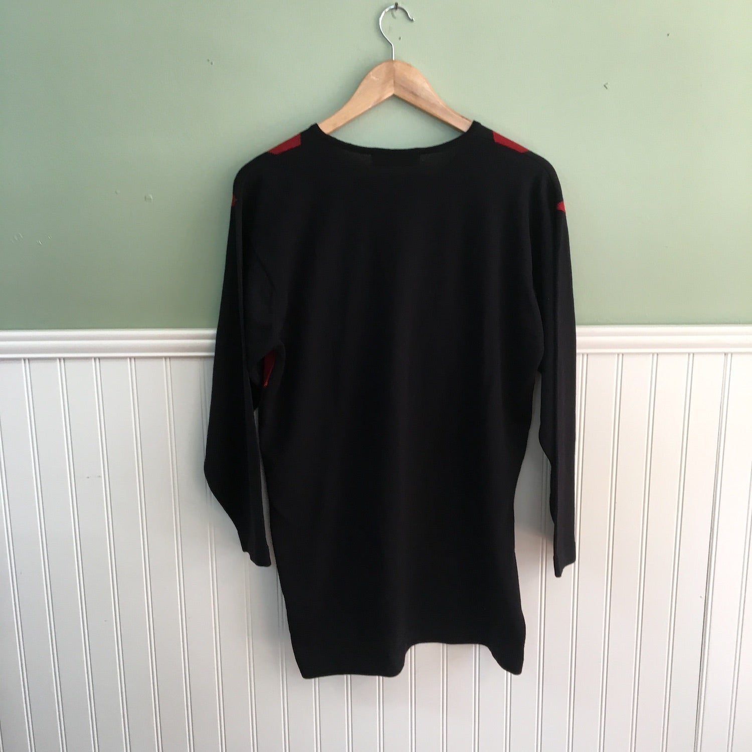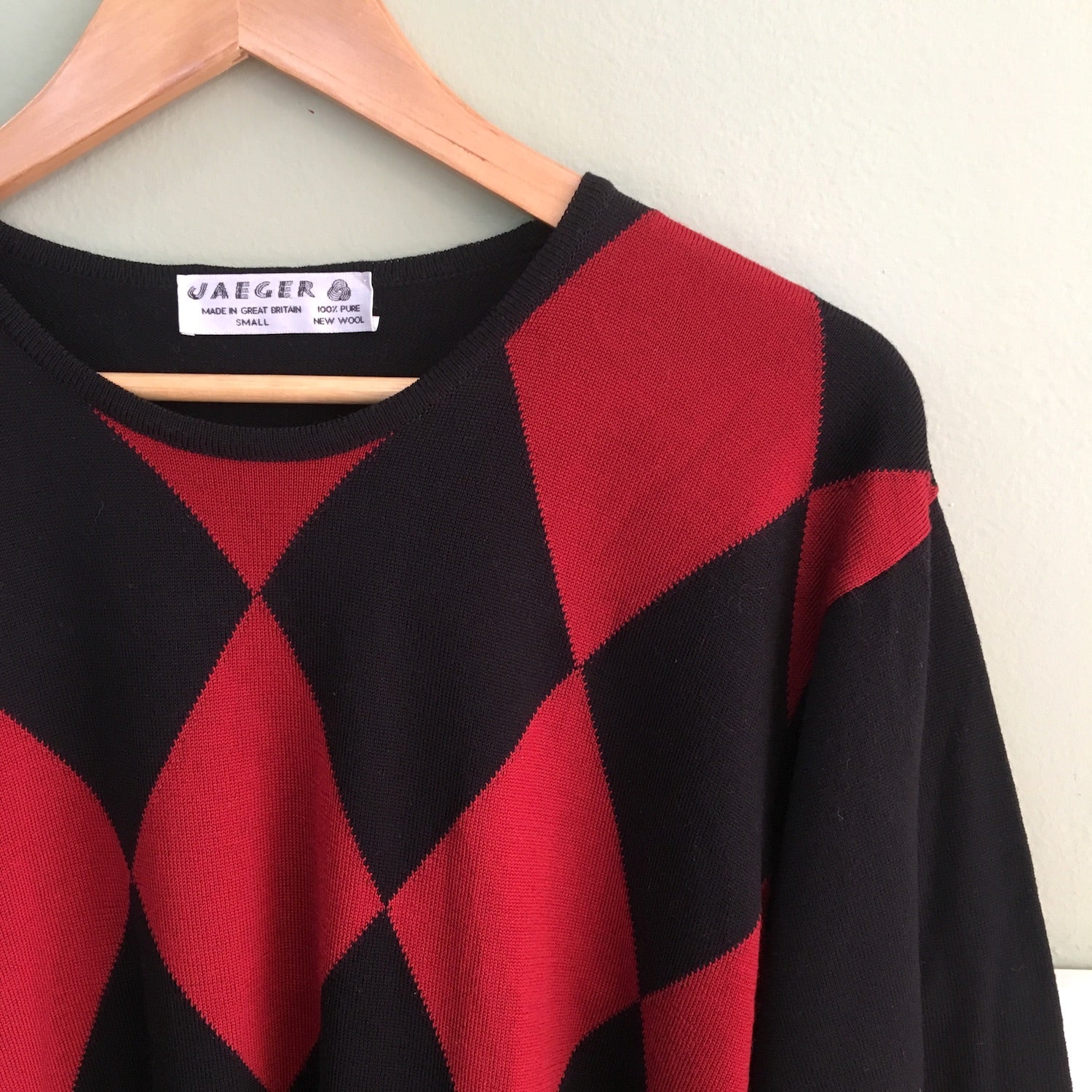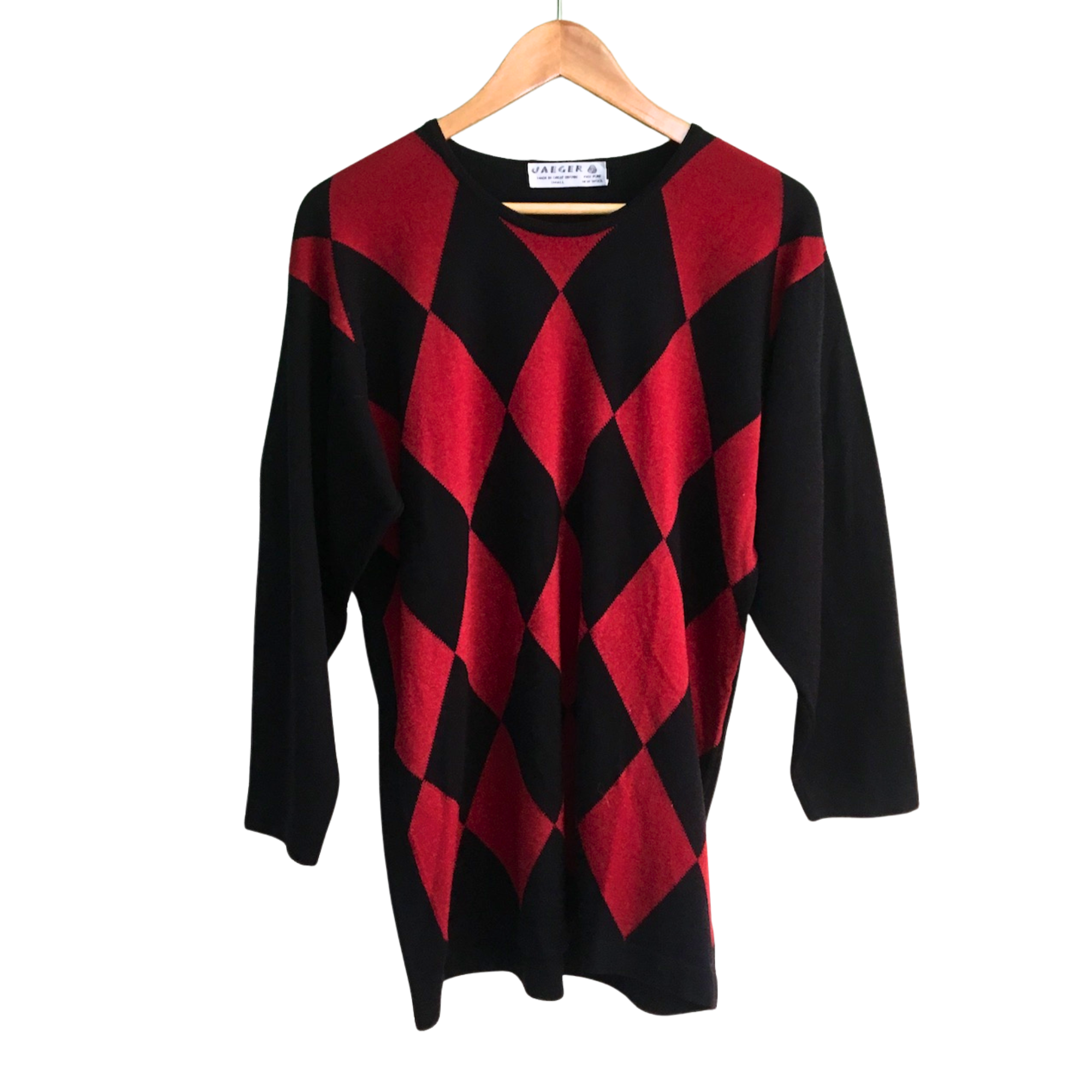 Fine gauge Jaeger knit wool tunic. Rust and black harlequin pattern. Round neck. Slightly inset sleeves. Pattern on the front only, back is solid black. Made in Great Britain. Designed to be worn oversized.