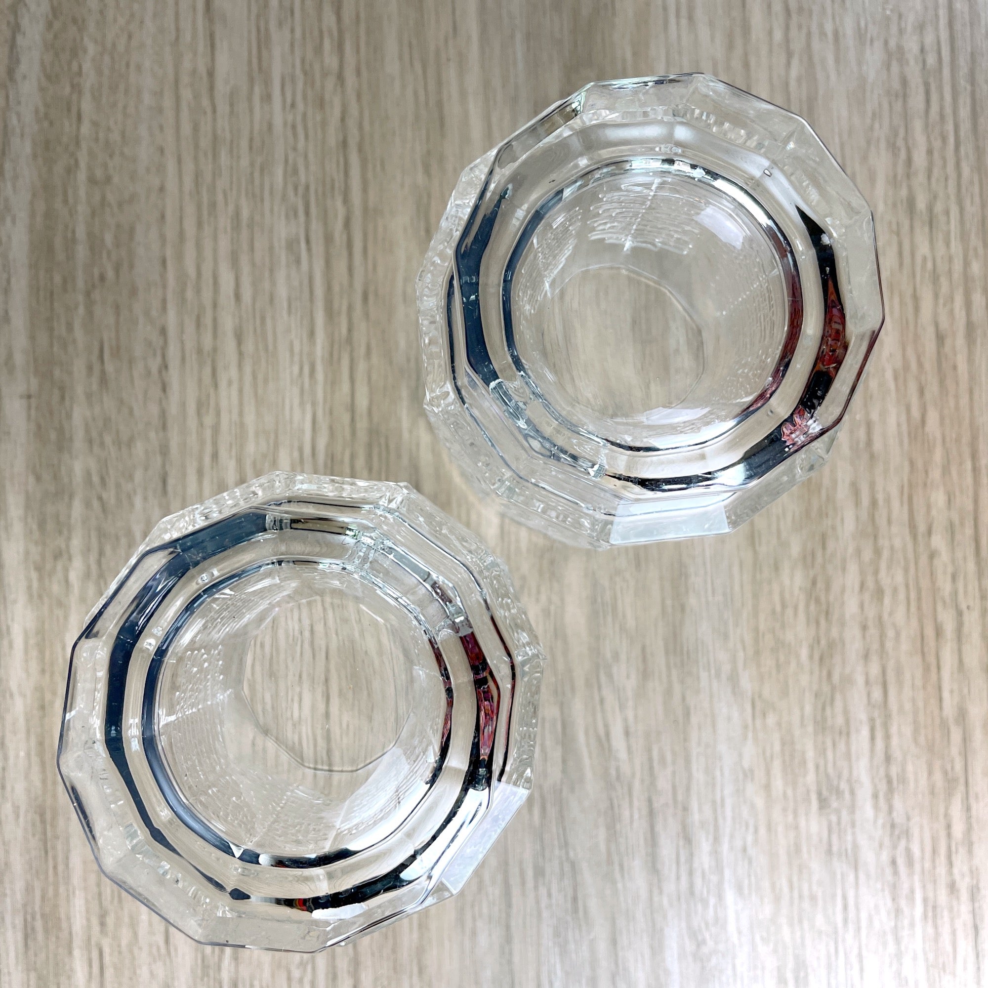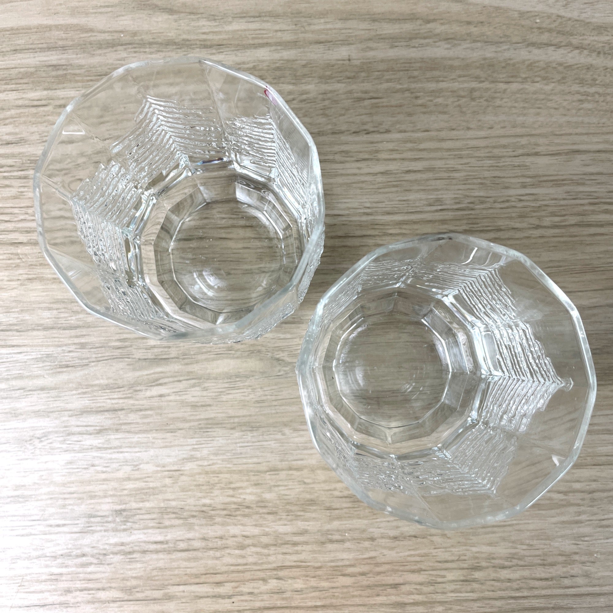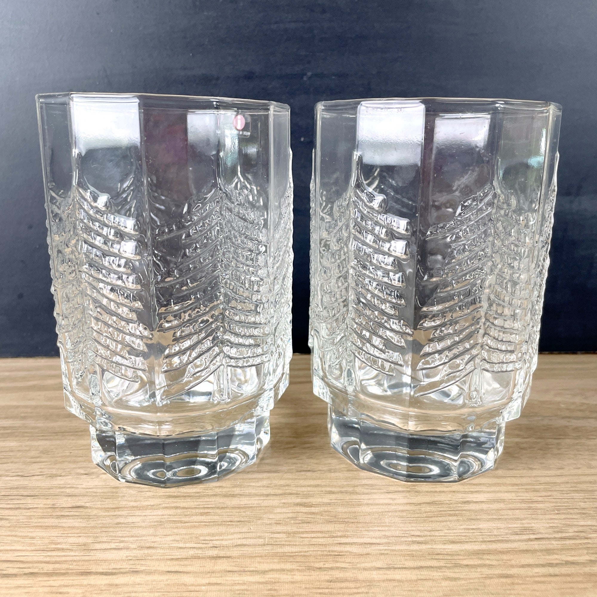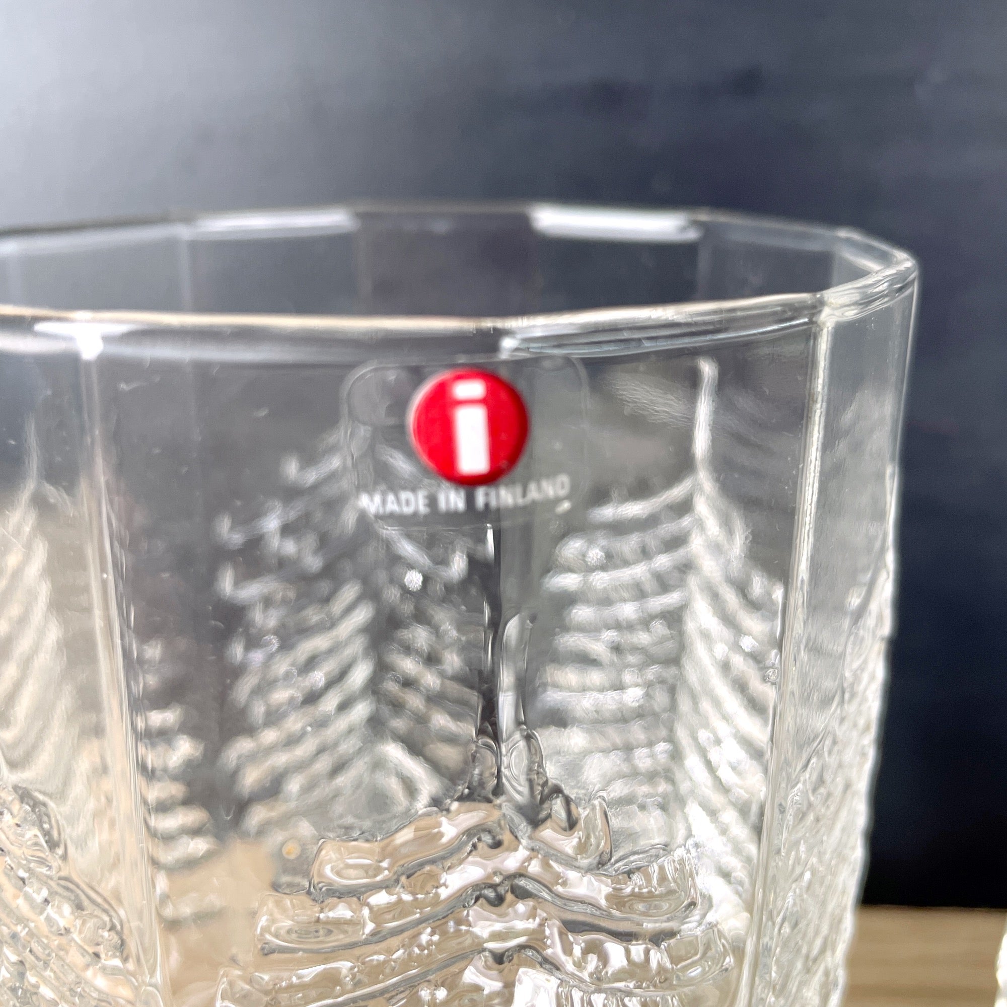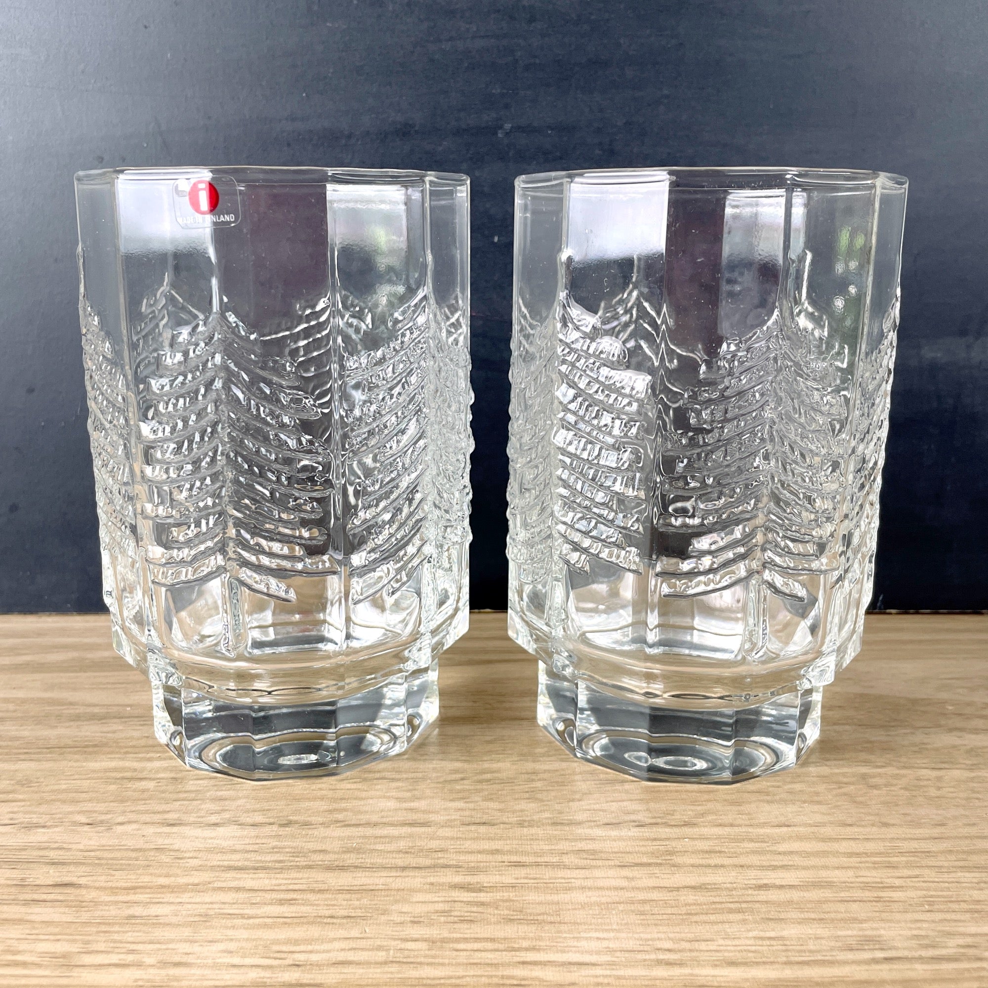 Pair of large glass votive holders with the Kuusi (spruce tree) pattern made in Finland by the Iittala Glass company. One has original makers tag