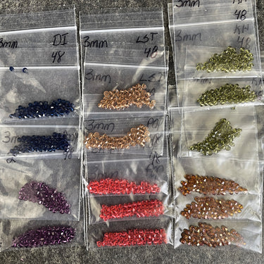 15 bags of 48/bag of 3mm bicone crystal beads for a total of 720 beads. Colors include: 2 bags dark indigo, 2 bags light smoky topaz, 3 bags khaki, 2 bags amethyst, 3 bags padparadscha, 3 bags crystal copper.