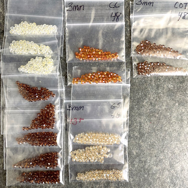 15 bags of 48/bag of 3mm bicone crystal beads for a total of 720 beads. Colors include: 3 bags gold shadow, 5 bags smoky topaz, 2 bags colorado topaz, 2 bags crystal copper, 3 bags palest yellow iridescent crystal.